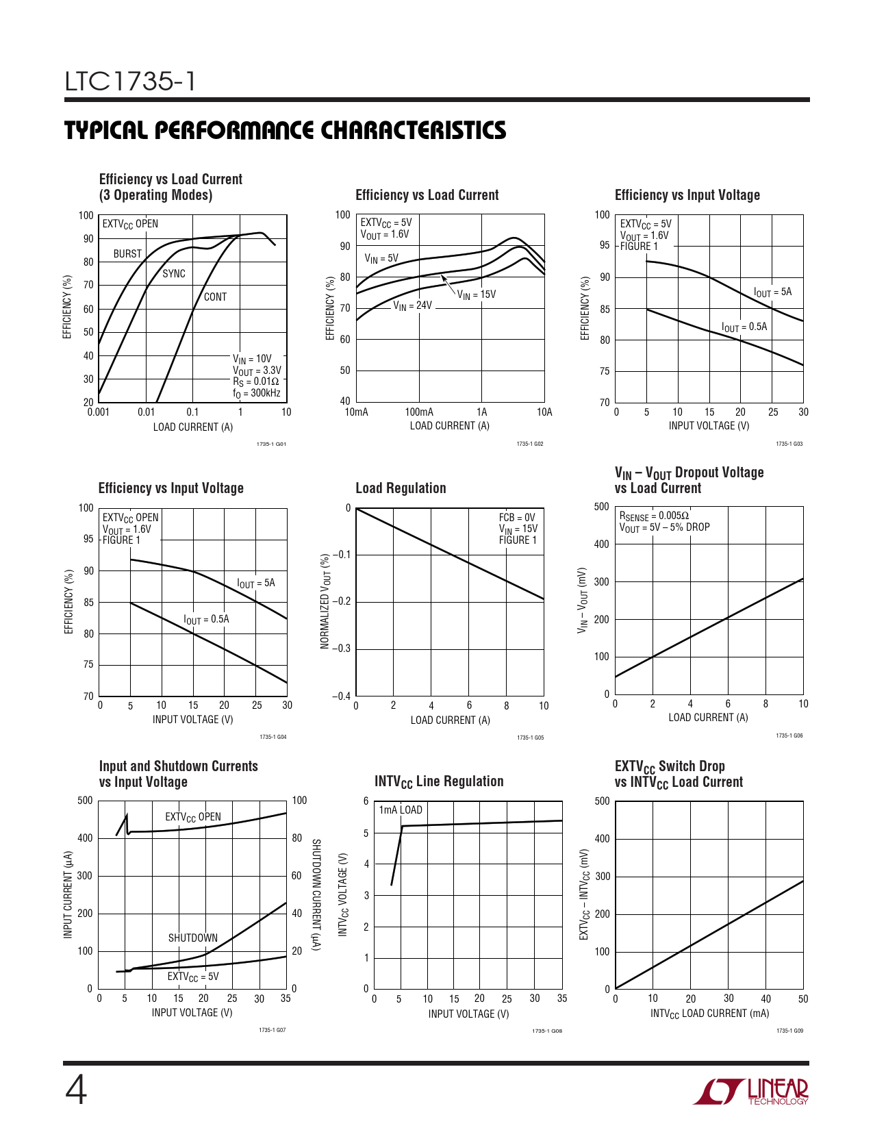 100 100 100 EXTVCC OPEN EXTVCC = 5V EXTVCC = 5V 90 VOUT = 1.6V VOUT = 1.6V 90 95 FIGURE 1 BURST 80 VIN = 5V SYNC 80 90 70 I CONT VIN = 15V OUT = 5A 60 70 VIN = 24V 85 IOUT = 0.5A EFFICIENCY (%) 50 EFFICIENCY (%) 60 EFFICIENCY (%) 80 40 VIN = 10V VOUT = 3.3V 50 75 30 RS = 0.01Ω fO = 300kHz 20 40 70 0.001 0.01 0.1 1 10 10mA 100mA 1A 10A 0 5 10 15 20 25 30 LOAD CURRENT (A) LOAD CURRENT (A) INPUT VOLTAGE (V) 1735-1 G01 1735-1 G02 1735-1 G03