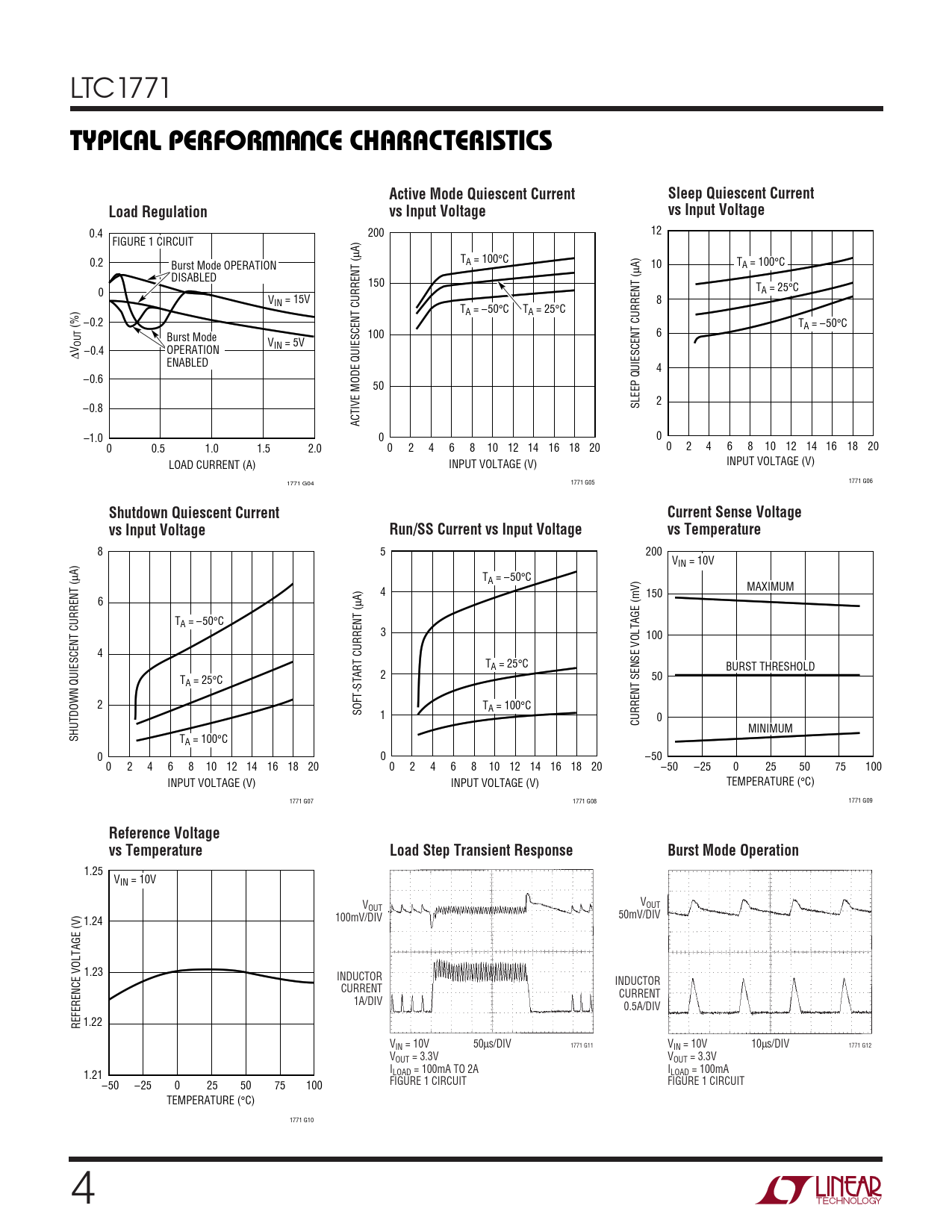 0.4 200 12 FIGURE 1 CIRCUIT µA) 0.2 T Burst Mode OPERATION A = 100°C µA) 10 TA = 100°C DISABLED 150 0 TA = 25°C VIN = 15V 8 TA = –50°C TA = 25°C –0.2 (%) TA = –50°C Burst Mode 100 6 OUT VIN = 5V –0.4 ∆V OPERATION ENABLED 4 –0.6 50 2 –0.8 SLEEP QUIESCENT CURRENT ( ACTIVE MODE QUIESCENT CURRENT ( –1.0 0 0 0 0.5 1.0 1.5 2.0 0 2 4 6 8 10 12 14 16 18 20 0 2 4 6 8 10 12 14 16 18 20 LOAD CURRENT (A) INPUT VOLTAGE (V) INPUT VOLTAGE (V) 1771 G04 1771 G05 1771 G06
