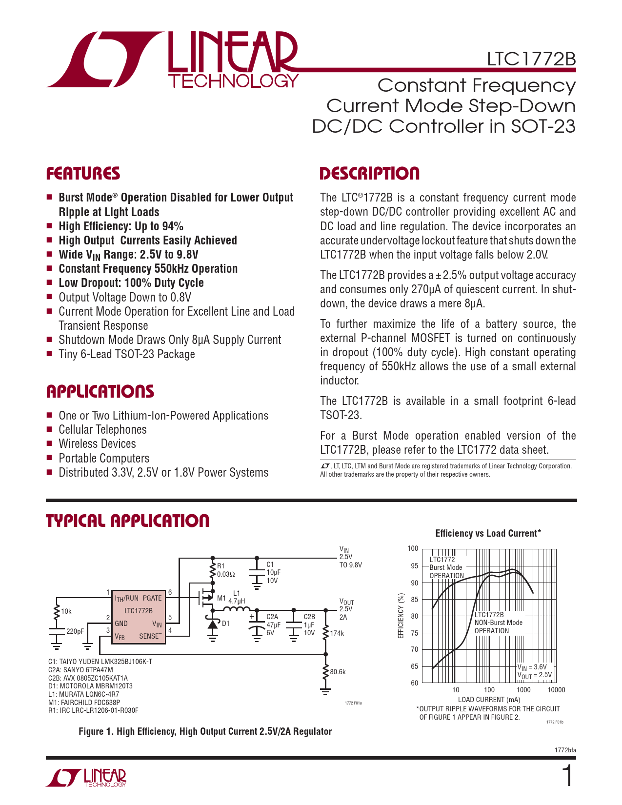 LTC1772B Constant Frequency Current Mode Step-Down DC/DC Controller in SOT-23 FEATURESDESCRIPTION n Burst Mode® Operation Disabled for Lower Output The LTC®1772B is a constant frequency current mode Ripple at Light Loads step-down DC/DC controller providing excellent AC and n High Effi ciency: Up to 94% DC load and line regulation. The device incorporates an n High Output Currents Easily Achieved accurate undervoltage lockout feature that shuts down the n Wide VIN Range: 2.5V to 9.8V LTC1772B when the input voltage falls below 2.0V. n Constant Frequency 550kHz Operation The LTC1772B provides a ± 2.5% output voltage accuracy n Low Dropout: 100% Duty Cycle and consumes only 270μA of quiescent current. In shut- n Output Voltage Down to 0.8V down, the device draws a mere 8μA. n Current Mode Operation for Excellent Line and Load Transient Response To further maximize the life of a battery source, the n Shutdown Mode Draws Only 8µA Supply Current external P-channel MOSFET is turned on continuously n Tiny 6-Lead TSOT-23 Package in dropout (100% duty cycle). High constant operating frequency of 550kHz allows the use of a small external inductor. APPLICATIONS The LTC1772B is available in a small footprint 6-lead n One or Two Lithium-Ion-Powered Applications TSOT-23. n Cellular Telephones For a Burst Mode operation enabled version of the n Wireless Devices LTC1772B, please refer to the LTC1772 data sheet. n Portable Computers L, LT, LTC, LTM and Burst Mode are registered trademarks of Linear Technology Corporation. n Distributed 3.3V, 2.5V or 1.8V Power Systems All other trademarks are the property of their respective owners. TYPICAL APPLICATIONEffi ciency vs Load Current* VIN 100 2.5V LTC1772 R1 C1 TO 9.8V 95 Burst Mode 0.03Ω 10μF OPERATION 10V 90 1 6 L1 ITH/RUN PGATE M1 4.7μH V 85 OUT 10k LTC1772B 2.5V 2 5 + C2A C2B 2A 80 LTC1772B GND VIN D1 47μF 1μF NON-Burst Mode 220pF 3 4 6V 10V 174k OPERATION V 75 FB SENSE– EFFICIENCY (%) 70 C1: TAIYO YUDEN LMK325BJ106K-T 65 C2A: SANYO 6TPA47M V 80.6k IN = 3.6V C2B: AVX 0805ZC105KAT1A VOUT = 2.5V D1: MOTOROLA MBRM120T3 60 10 100 1000 10000 L1: MURATA LQN6C-4R7 M1: FAIRCHILD FDC638P LOAD CURRENT (mA) 1772 F01a R1: IRC LRC-LR1206-01-R030F *OUTPUT RIPPLE WAVEFORMS FOR THE CIRCUIT OF FIGURE 1 APPEAR IN FIGURE 2. 1772 F01b Figure 1. High Effi ciency, High Output Current 2.5V/2A Regulator 1772bfa 1