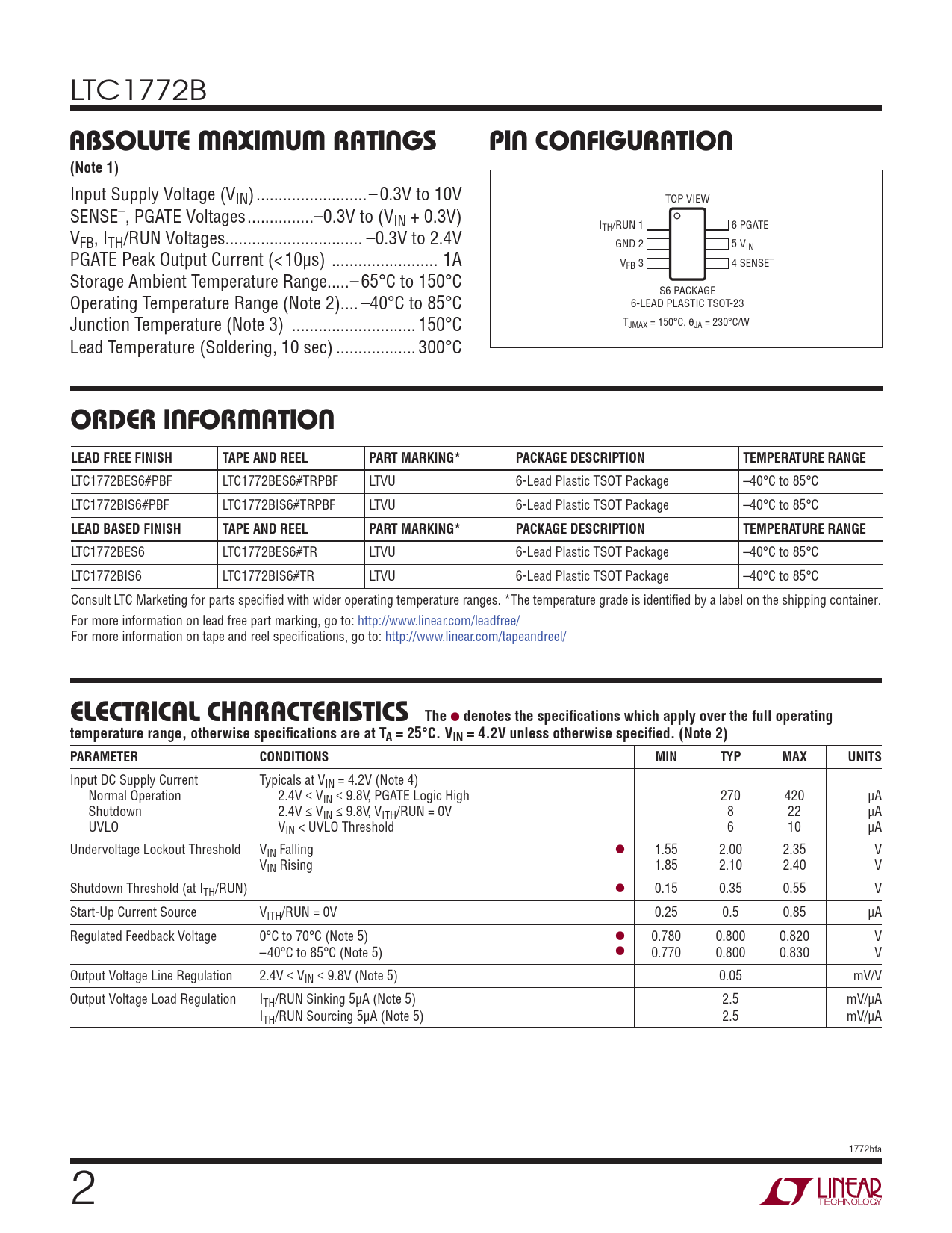 LTC1772BES6#PBF LTC1772BES6#TRPBF LTVU 6-Lead Plastic TSOT Package –40°C to 85°C LTC1772BIS6#PBF LTC1772BIS6#TRPBF LTVU 6-Lead Plastic TSOT Package –40°C to 85°C