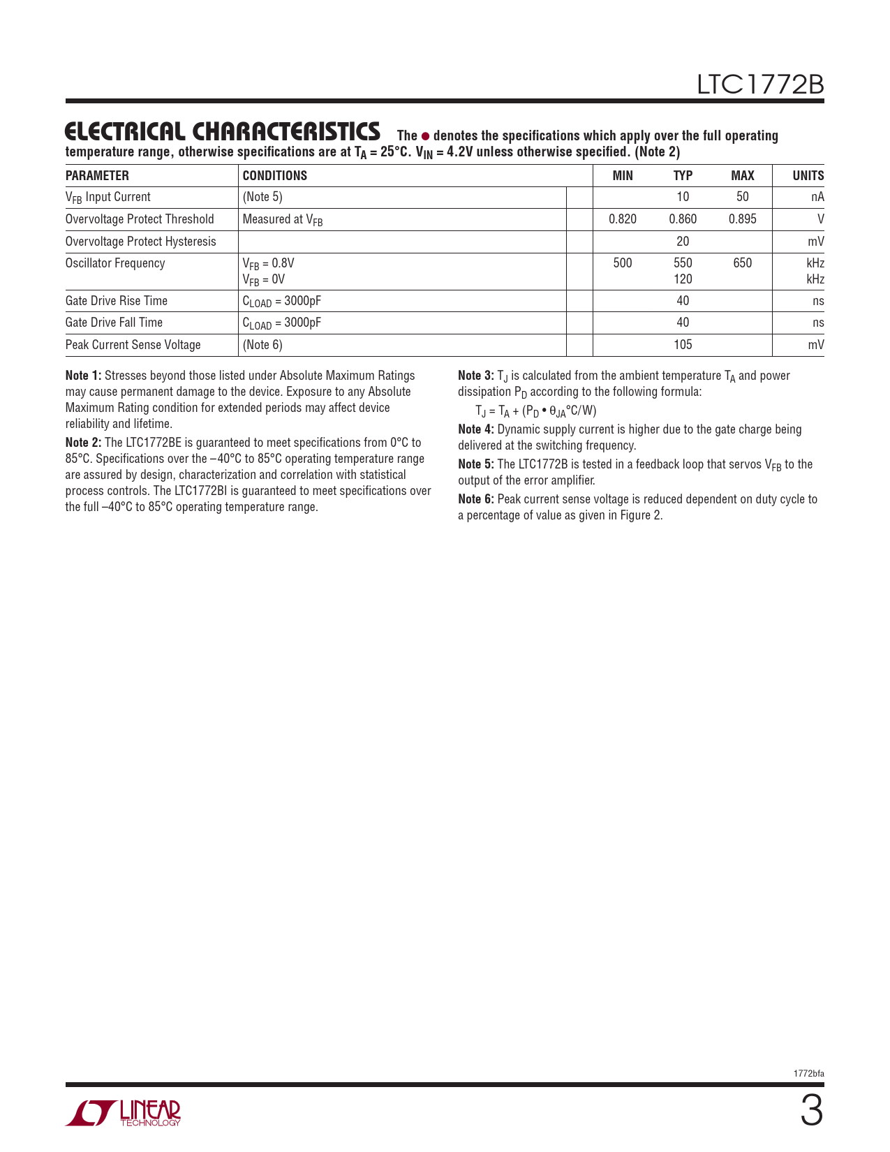The LTC1772B is tested in a feedback loop that servos VFB to the are assured by design, characterization and correlation with statistical output of the error amplifi er. process controls. The LTC1772BI is guaranteed to meet specifi cations over