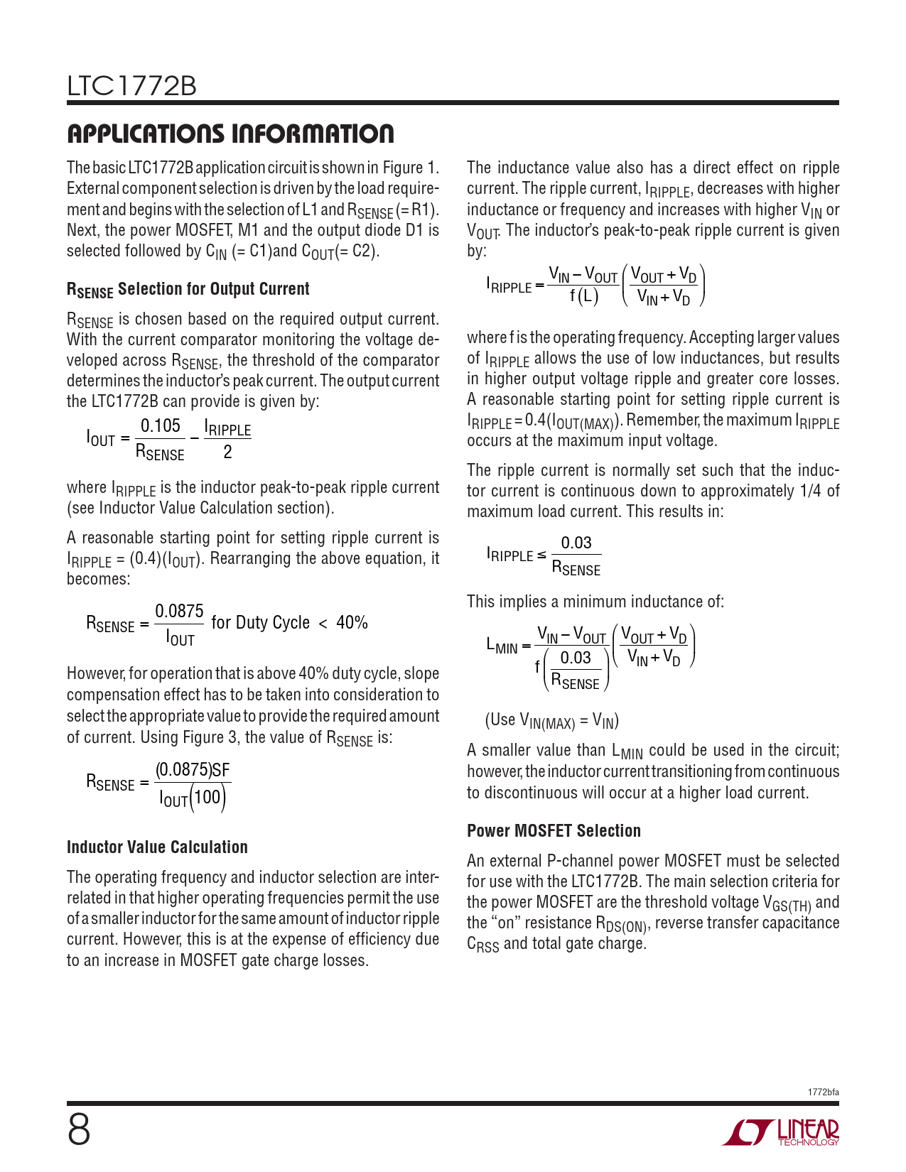 RIPPLE = f L ( ) V IN + VD RSENSE is chosen based on the required output current. With the current comparator monitoring the voltage de- where f is the operating frequency. Accepting larger values veloped across RSENSE, the threshold of the comparator of IRIPPLE allows the use of low inductances, but results determines the inductor’s peak current. The output current in higher output voltage ripple and greater core losses. the LTC1772B can provide is given by: A reasonable starting point for setting ripple current is 0 105 . I IRIPPLE = 0.4(IOUT(MAX)). Remember, the maximum IRIPPLE I RIPPLE OUT = − occurs at the maximum input voltage. RSENSE 2 The ripple current is normally set such that the induc- where IRIPPLE is the inductor peak-to-peak ripple current tor current is continuous down to approximately 1/4 of (see Inductor Value Calculation section). maximum load current. This results in: A reasonable starting point for setting ripple current is 0 0 . 3 I I ≤ RIPPLE = (0.4)(IOUT). Rearranging the above equation, it RIPPLE RSENSE becomes: This implies a minimum inductance of: 0 0875 . RSENSE = for Duty Cycle < 40% V V IOUT L IN VOUT OUT + VD MIN = 0.03 V IN + VD However, for operation that is above 40% duty cycle, slope f R SENSE compensation effect has to be taken into consideration to select the appropriate value to provide the required amount (Use VIN(MAX) = VIN) of current. Using Figure 3, the value of RSENSE is: A smaller value than LMIN could be used in the circuit; ( . 0 0875 SF ) however, the inductor current transitioning from continuous RSENSE = I ( ) 100 to discontinuous will occur at a higher load current. OUT