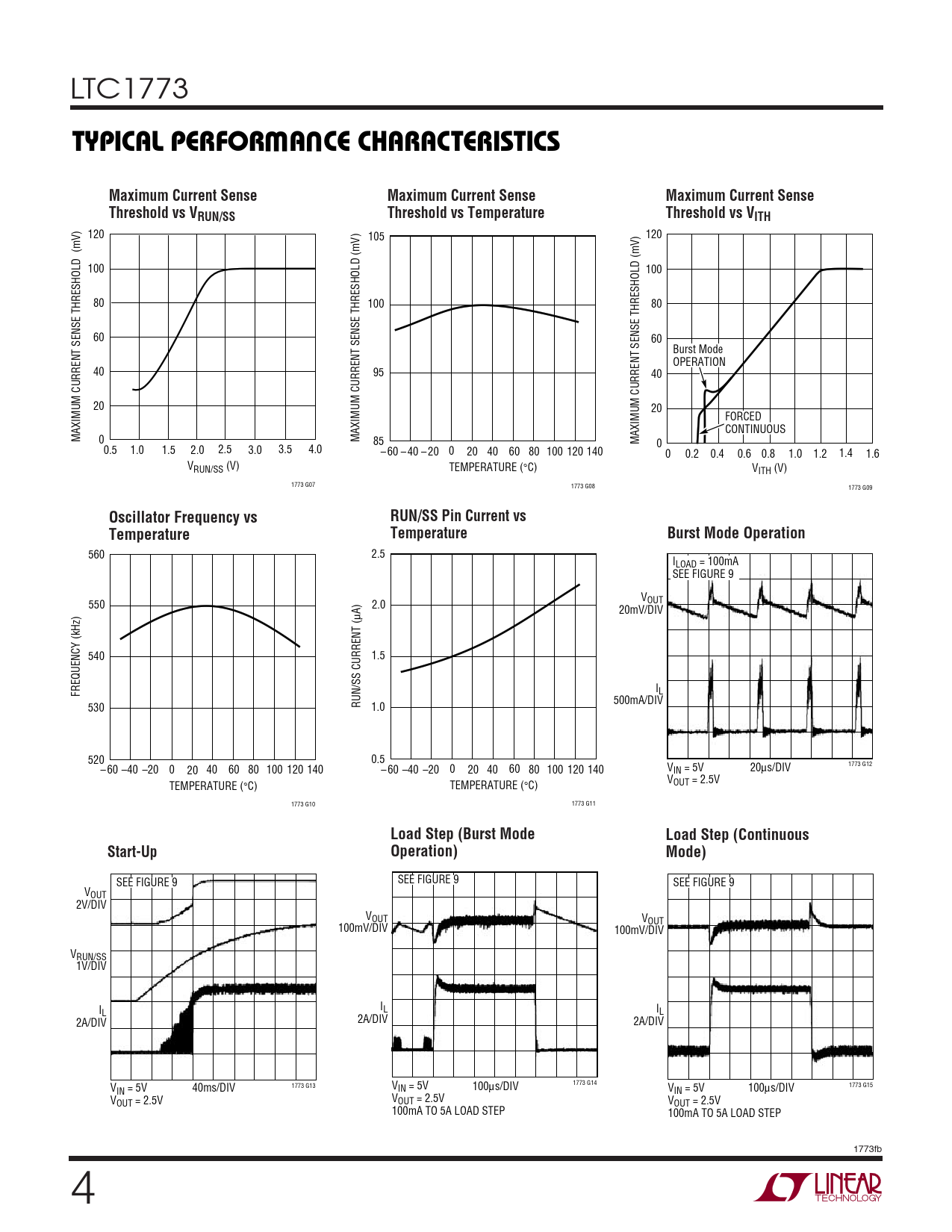 120 105 120 100 100 80 100 80 60 60 Burst Mode OPERATION 40 95 40 20 20 FORCED CONTINUOUS MAXIMUM CURRENT SENSE THRESHOLD (mV) 0 MAXIMUM CURRENT SENSE THRESHOLD (mV) 85 MAXIMUM CURRENT SENSE THRESHOLD (mV) 0 0.5 1.0 1.5 2.0 2.5 3.0 3.5 4.0 – 60 – 40 – 20 0 20 40 60 80 100 120 140 0 0.2 0.4 0.6 0.8 1.0 1.2 1.4 1.6 VRUN/SS (V) TEMPERATURE (°C) VITH (V) 1773 G07 1773 G08 1773 G09