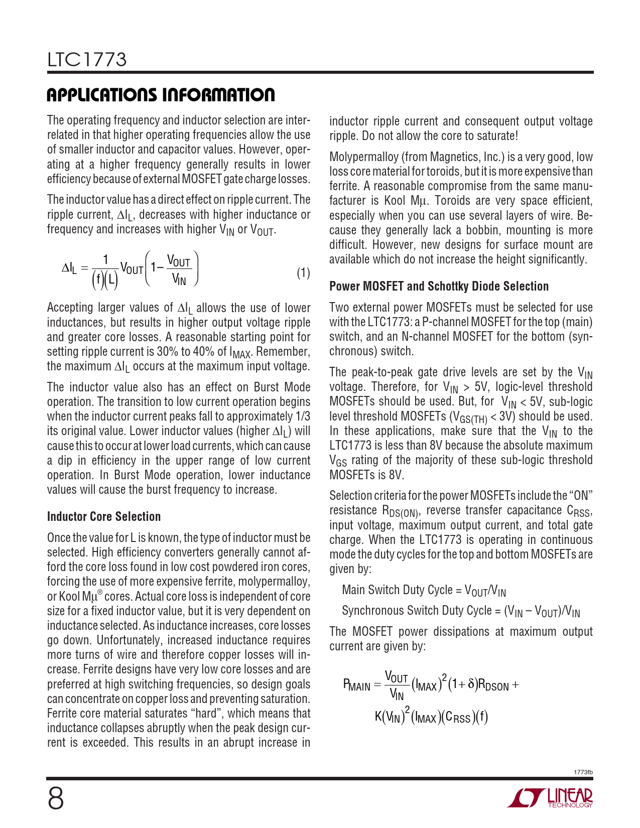 Accepting larger values of ∆I Two external power MOSFETs must be selected for use L allows the use of lower inductances, but results in higher output voltage ripple with the LTC1773: a P-channel MOSFET for the top (main) and greater core losses. A reasonable starting point for switch, and an N-channel MOSFET for the bottom (syn- setting ripple current is 30% to 40% of I chronous) switch. MAX. Remember, the maximum ∆IL occurs at the maximum input voltage. The peak-to-peak gate drive levels are set by the VIN The inductor value also has an effect on Burst Mode voltage. Therefore, for VIN > 5V, logic-level threshold operation. The transition to low current operation begins MOSFETs should be used. But, for VIN < 5V, sub-logic when the inductor current peaks fall to approximately 1/3 level threshold MOSFETs (VGS(TH) < 3V) should be used. its original value. Lower inductor values (higher ∆I In these applications, make sure that the V L) will IN to the cause this to occur at lower load currents, which can cause LTC1773 is less than 8V because the absolute maximum a dip in efficiency in the upper range of low current VGS rating of the majority of these sub-logic threshold operation. In Burst Mode operation, lower inductance MOSFETs is 8V. values will cause the burst frequency to increase. Selection criteria for the power MOSFETs include the “ON” resistance RDS(ON), reverse transfer capacitance CRSS,