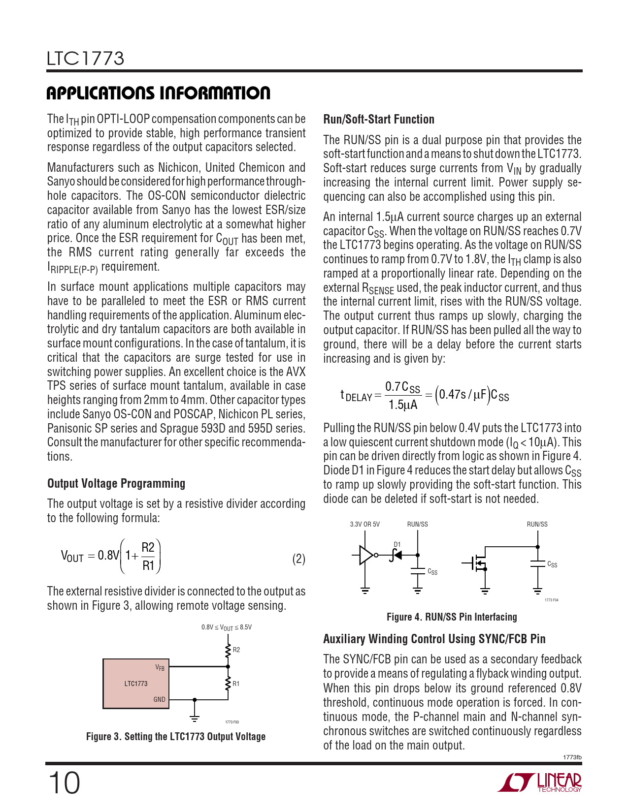 LTC1773 UUWUAPPLICATIONS INFORMATION The ITH pin OPTI-LOOP compensation components can be Run/Soft-Start Function optimized to provide stable, high performance transient The RUN/SS pin is a dual purpose pin that provides the response regardless of the output capacitors selected. soft-start function and a means to shut down the LTC1773. Manufacturers such as Nichicon, United Chemicon and Soft-start reduces surge currents from VIN by gradually Sanyo should be considered for high performance through- increasing the internal current limit. Power supply se- hole capacitors. The OS-CON semiconductor dielectric quencing can also be accomplished using this pin. capacitor available from Sanyo has the lowest ESR/size An internal 1.5µA current source charges up an external ratio of any aluminum electrolytic at a somewhat higher capacitor C price. Once the ESR requirement for C SS. When the voltage on RUN/SS reaches 0.7V OUT has been met, the LTC1773 begins operating. As the voltage on RUN/SS the RMS current rating generally far exceeds the continues to ramp from 0.7V to 1.8V, the I I TH clamp is also RIPPLE(P-P) requirement. ramped at a proportionally linear rate. Depending on the In surface mount applications multiple capacitors may external RSENSE used, the peak inductor current, and thus have to be paralleled to meet the ESR or RMS current the internal current limit, rises with the RUN/SS voltage. handling requirements of the application. Aluminum elec- The output current thus ramps up slowly, charging the trolytic and dry tantalum capacitors are both available in output capacitor. If RUN/SS has been pulled all the way to surface mount configurations. In the case of tantalum, it is ground, there will be a delay before the current starts critical that the capacitors are surge tested for use in increasing and is given by: switching power supplies. An excellent choice is the AVX TPS series of surface mount tantalum, available in case 0 7 . CSS = = (0 4.7 /µ ) heights ranging from 2mm to 4mm. Other capacitor types t s F C DELAY SS 1 5 . A µ include Sanyo OS-CON and POSCAP, Nichicon PL series, Panisonic SP series and Sprague 593D and 595D series. Pulling the RUN/SS pin below 0.4V puts the LTC1773 into Consult the manufacturer for other specific recommenda- a low quiescent current shutdown mode (IQ < 10µA). This tions. pin can be driven directly from logic as shown in Figure 4. Diode D1 in Figure 4 reduces the start delay but allows CSS Output Voltage Programming to ramp up slowly providing the soft-start function. This The output voltage is set by a resistive divider according diode can be deleted if soft-start is not needed. to the following formula: 3.3V OR 5V RUN/SS RUN/SS ⎛ R2⎞ D1 V 0. V OUT = 8 1+ ⎝⎜ (2) R ⎠⎟ 1 CSS CSS The external resistive divider is connected to the output as 1773 F04 shown in Figure 3, allowing remote voltage sensing. Figure 4. RUN/SS Pin Interfacing 0.8V ≤ VOUT ≤ 8.5V Auxiliary Winding Control Using SYNC/FCB Pin R2 The SYNC/FCB pin can be used as a secondary feedback VFB to provide a means of regulating a flyback winding output. LTC1773 R1 When this pin drops below its ground referenced 0.8V GND threshold, continuous mode operation is forced. In con- tinuous mode, the P-channel main and N-channel syn- 1773 F03 chronous switches are switched continuously regardless Figure 3. Setting the LTC1773 Output Voltage of the load on the main output. 1773fb 10