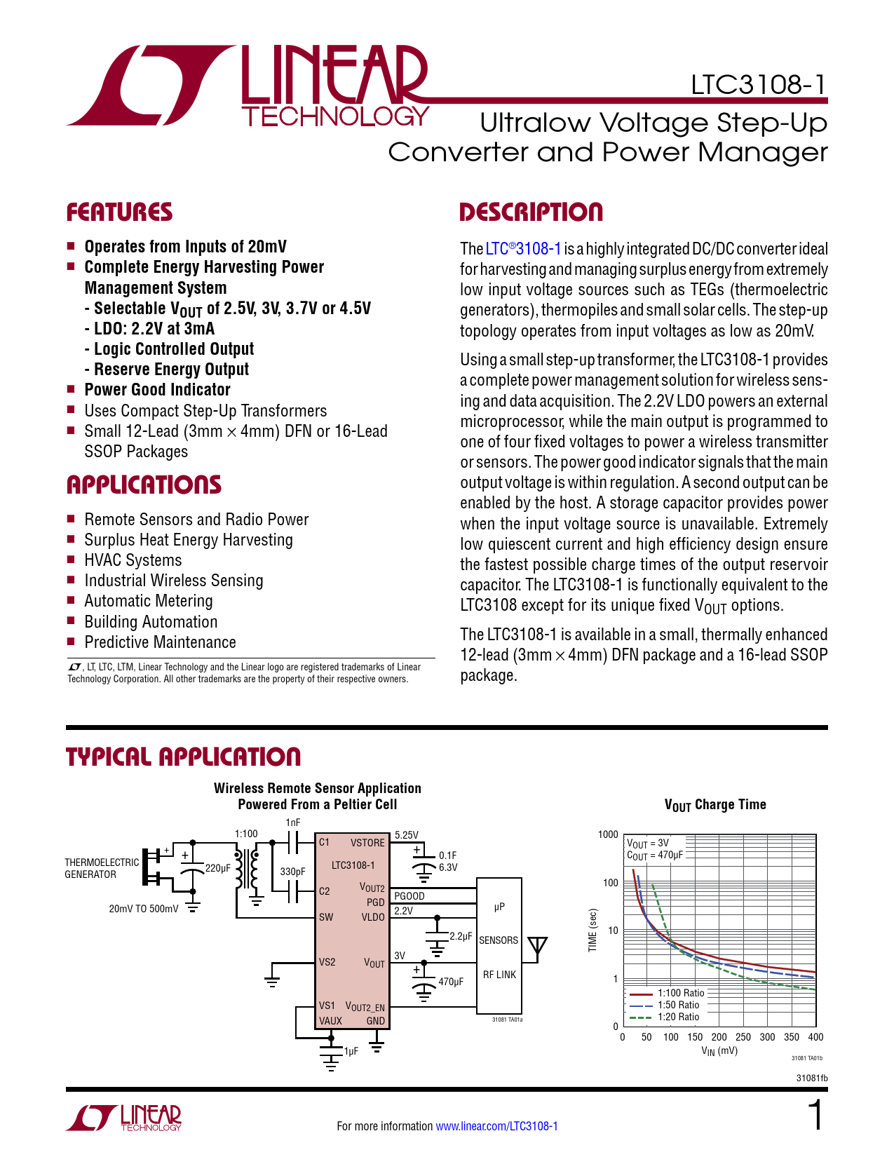 LTC3108-1 Ultralow Voltage Step-Up Converter and Power Manager FeaTuresDescripTion n Operates from Inputs of 20mV The LTC®3108-1 is a highly integrated DC/DC converter ideal n Complete Energy Harvesting Power for harvesting and managing surplus energy from extremely Management System low input voltage sources such as TEGs (thermoelectric - Selectable VOUT of 2.5V, 3V, 3.7V or 4.5V generators), thermopiles and small solar cells. The step-up - LDO: 2.2V at 3mA topology operates from input voltages as low as 20mV. - Logic Controlled Output Using a small step-up transformer, the LTC3108-1 provides - Reserve Energy Output a complete power management solution for wireless sens- n Power Good Indicator ing and data acquisition. The 2.2V LDO powers an external n Uses Compact Step-Up Transformers microprocessor, while the main output is programmed to n Small 12-Lead (3mm × 4mm) DFN or 16-Lead one of four fixed voltages to power a wireless transmitter SSOP Packages or sensors. The power good indicator signals that the main output voltage is within regulation. A second output can be applicaTions enabled by the host. A storage capacitor provides power n Remote Sensors and Radio Power when the input voltage source is unavailable. Extremely n Surplus Heat Energy Harvesting low quiescent current and high efficiency design ensure n HVAC Systems the fastest possible charge times of the output reservoir n Industrial Wireless Sensing capacitor. The LTC3108-1 is functionally equivalent to the n Automatic Metering LTC3108 except for its unique fixed VOUT options. n Building Automation n The LTC3108-1 is available in a small, thermally enhanced Predictive Maintenance 12-lead (3mm × 4mm) DFN package and a 16-lead SSOP L, LT, LTC, LTM, Linear Technology and the Linear logo are registered trademarks of Linear Technology Corporation. All other trademarks are the property of their respective owners. package. Typical applicaTionWireless Remote Sensor ApplicationPowered From a Peltier CellVOUT Charge Time 1nF 1:100 5.25V 1000 C1 VSTORE V + + + OUT = 3V 0.1F C THERMOELECTRIC OUT = 470µF LTC3108-1 220µF 6.3V GENERATOR 330pF 100 C2 VOUT2 PGOOD 20mV TO 500mV PGD 2.2V µP SW VLDO 2.2µF 10 SENSORS TIME (sec) VS2 V 3V OUT + RF LINK 470µF 1 1:100 Ratio VS1 VOUT2_EN 1:50 Ratio 31081 TA01a VAUX GND 1:20 Ratio 0 0 50 100 150 200 250 300 350 400 1µF VIN (mV) 31081 TA01b 31081fb For more information www.linear.com/LTC3108-1 1 Document Outline Features Applications Description Typical Application Absolute Maximum Ratings Pin Configuration order information Electrical Characteristics Typical Performance Characteristics Pin Functions Block Diagram Operation Applications Information Typical Applications Typical Application Related Parts