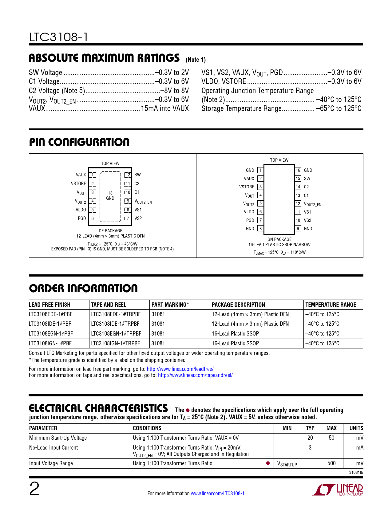 LTC3108-1 absoluTe MaxiMuM raTings (Note 1) SW Voltage ..–0.3V to 2V VS1, VS2, VAUX, VOUT, PGD ..–0.3V to 6V C1 Voltage ..–0.3V to 6V VLDO, VSTORE ..–0.3V to 6V C2 Voltage (Note 5) ...–8V to 8V Operating Junction Temperature Range VOUT2, VOUT2_EN ...–0.3V to 6V (Note 2) ... –40°C to 125°C VAUX ..15mA into VAUX Storage Temperature Range .. –65°C to 125°C pin conFiguraTion TOP VIEW TOP VIEW GND 1 16 GND VAUX 1 12 SW VAUX 2 15 SW VSTORE 2 11 C2 VSTORE 3 14 C2 VOUT 3 13 10 C1 VOUT 4 GND 13 C1 VOUT2 4 9 VOUT2_EN VOUT2 5 12 VOUT2_EN VLDO 5 8 VS1 VLDO 6 11 VS1 PGD 6 7 VS2 PGD 7 10 VS2 DE PACKAGE GND 8 9 GND 12-LEAD (4mm × 3mm) PLASTIC DFN GN PACKAGE TJMAX = 125°C, θJA = 43°C/W 16-LEAD PLASTIC SSOP NARROW EXPOSED PAD (PIN 13) IS GND, MUST BE SOLDERED TO PCB (NOTE 4) TJMAX = 125°C, θJA = 110°C/W orDer inForMaTion LEAD FREE FINISHTAPE AND REELPART MARKING*PACKAGE DESCRIPTIONTEMPERATURE RANGE LTC3108EDE-1#PBF LTC3108EDE-1#TRPBF 31081 12-Lead (4mm × 3mm) Plastic DFN –40°C to 125°C LTC3108IDE-1#PBF LTC3108IDE-1#TRPBF 31081 12-Lead (4mm × 3mm) Plastic DFN –40°C to 125°C LTC3108EGN-1#PBF LTC3108EGN-1#TRPBF 31081 16-Lead Plastic SSOP –40°C to 125°C LTC3108IGN-1#PBF LTC3108IGN-1#TRPBF 31081 16-Lead Plastic SSOP –40°C to 125°C Consult LTC Marketing for parts specified for other fixed output voltages or wider operating temperature ranges. *The temperature grade is identified by a label on the shipping container. For more information on lead free part marking, go to: http://www.linear.com/leadfree/ For more information on tape and reel specifications, go to: http://www.linear.com/tapeandreel/ elecTrical characTerisTicsThe l denotes the specifications which apply over the full operatingjunction temperature range, otherwise specifications are for TA = 25°C (Note 2). VAUX = 5V, unless otherwise noted. PARAMETERCONDITIONSMINTYPMAXUNITS Minimum Start-Up Voltage Using 1:100 Transformer Turns Ratio, VAUX = 0V 20 50 mV No-Load Input Current Using 1:100 Transformer Turns Ratio; VIN = 20mV, 3 mA VOUT2_EN = 0V; All Outputs Charged and in Regulation Input Voltage Range Using 1:100 Transformer Turns Ratio l VSTARTUP 500 mV 31081fb 2 For more information www.linear.com/LTC3108-1 Document Outline Features Applications Description Typical Application Absolute Maximum Ratings Pin Configuration order information Electrical Characteristics Typical Performance Characteristics Pin Functions Block Diagram Operation Applications Information Typical Applications Typical Application Related Parts