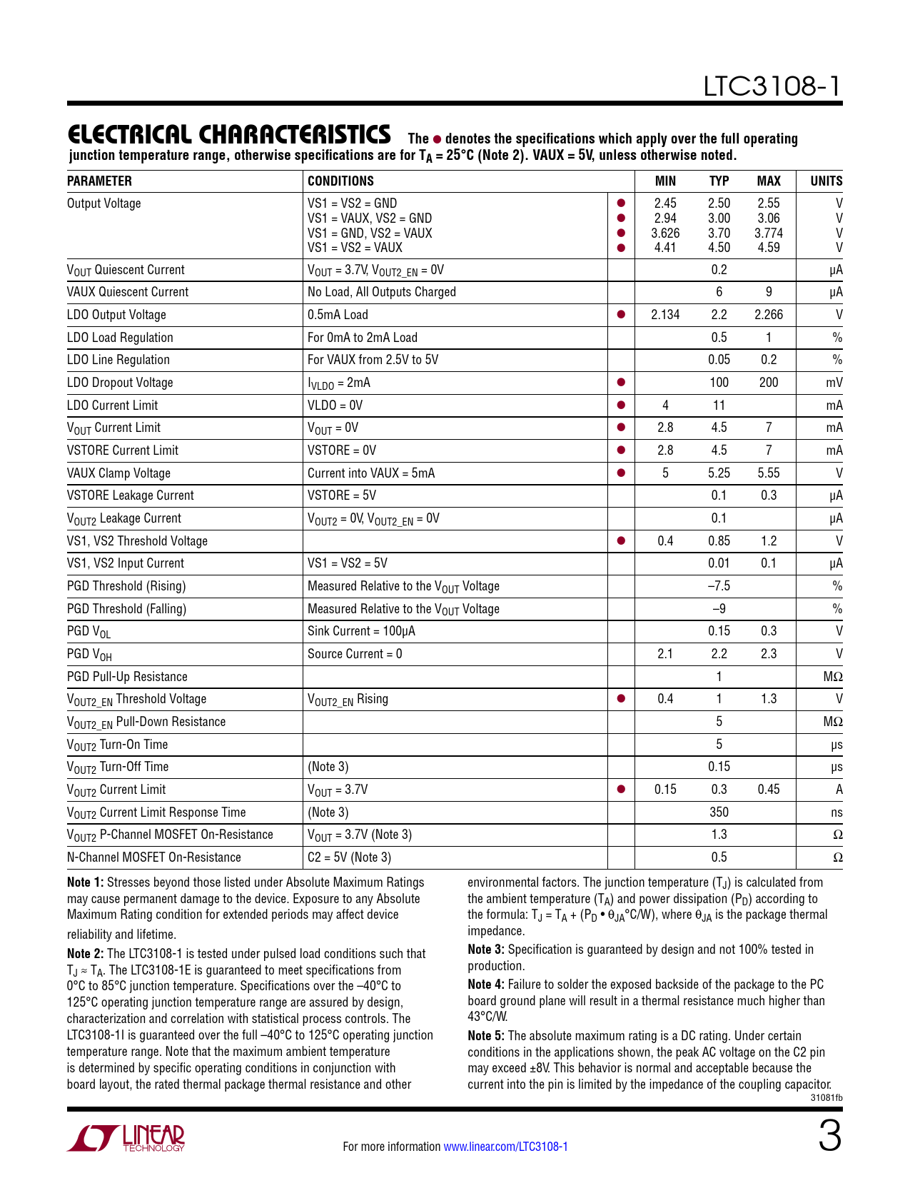 LTC3108-1 elecTrical characTerisTicsThe l denotes the specifications which apply over the full operatingjunction temperature range, otherwise specifications are for TA = 25°C (Note 2). VAUX = 5V, unless otherwise noted.PARAMETERCONDITIONSMINTYPMAXUNITS Output Voltage VS1 = VS2 = GND l 2.45 2.50 2.55 V VS1 = VAUX, VS2 = GND l 2.94 3.00 3.06 V VS1 = GND, VS2 = VAUX l 3.626 3.70 3.774 V VS1 = VS2 = VAUX l 4.41 4.50 4.59 V VOUT Quiescent Current VOUT = 3.7V, VOUT2_EN = 0V 0.2 µA VAUX Quiescent Current No Load, All Outputs Charged 6 9 µA LDO Output Voltage 0.5mA Load l 2.134 2.2 2.266 V LDO Load Regulation For 0mA to 2mA Load 0.5 1 % LDO Line Regulation For VAUX from 2.5V to 5V 0.05 0.2 % LDO Dropout Voltage IVLDO = 2mA l 100 200 mV LDO Current Limit VLDO = 0V l 4 11 mA VOUT Current Limit VOUT = 0V l 2.8 4.5 7 mA VSTORE Current Limit VSTORE = 0V l 2.8 4.5 7 mA VAUX Clamp Voltage Current into VAUX = 5mA l 5 5.25 5.55 V VSTORE Leakage Current VSTORE = 5V 0.1 0.3 µA VOUT2 Leakage Current VOUT2 = 0V, VOUT2_EN = 0V 0.1 µA VS1, VS2 Threshold Voltage l 0.4 0.85 1.2 V VS1, VS2 Input Current VS1 = VS2 = 5V 0.01 0.1 µA PGD Threshold (Rising) Measured Relative to the VOUT Voltage –7.5 % PGD Threshold (Falling) Measured Relative to the VOUT Voltage –9 % PGD VOL Sink Current = 100µA 0.15 0.3 V PGD VOH Source Current = 0 2.1 2.2 2.3 V PGD Pull-Up Resistance 1 MΩ VOUT2_EN Threshold Voltage VOUT2_EN Rising l 0.4 1 1.3 V VOUT2_EN Pull-Down Resistance 5 MΩ VOUT2 Turn-On Time 5 µs VOUT2 Turn-Off Time (Note 3) 0.15 µs VOUT2 Current Limit VOUT = 3.7V l 0.15 0.3 0.45 A VOUT2 Current Limit Response Time (Note 3) 350 ns VOUT2 P-Channel MOSFET On-Resistance VOUT = 3.7V (Note 3) 1.3 Ω N-Channel MOSFET On-Resistance C2 = 5V (Note 3) 0.5 Ω Note 1: Stresses beyond those listed under Absolute Maximum Ratings environmental factors. The junction temperature (TJ) is calculated from may cause permanent damage to the device. Exposure to any Absolute the ambient temperature (TA) and power dissipation (PD) according to Maximum Rating condition for extended periods may affect device the formula: TJ = TA + (PD • θJA°C/W), where θJA is the package thermal reliability and lifetime. impedance. Note 2: The LTC3108-1 is tested under pulsed load conditions such that Note 3: Specification is guaranteed by design and not 100% tested in T production. J ≈ TA. The LTC3108-1E is guaranteed to meet specifications from 0°C to 85°C junction temperature. Specifications over the –40°C to Note 4: Failure to solder the exposed backside of the package to the PC 125°C operating junction temperature range are assured by design, board ground plane will result in a thermal resistance much higher than characterization and correlation with statistical process controls. The 43°C/W. LTC3108-1I is guaranteed over the full –40°C to 125°C operating junction Note 5: The absolute maximum rating is a DC rating. Under certain temperature range. Note that the maximum ambient temperature conditions in the applications shown, the peak AC voltage on the C2 pin is determined by specific operating conditions in conjunction with may exceed ±8V. This behavior is normal and acceptable because the board layout, the rated thermal package thermal resistance and other current into the pin is limited by the impedance of the coupling capacitor. 31081fb For more information www.linear.com/LTC3108-1 3 Document Outline Features Applications Description Typical Application Absolute Maximum Ratings Pin Configuration order information Electrical Characteristics Typical Performance Characteristics Pin Functions Block Diagram Operation Applications Information Typical Applications Typical Application Related Parts