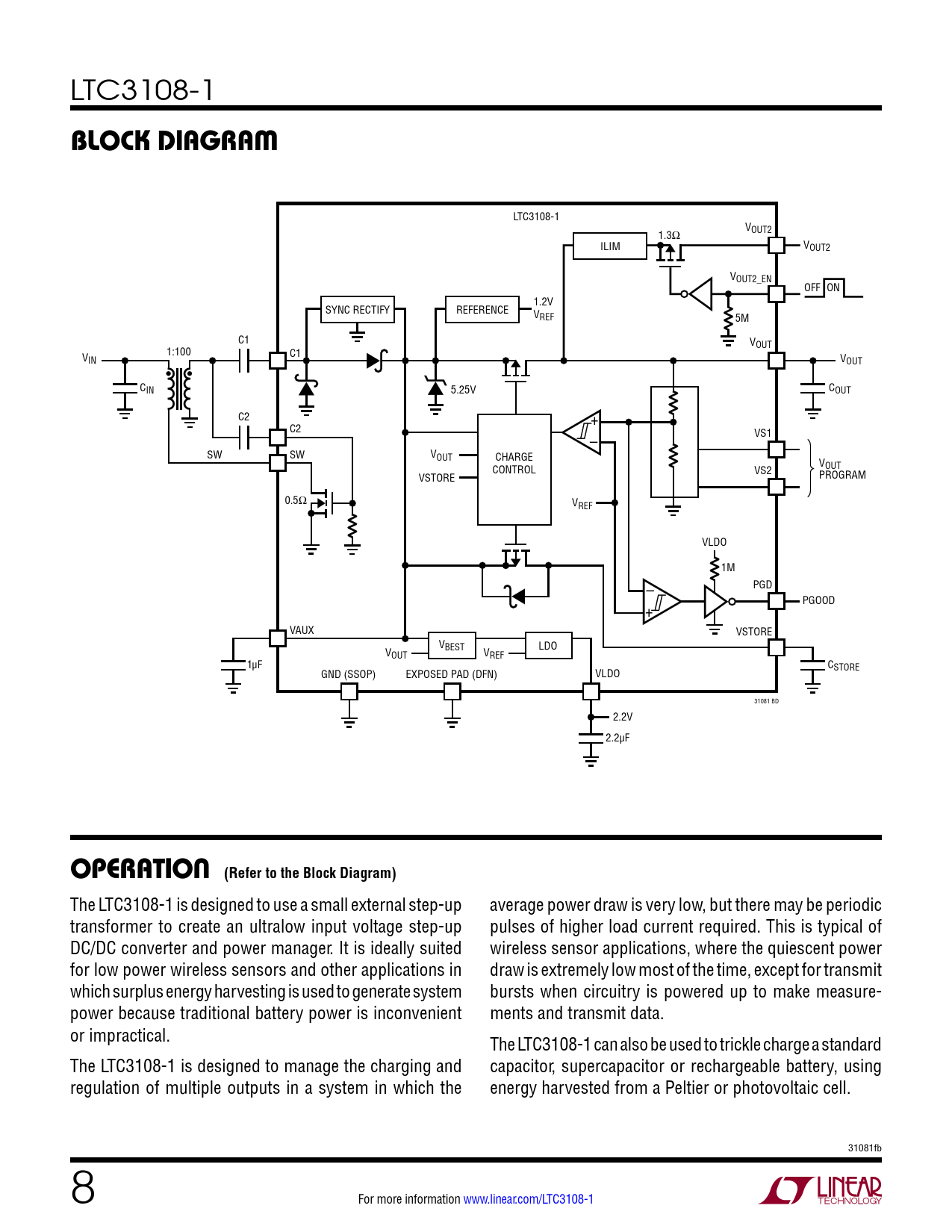 LTC3108-1 block DiagraM LTC3108-1 VOUT2 1.3Ω ILIM VOUT2 VOUT2_EN OFF ON 1.2V SYNC RECTIFY REFERENCE VREF 5M C1 VOUT 1:100 C1 VIN VOUT CIN 5.25V COUT C2 + C2 VS1 – SW SW V OUT CHARGE VOUT CONTROL VS2 VSTORE PROGRAM 0.5Ω VREF VLDO 1M PGD – PGOOD + VAUX VSTORE V V BEST LDO OUT VREF 1µF C GND (SSOP) EXPOSED PAD (DFN) VLDO STORE 31081 BD 2.2V 2.2µF operaTion (Refer to the Block Diagram) The LTC3108-1 is designed to use a small external step-up average power draw is very low, but there may be periodic transformer to create an ultralow input voltage step-up pulses of higher load current required. This is typical of DC/DC converter and power manager. It is ideally suited wireless sensor applications, where the quiescent power for low power wireless sensors and other applications in draw is extremely low most of the time, except for transmit which surplus energy harvesting is used to generate system bursts when circuitry is powered up to make measure- power because traditional battery power is inconvenient ments and transmit data. or impractical. The LTC3108-1 can also be used to trickle charge a standard The LTC3108-1 is designed to manage the charging and capacitor, supercapacitor or rechargeable battery, using regulation of multiple outputs in a system in which the energy harvested from a Peltier or photovoltaic cell. 31081fb 8 For more information www.linear.com/LTC3108-1 Document Outline Features Applications Description Typical Application Absolute Maximum Ratings Pin Configuration order information Electrical Characteristics Typical Performance Characteristics Pin Functions Block Diagram Operation Applications Information Typical Applications Typical Application Related Parts