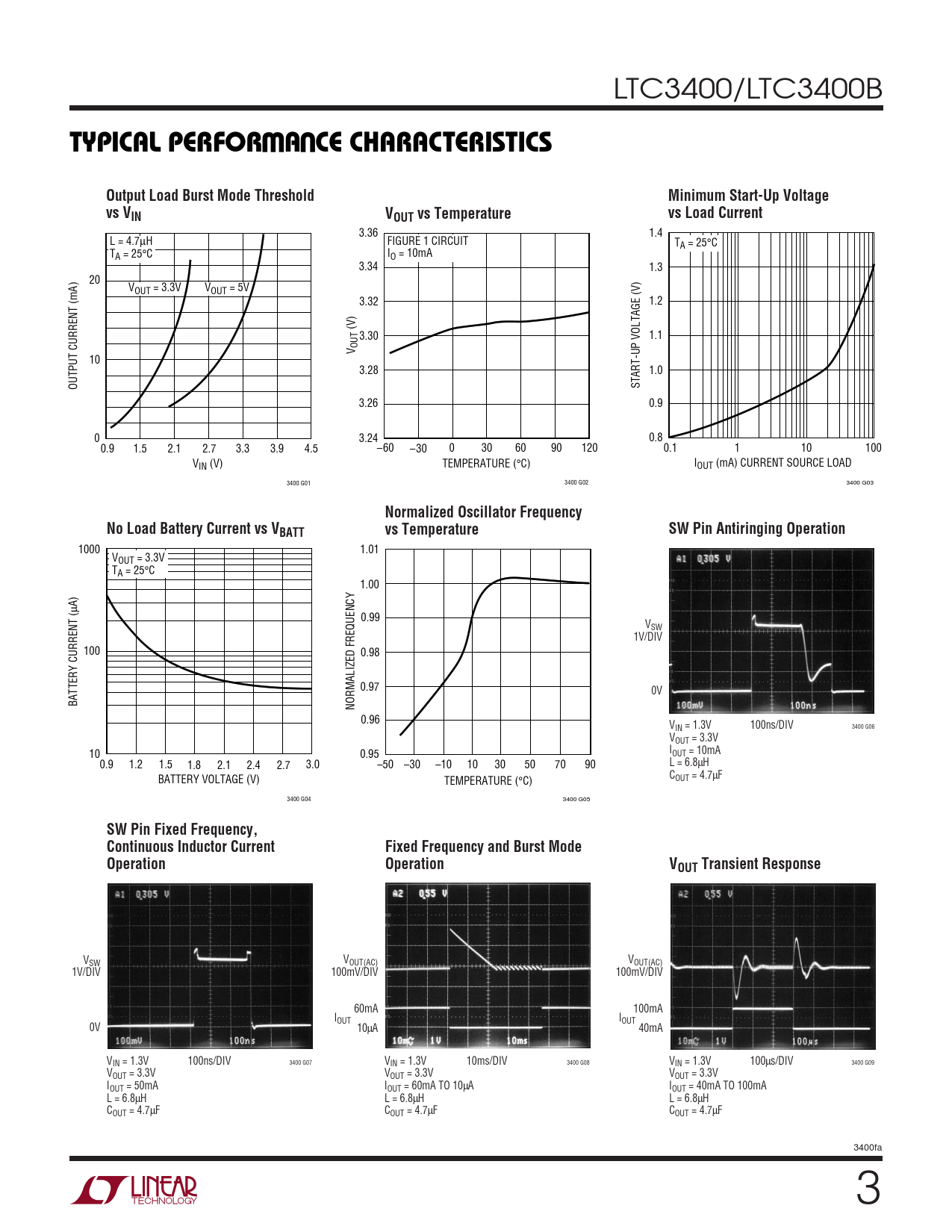 1000 1.01 VOUT = 3.3V TA = 25°C 1.00 µA) 0.99 VSW 1V/DIV 100 0.98 0.97 0V BATTERY CURRENT ( NORMALIZED FREQUENCY 0.96 VIN = 1.3V 100ns/DIV 3400 G06 VOUT = 3.3V 10 0.95 IOUT = 10mA 0.9 1.2 1.5 1.8 2.1 2.4 2.7 3.0 –50 –30 –10 10 30 50 70 90 L = 6.8µH BATTERY VOLTAGE (V) C TEMPERATURE (°C) OUT = 4.7µF 3400 G04 3400 G05