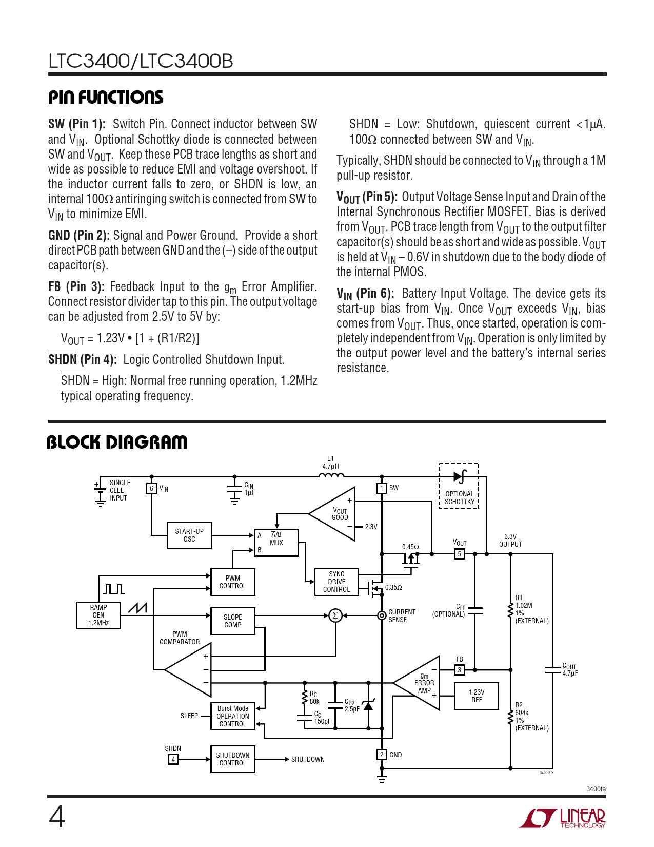 LTC3400/LTC3400B UUUPI FU CTIO SSW (Pin 1): Switch Pin. Connect inductor between SW SHDN = Low: Shutdown, quiescent current < 1µA. and VIN. Optional Schottky diode is connected between 100Ω connected between SW and VIN. SW and VOUT. Keep these PCB trace lengths as short and Typically, SHDN should be connected to V wide as possible to reduce EMI and voltage overshoot. If IN through a 1M pull-up resistor. the inductor current falls to zero, or SHDN is low, an internal 100Ω antiringing switch is connected from SW to VOUT (Pin 5): Output Voltage Sense Input and Drain of the V Internal Synchronous Rectifier MOSFET. Bias is derived IN to minimize EMI. from V GND (Pin 2): Signal and Power Ground. Provide a short OUT. PCB trace length from VOUT to the output filter capacitor(s) should be as short and wide as possible. V direct PCB path between GND and the (–) side of the output OUT is held at V capacitor(s). IN – 0.6V in shutdown due to the body diode of the internal PMOS. FB (Pin 3): Feedback Input to the gm Error Amplifier. V Connect resistor divider tap to this pin. The output voltage IN (Pin 6): Battery Input Voltage. The device gets its start-up bias from V can be adjusted from 2.5V to 5V by: IN. Once VOUT exceeds VIN, bias comes from VOUT. Thus, once started, operation is com- VOUT = 1.23V • [1 + (R1/R2)] pletely independent from VIN. Operation is only limited by the output power level and the battery’s internal series SHDN (Pin 4): Logic Controlled Shutdown Input. resistance. SHDN = High: Normal free running operation, 1.2MHz typical operating frequency. WBLOCK DIAGRA L1 4.7µH SINGLE + C 6 V IN CELL IN 1 SW 1µF OPTIONAL + INPUT SCHOTTKY VOUT GOOD – 2.3V START-UP A A/B OSC 3.3V MUX VOUT 0.45Ω OUTPUT B 5 SYNC PWM DRIVE CONTROL CONTROL 0.35Ω R1 RAMP C 1.02M FF CURRENT GEN (OPTIONAL) 1% SLOPE Σ SENSE 1.2MHz (EXTERNAL) COMP PWM COMPARATOR + FB – – C 3 OUT g – 4.7µF m ERROR AMP + 1.23V RC REF 80k CP2 R2 Burst Mode 2.5pF 604k SLEEP OPERATION CC 1% CONTROL 150pF (EXTERNAL) SHDN SHUTDOWN 2 GND 4 SHUTDOWN CONTROL 3400 BD 3400fa 4