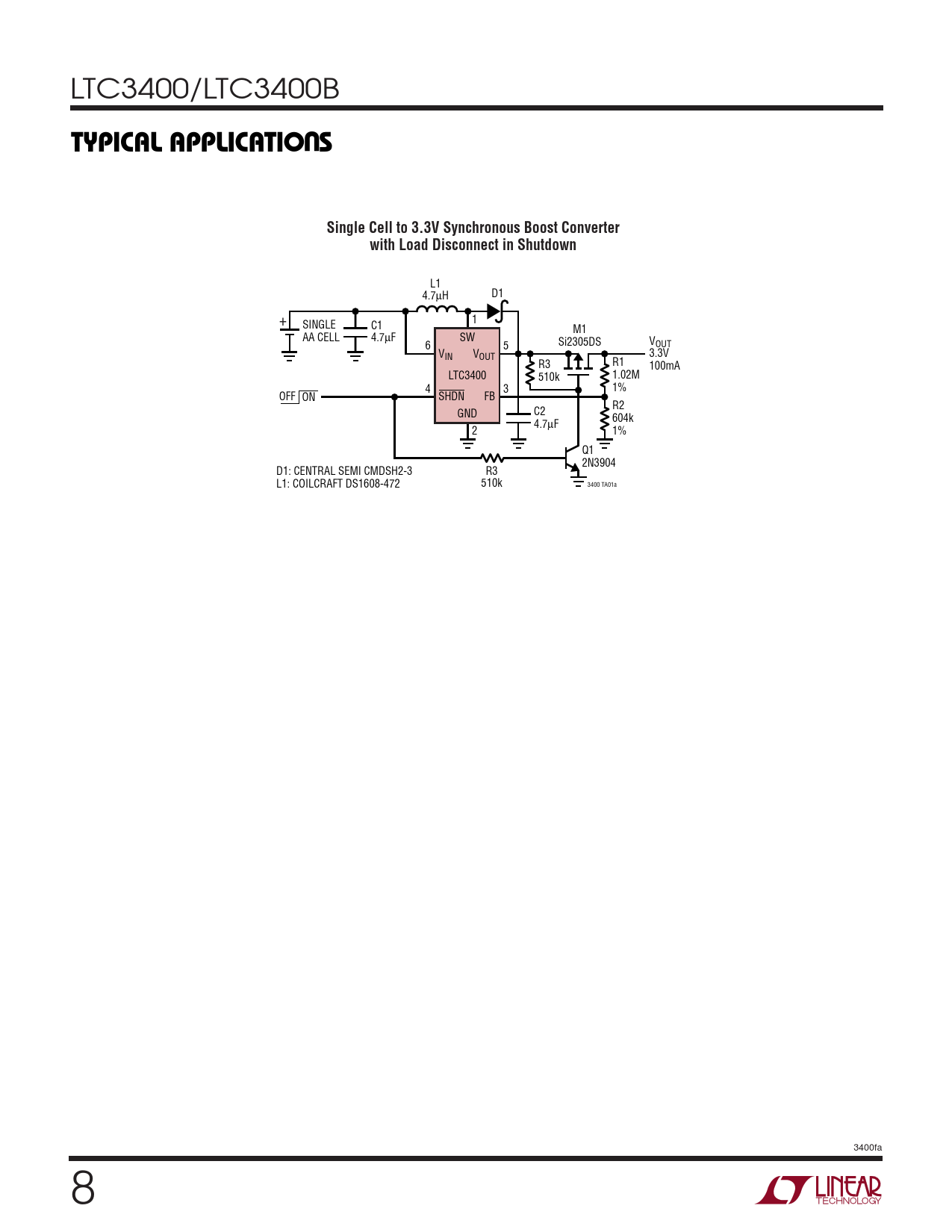 L1 4.7µH D1 1 + SINGLE C1 M1 AA CELL 4.7µF SW Si2305DS VOUT 6 5 V V IN OUT 3.3V R1 R3 100mA LTC3400 1.02M 510k 4 3 1% OFF ON SHDN FB R2 GND C2 604k 4.7µF 2 1% Q1 2N3904 D1: CENTRAL SEMI CMDSH2-3 R3 L1: COILCRAFT DS1608-472 510k 3400 TA01a 3400fa 8