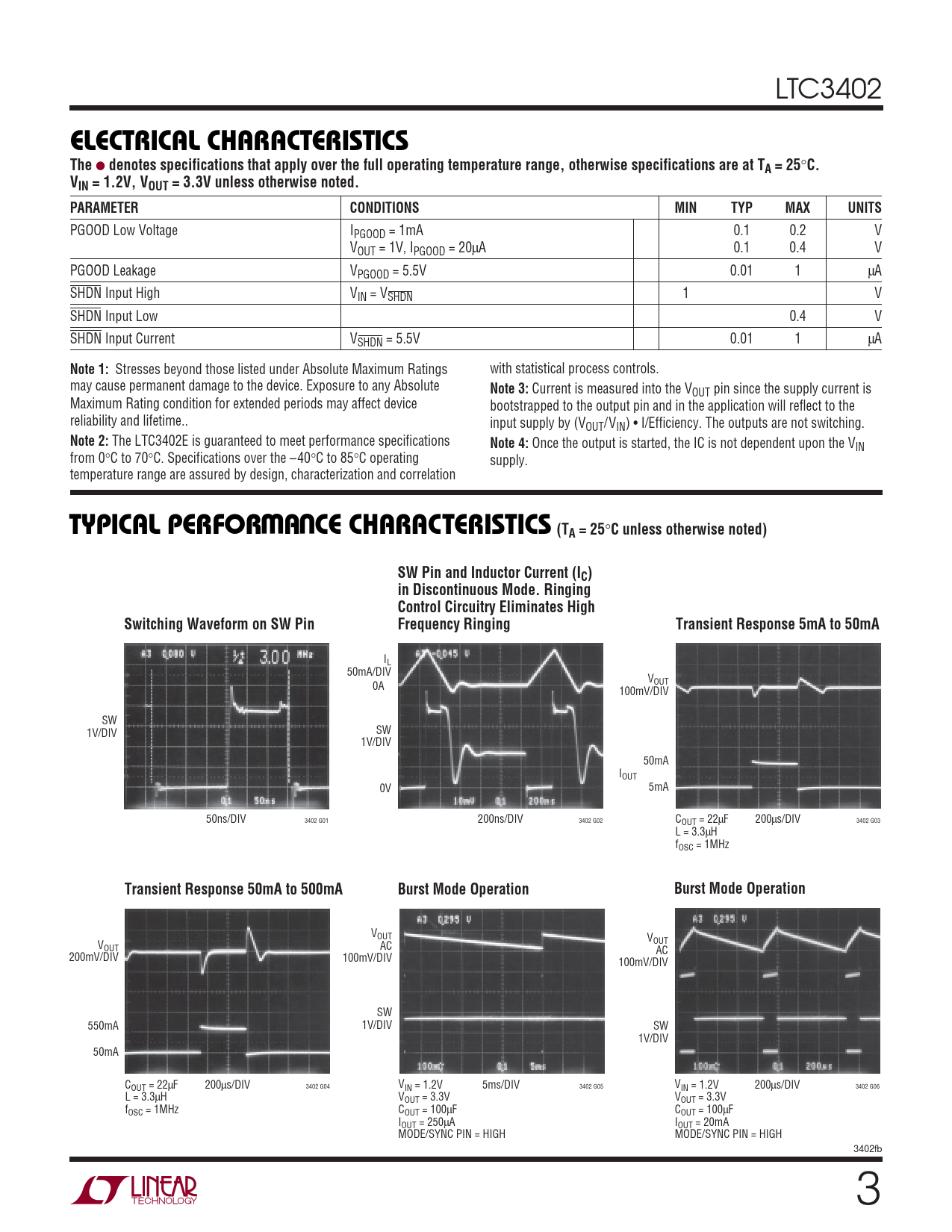 VOUT V V OUT OUT AC AC 200mV/DIV 100mV/DIV 100mV/DIV SW 550mA 1V/DIV SW 1V/DIV 50mA COUT = 22μF 200μs/DIV 3402 G04 VIN = 1.2V 5ms/DIV 3402 G05 VIN = 1.2V 200μs/DIV 3402 G06 L = 3.3μH VOUT = 3.3V VOUT = 3.3V fOSC = 1MHz COUT = 100μF COUT = 100μF IOUT = 250μA IOUT = 20mA MODE/SYNC PIN = HIGH MODE/SYNC PIN = HIGH 3402fb 3