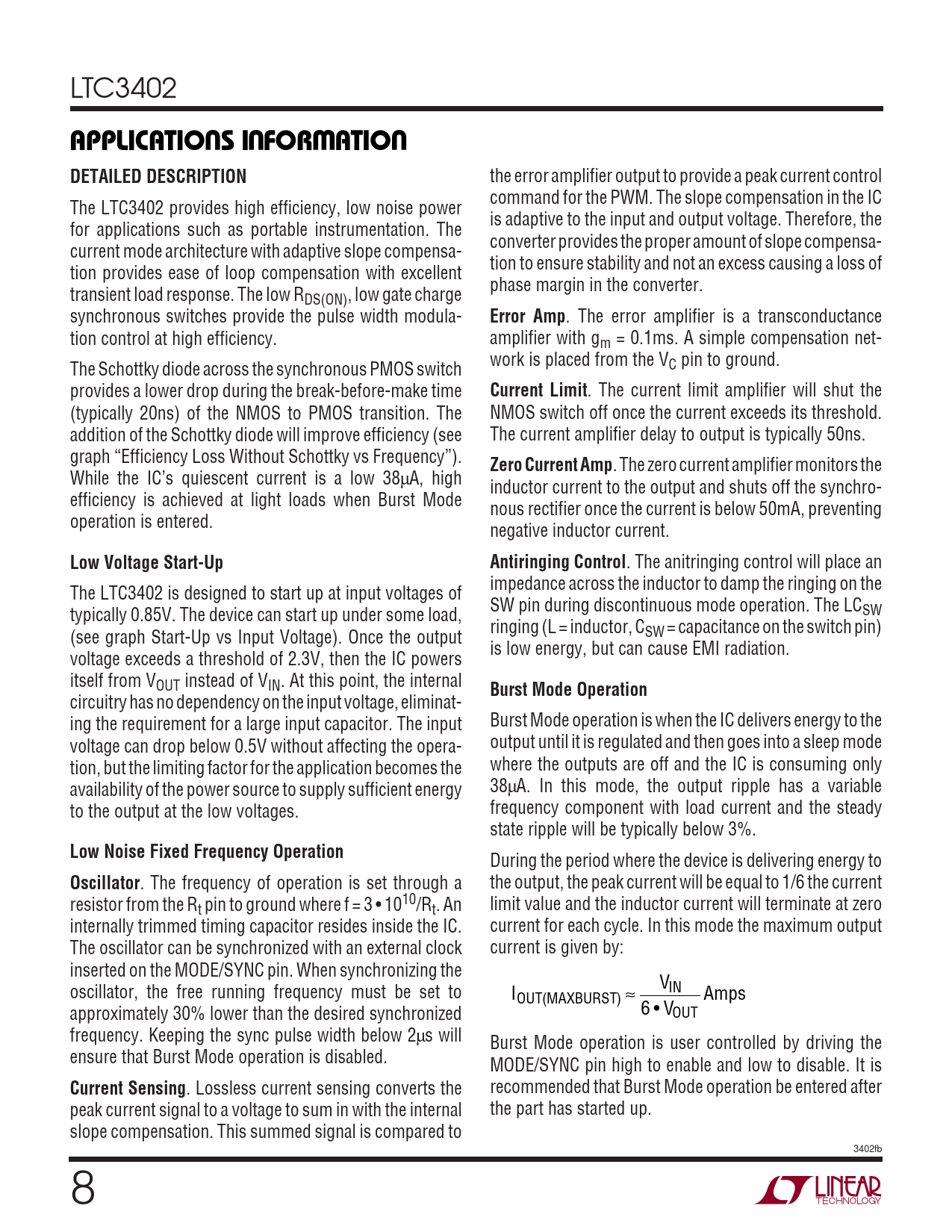 . Lossless current sensing converts the recommended that Burst Mode operation be entered after peak current signal to a voltage to sum in with the internal the part has started up. slope compensation. This summed signal is compared to 3402fb 8