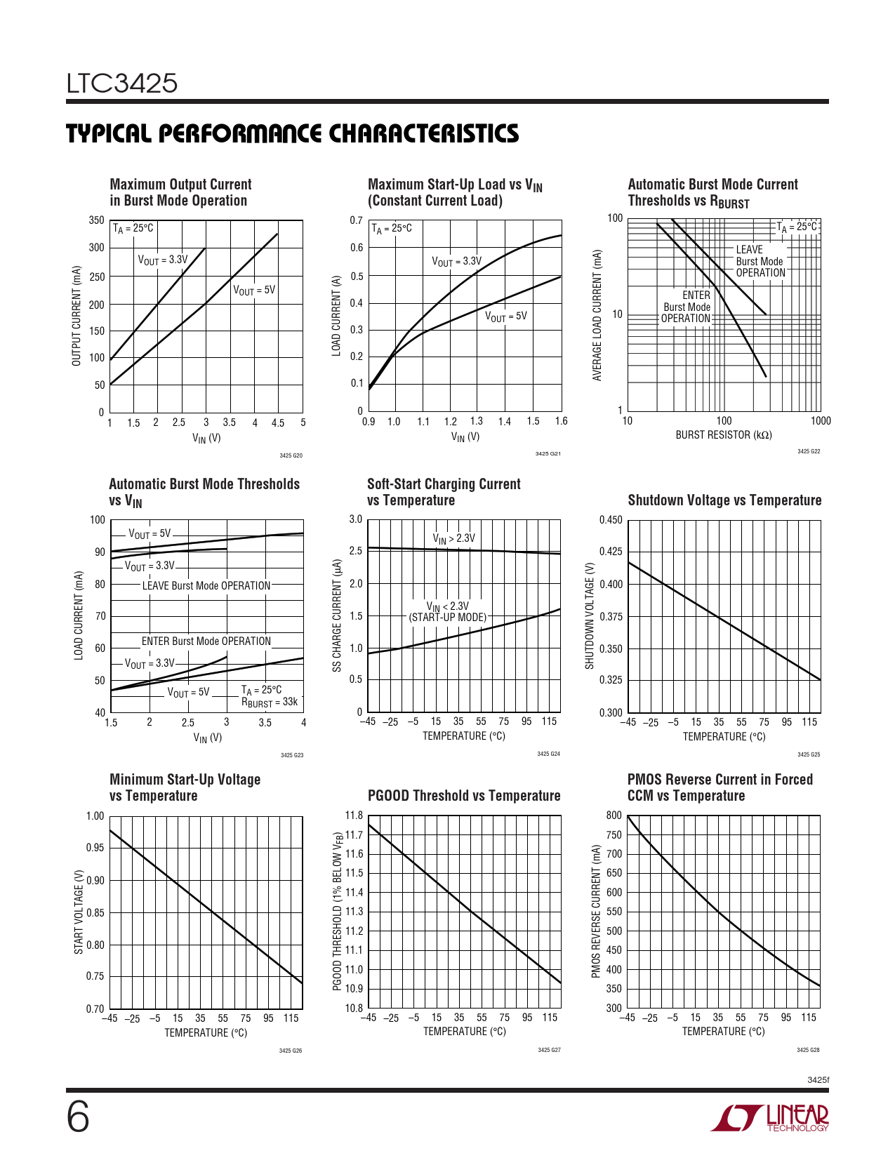 100 3.0 0.450 VOUT = 5V VIN > 2.3V 90 2.5 0.425 VOUT = 3.3V µA) 80 LEAVE Burst Mode OPERATION 2.0 0.400 VIN < 2.3V 70 1.5 (START-UP MODE) 0.375 ENTER Burst Mode OPERATION 60 1.0 0.350 LOAD CURRENT (mA) VOUT = 3.3V SS CHARGE CURRENT ( SHUTDOWN VOLTAGE (V) 50 0.5 0.325 V TA = 25°C OUT = 5V RBURST = 33k 40 0 0.300 1.5 2 2.5 3 3.5 4 –45 –25 –5 15 35 55 75 95 115 –45 –25 –5 15 35 55 75 95 115 V TEMPERATURE (°C) IN (V) TEMPERATURE (°C) 3425 G23 3425 G24 3425 G25
