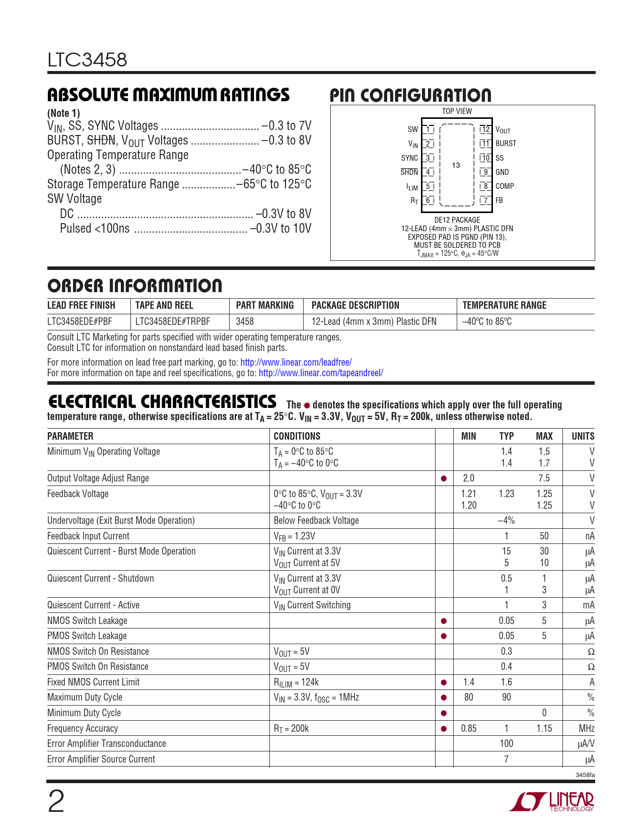 LTC3458 WWWUABSOLUTE AXI URATI GSPIN CONFIGURATION(Note 1) TOP VIEW VIN, SS, SYNC Voltages ... –0.3 to 7V SW 1 12 VOUT BURST, SHDN, VOUT Voltages ... –0.3 to 8V V 2 11 BURST IN Operating Temperature Range SYNC 3 10 SS (Notes 2, 3) ...–40°C to 85°C 13 SHDN 4 9 GND Storage Temperature Range ..–65°C to 125°C I 5 8 COMP LIM SW Voltage R 6 7 FB T DC ... –0.3V to 8V DE12 PACKAGE Pulsed <100ns .. –0.3V to 10V 12-LEAD (4mm × 3mm) PLASTIC DFN EXPOSED PAD IS PGND (PIN 13), MUST BE SOLDERED TO PCB TJMAX = 125°C, θJA = 45°C/W ORDER INFORMATION LEAD FREE FINISHTAPE AND REELPART MARKINGPACKAGE DESCRIPTIONTEMPERATURE RANGE LTC3458EDE#PBF LTC3458EDE#TRPBF 3458 12-Lead (4mm x 3mm) Plastic DFN –40ºC to 85ºC Consult LTC Marketing for parts specified with wider operating temperature ranges. Consult LTC for information on nonstandard lead based finish parts. For more information on lead free part marking, go to: http://www.linear.com/leadfree/ For more information on tape and reel specifications, go to: http://www.linear.com/tapeandreel/ ELECTRICAL CHARACTERISTICS The ● denotes the specifications which apply over the full operatingtemperature range, otherwise specifications are at TA = 25 ° C. VIN = 3.3V, VOUT = 5V, RT = 200k, unless otherwise noted.PARAMETERCONDITIONSMINTYPMAXUNITS Minimum VIN Operating Voltage TA = 0°C to 85°C 1.4 1.5 V TA = –40°C to 0°C 1.4 1.7 V Output Voltage Adjust Range ● 2.0 7.5 V Feedback Voltage 0°C to 85°C, VOUT = 3.3V 1.21 1.23 1.25 V –40°C to 0°C 1.20 1.25 V Undervoltage (Exit Burst Mode Operation) Below Feedback Voltage –4% V Feedback Input Current VFB = 1.23V 1 50 nA Quiescent Current - Burst Mode Operation VIN Current at 3.3V 15 30 μA VOUT Current at 5V 5 10 μA Quiescent Current - Shutdown VIN Current at 3.3V 0.5 1 μA VOUT Current at 0V 1 3 μA Quiescent Current - Active VIN Current Switching 1 3 mA NMOS Switch Leakage ● 0.05 5 μA PMOS Switch Leakage ● 0.05 5 μA NMOS Switch On Resistance VOUT = 5V 0.3 Ω PMOS Switch On Resistance VOUT = 5V 0.4 Ω Fixed NMOS Current Limit RILIM = 124k ● 1.4 1.6 A Maximum Duty Cycle VIN = 3.3V, fOSC = 1MHz ● 80 90 % Minimum Duty Cycle ● 0 % Frequency Accuracy RT = 200k ● 0.85 1 1.15 MHz Error Amplifier Transconductance 100 μA/V Error Amplifier Source Current 7 μA 3458fa 2