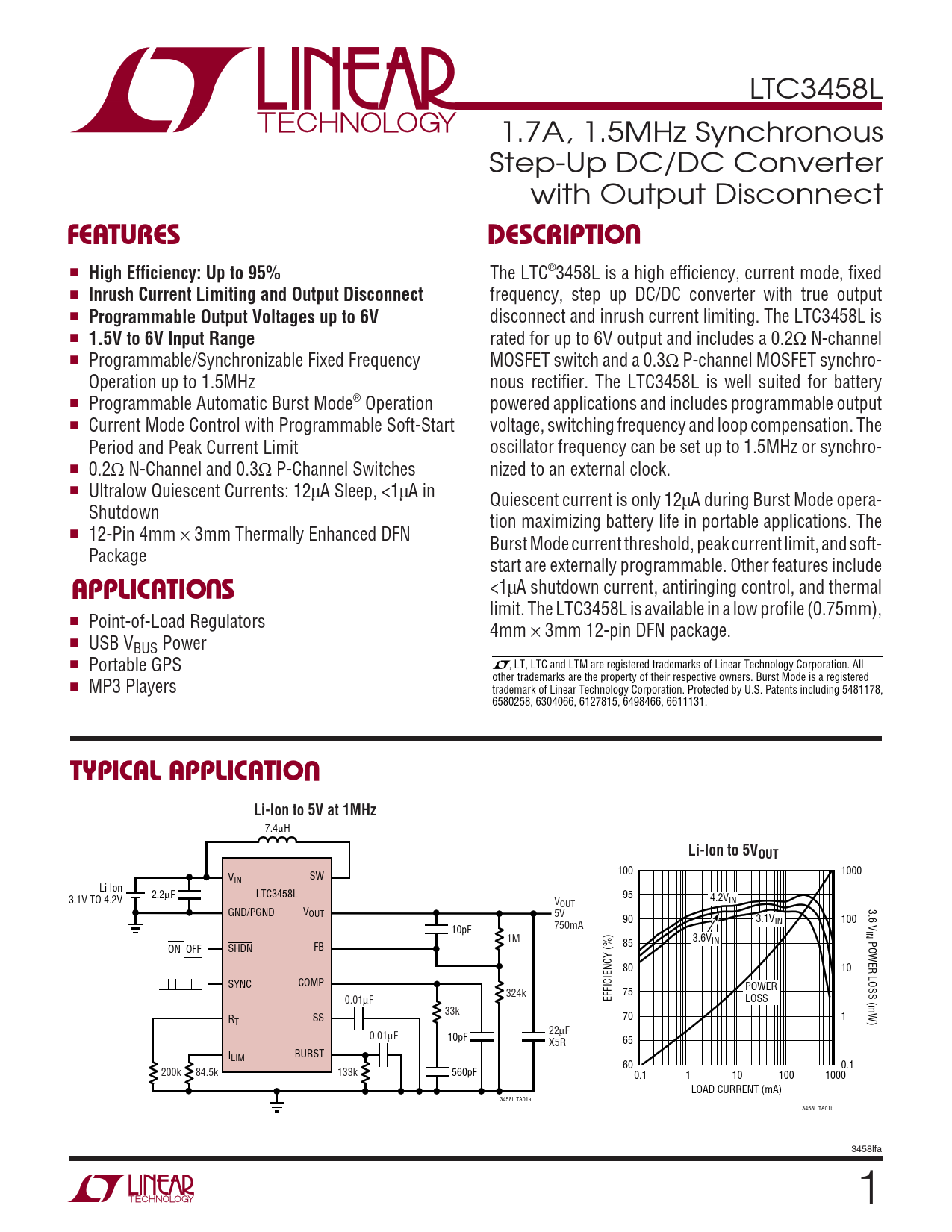 LTC3458L 1.7A, 1.5MHz Synchronous Step-Up DC/DC Converter with Output Disconnect UFEATURESDESCRIPTIO ■ High Efficiency: Up to 95% The LTC®3458L is a high efficiency, current mode, fixed ■ Inrush Current Limiting and Output Disconnect frequency, step up DC/DC converter with true output ■ Programmable Output Voltages up to 6V disconnect and inrush current limiting. The LTC3458L is ■ 1.5V to 6V Input Range rated for up to 6V output and includes a 0.2Ω N-channel ■ Programmable/Synchronizable Fixed Frequency MOSFET switch and a 0.3Ω P-channel MOSFET synchro- Operation up to 1.5MHz nous rectifier. The LTC3458L is well suited for battery ■ Programmable Automatic Burst Mode® Operation powered applications and includes programmable output ■ Current Mode Control with Programmable Soft-Start voltage, switching frequency and loop compensation. The Period and Peak Current Limit oscillator frequency can be set up to 1.5MHz or synchro- ■ 0.2Ω N-Channel and 0.3Ω P-Channel Switches nized to an external clock. ■ Ultralow Quiescent Currents: 12μA Sleep, <1μA in Quiescent current is only 12μA during Burst Mode opera- Shutdown tion maximizing battery life in portable applications. The ■ 12-Pin 4mm × 3mm Thermally Enhanced DFN Burst Mode current threshold, peak current limit, and soft- Package U start are externally programmable. Other features include APPLICATIO S <1μA shutdown current, antiringing control, and thermal limit. The LTC3458L is available in a low profile (0.75mm), ■ Point-of-Load Regulators 4mm × 3mm 12-pin DFN package. ■ USB VBUS Power ■ Portable GPS , LT, LTC and LTM are registered trademarks of Linear Technology Corporation. All other trademarks are the property of their respective owners. Burst Mode is a registered ■ MP3 Players trademark of Linear Technology Corporation. Protected by U.S. Patents including 5481178, 6580258, 6304066, 6127815, 6498466, 6611131. UTYPICAL APPLICATIOLi-Ion to 5V at 1MHz 7.4μH Li-Ion to 5VOUT 100 1000 VIN SW Li Ion 2.2μF LTC3458L 95 3.1V TO 4.2V V 4.2V OUT IN 3.6 V GND/PGND VOUT 5V 90 3.1VIN 100 10pF 750mA IN 1M POWER LOSS (mW) 3.6V 85 IN ON OFF SHDN FB 80 10 SYNC COMP POWER 324k 75 0.01μF EFFICIENCY (%) LOSS 33k R 70 1 T SS 22μF 0.01μF 10pF X5R 65 ILIM BURST 60 0.1 200k 84.5k 133k 560pF 0.1 1 10 100 1000 LOAD CURRENT (mA) 3458L TA01a 3458L TA01b 3458lfa 1