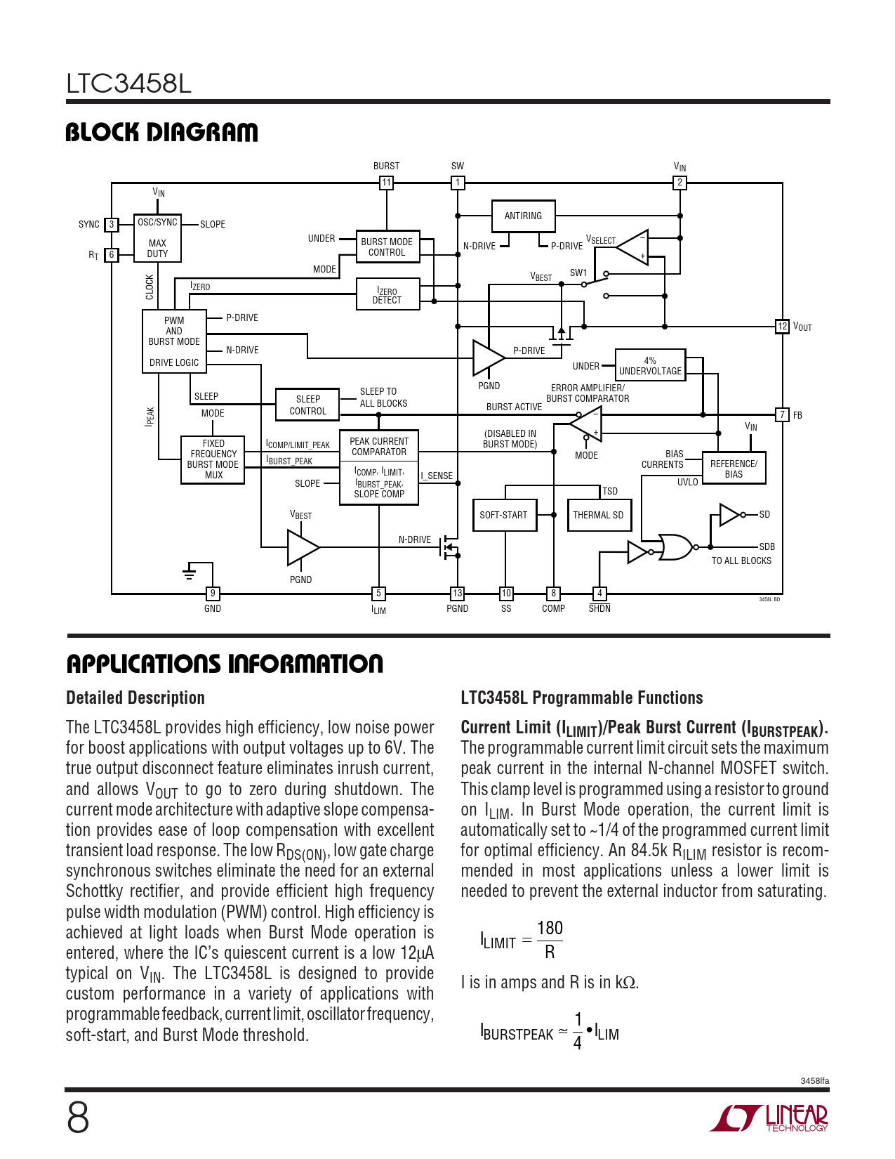 BURST SW VIN 11 1 2 VIN ANTIRING SYNC 3 OSC/SYNC SLOPE UNDER VSELECT – MAX BURST MODE N-DRIVE P-DRIVE R CONTROL T 6 DUTY + MODE V SW1 BEST IZERO IZERO CLOCK DETECT PWM P-DRIVE 12 VOUT AND BURST MODE N-DRIVE P-DRIVE DRIVE LOGIC 4% UNDER UNDERVOLTAGE PGND SLEEP TO ERROR AMPLIFIER/ SLEEP SLEEP BURST COMPARATOR ALL BLOCKS CONTROL BURST ACTIVE MODE – 7 FB I PEAK VIN (DISABLED IN + FIXED I PEAK CURRENT COMP/LIMIT_PEAK BURST MODE) FREQUENCY COMPARATOR MODE BIAS I BURST MODE BURST_PEAK CURRENTS REFERENCE/ I MUX COMP, ILIMIT, I_SENSE BIAS SLOPE IBURST_PEAK, UVLO SLOPE COMP TSD VBEST SOFT-START THERMAL SD SD N-DRIVE SDB TO ALL BLOCKS PGND 9 5 13 10 8 4 3458L BD GND ILIM PGND SS COMP SHDN