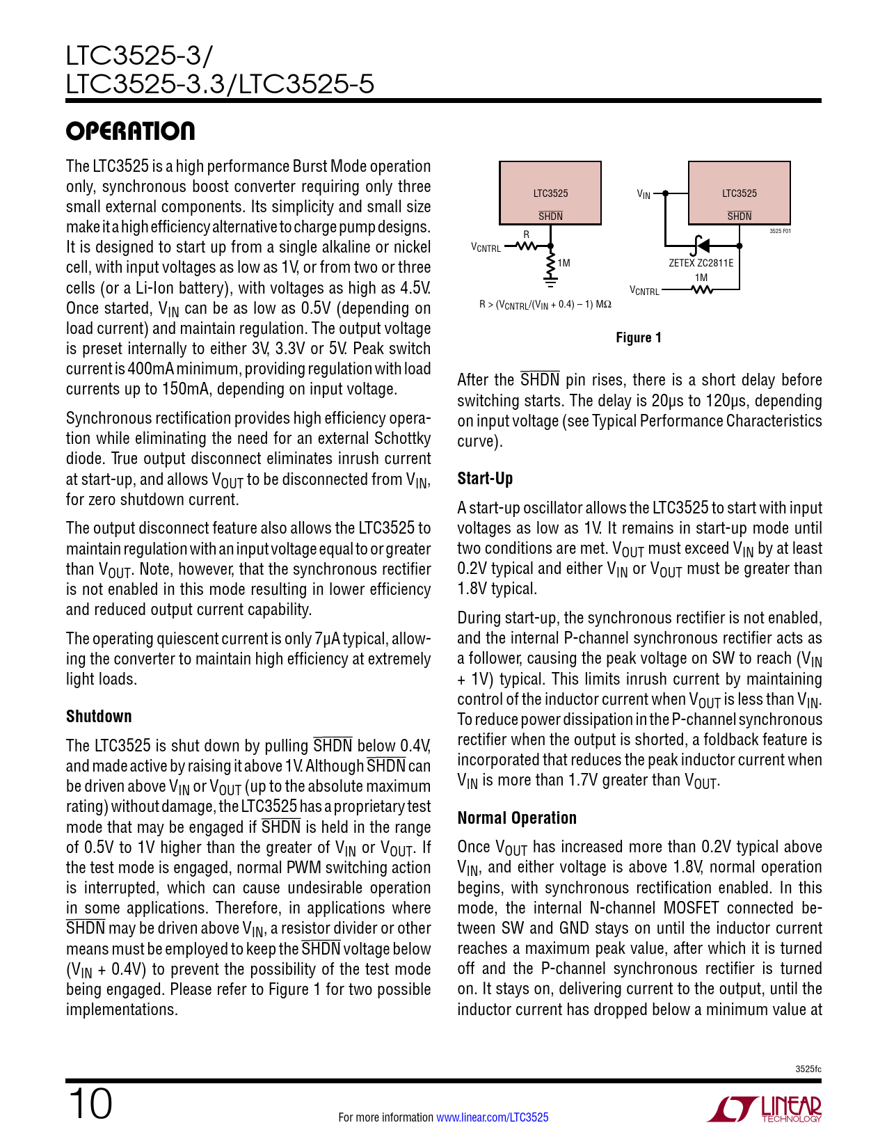 LTC3525-3/ LTC3525-3.3/LTC3525-5 operaTion The LTC3525 is a high performance Burst Mode operation only, synchronous boost converter requiring only three LTC3525 V LTC3525 small external components. Its simplicity and small size IN make it a high efficiency alternative to charge pump designs. SHDN SHDN R 3525 F01 It is designed to start up from a single alkaline or nickel VCNTRL cell, with input voltages as low as 1V, or from two or three 1M ZETEX ZC2811E cells (or a Li-Ion battery), with voltages as high as 4.5V. 1M VCNTRL Once started, VIN can be as low as 0.5V (depending on R > (VCNTRL/(VIN + 0.4) – 1) MΩ load current) and maintain regulation. The output voltage Figure 1 is preset internally to either 3V, 3.3V or 5V. Peak switch current is 400mA minimum, providing regulation with load currents up to 150mA, depending on input voltage. After the SHDN pin rises, there is a short delay before switching starts. The delay is 20µs to 120µs, depending Synchronous rectification provides high efficiency opera- on input voltage (see Typical Performance Characteristics tion while eliminating the need for an external Schottky curve). diode. True output disconnect eliminates inrush current at start-up, and allows VOUT to be disconnected from VIN, Start-Up for zero shutdown current. A start-up oscillator allows the LTC3525 to start with input The output disconnect feature also allows the LTC3525 to voltages as low as 1V. It remains in start-up mode until maintain regulation with an input voltage equal to or greater two conditions are met. VOUT must exceed VIN by at least than VOUT. Note, however, that the synchronous rectifier 0.2V typical and either VIN or VOUT must be greater than is not enabled in this mode resulting in lower efficiency 1.8V typical. and reduced output current capability. During start-up, the synchronous rectifier is not enabled, The operating quiescent current is only 7µA typical, allow- and the internal P-channel synchronous rectifier acts as ing the converter to maintain high efficiency at extremely a follower, causing the peak voltage on SW to reach (VIN light loads. + 1V) typical. This limits inrush current by maintaining control of the inductor current when VOUT is less than VIN. Shutdown To reduce power dissipation in the P-channel synchronous The LTC3525 is shut down by pulling SHDN below 0.4V, rectifier when the output is shorted, a foldback feature is and made active by raising it above 1V. Although SHDN can incorporated that reduces the peak inductor current when be driven above V V IN or VOUT (up to the absolute maximum IN is more than 1.7V greater than VOUT. rating) without damage, the LTC3525 has a proprietary test mode that may be engaged if SHDN is held in the range Normal Operation of 0.5V to 1V higher than the greater of VIN or VOUT. If Once VOUT has increased more than 0.2V typical above the test mode is engaged, normal PWM switching action VIN, and either voltage is above 1.8V, normal operation is interrupted, which can cause undesirable operation begins, with synchronous rectification enabled. In this in some applications. Therefore, in applications where mode, the internal N-channel MOSFET connected be- SHDN may be driven above VIN, a resistor divider or other tween SW and GND stays on until the inductor current means must be employed to keep the SHDN voltage below reaches a maximum peak value, after which it is turned (VIN + 0.4V) to prevent the possibility of the test mode off and the P-channel synchronous rectifier is turned being engaged. Please refer to Figure 1 for two possible on. It stays on, delivering current to the output, until the implementations. inductor current has dropped below a minimum value at 3525fc 10 For more information www.linear.com/LTC3525 Document Outline Features Applications Description Typical Application Absolute Maximum Ratings Pin Configuration Order Information Electrical characteristics Typical Performance Characteristics Pin Functions Block Diagram Operation Typical Applications Package Description Revision History Typical Application Related Parts