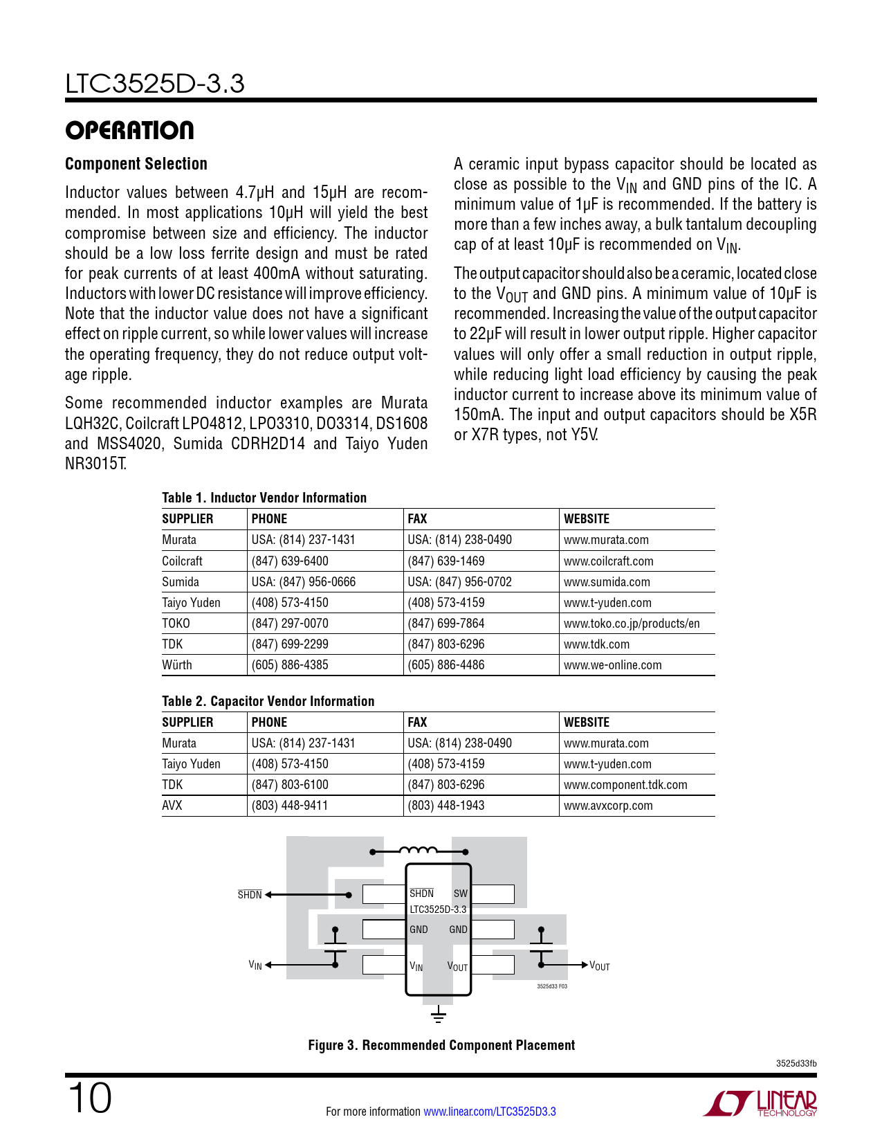 Murata USA: (814) 237-1431 USA: (814) 238-0490 www.murata.com Taiyo Yuden (408) 573-4150 (408) 573-4159 www.t-yuden.com TDK (847) 803-6100 (847) 803-6296 www.component.tdk.com AVX (803) 448-9411 (803) 448-1943 www.avxcorp.com SHDN SHDN SW LTC3525D-3.3 GND GND VIN VIN VOUT VOUT 3525d33 F03