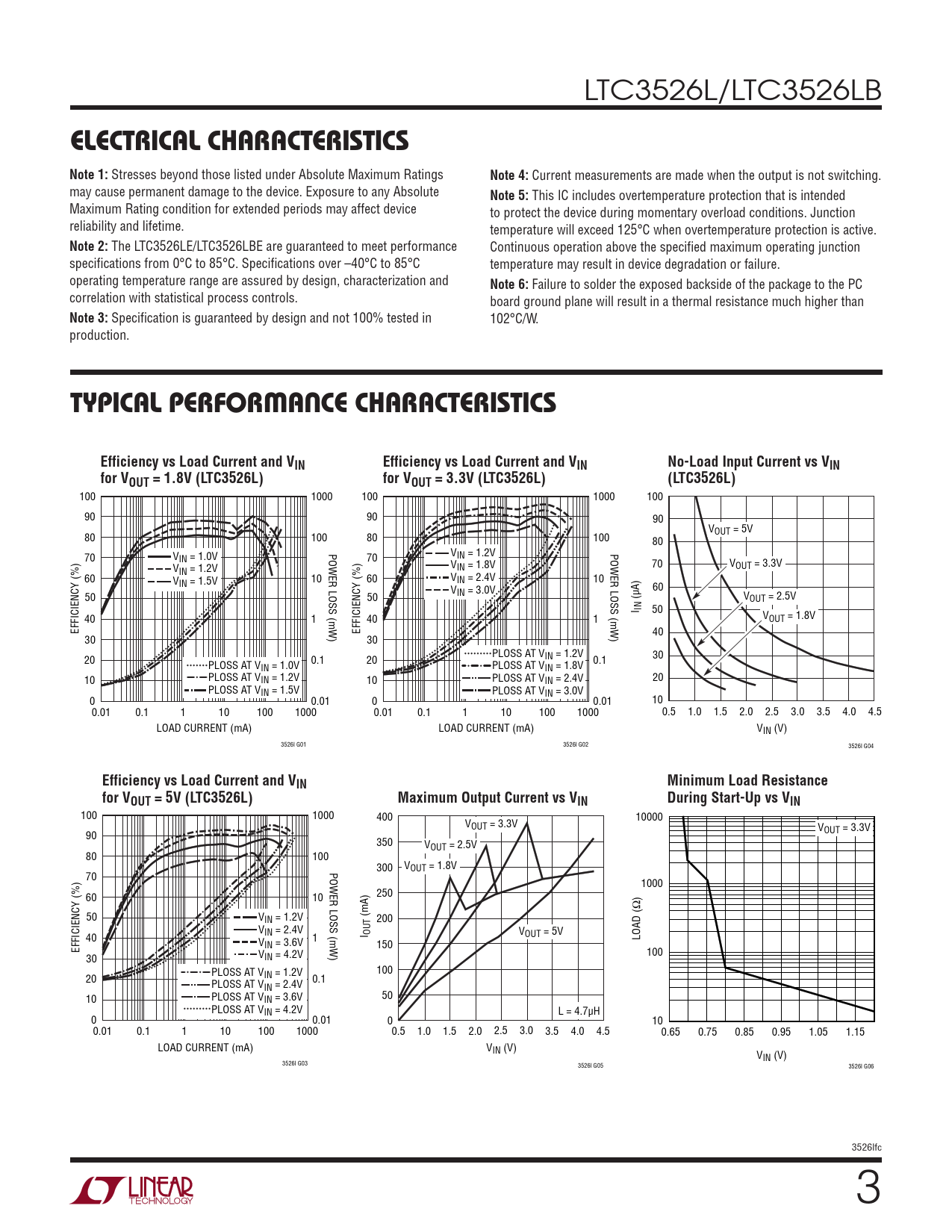 100 1000 100 1000 100 90 90 90 V 80 100 80 100 OUT = 5V 80 POWER LOSS (mW) V POWER LOSS (mW) 70 VIN = 1.0V 70 IN = 1.2V V V 70 VOUT = 3.3V IN = 1.2V IN = 1.8V 60 V 10 V IN = 1.5V 60 IN = 2.4V 10 V 60 50 50 IN = 3.0V (µA) VOUT = 2.5V I IN 50 40 1 40 1 VOUT = 1.8V EFFICIENCY (%) EFFICIENCY (%) 40 30 30 PLOSS AT V 20 0.1 IN = 1.2V 30 PLOSS AT V 20 0.1 IN = 1.0V PLOSS AT VIN = 1.8V 10 PLOSS AT VIN = 1.2V 10 PLOSS AT VIN = 2.4V 20 PLOSS AT VIN = 1.5V PLOSS AT VIN = 3.0V 0 0.01 0 0.01 10 0.01 0.1 1 10 100 1000 0.01 0.1 1 10 100 1000 0.5 1.0 1.5 2.0 2.5 3.0 3.5 4.0 4.5 LOAD CURRENT (mA) LOAD CURRENT (mA) VIN (V) 3526l G01 3526l G02 3526l G04