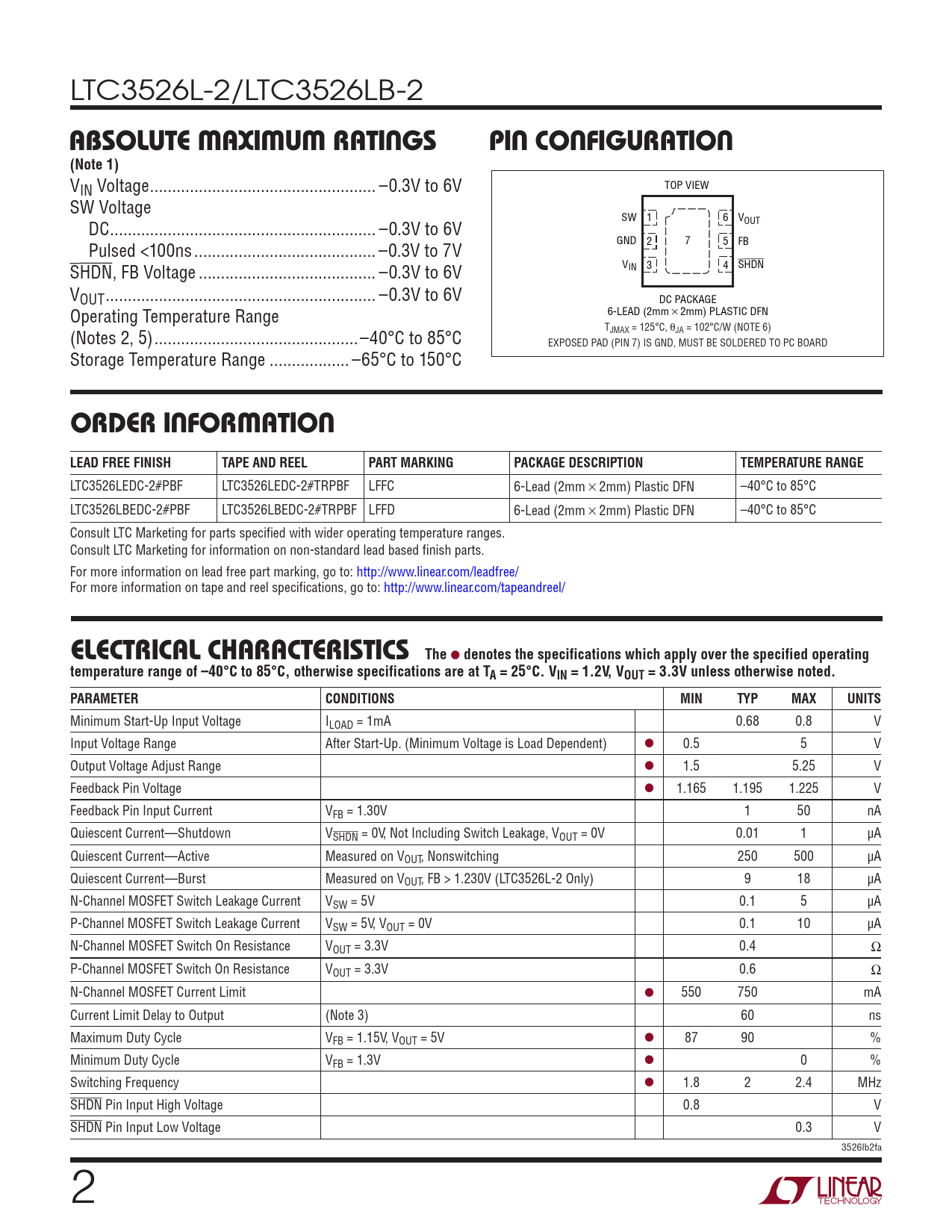 LTC3526LEDC-2#PBF LTC3526LEDC-2#TRPBF LFFC 6-Lead (2mm × 2mm) Plastic DFN –40°C to 85°C LTC3526LBEDC-2#PBF LTC3526LBEDC-2#TRPBF LFFD 6-Lead (2mm × 2mm) Plastic DFN –40°C to 85°C Consult LTC Marketing for parts specified with wider operating temperature ranges. Consult LTC Marketing for information on non-standard lead based finish parts. For more information on lead free part marking, go to: http://www.linear.com/leadfree/ For more information on tape and reel specifications, go to: http://www.linear.com/tapeandreel/ e lecTrical characTerisTics
