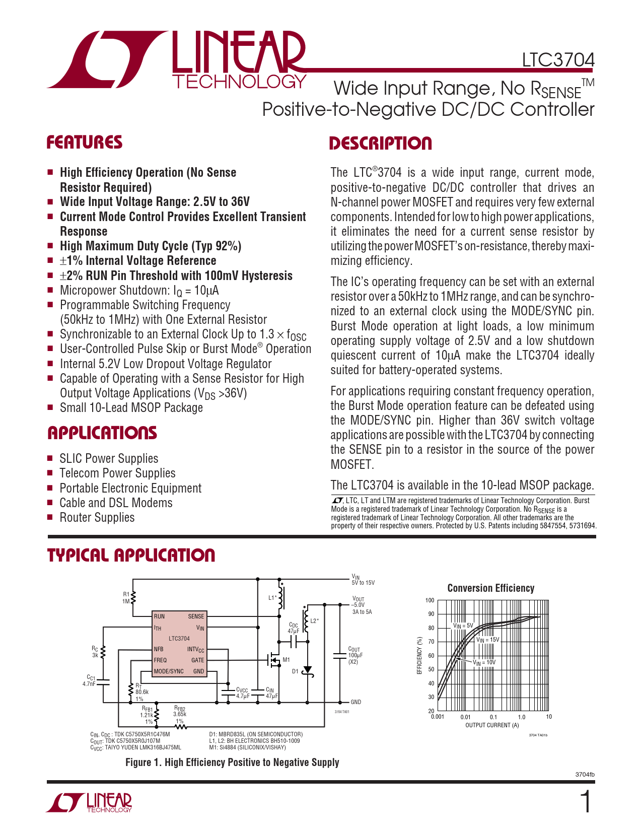 LTC3704 Wide Input Range, No R TM SENSE Positive-to-Negative DC/DC Controller UFEATURESDESCRIPTIO ■ High Efficiency Operation (No Sense The LTC®3704 is a wide input range, current mode, Resistor Required) positive-to-negative DC/DC controller that drives an ■ Wide Input Voltage Range: 2.5V to 36V N-channel power MOSFET and requires very few external ■ Current Mode Control Provides Excellent Transient components. Intended for low to high power applications, Response it eliminates the need for a current sense resistor by ■ High Maximum Duty Cycle (Typ 92%) utilizing the power MOSFET’s on-resistance, thereby maxi- ■ ± 1% Internal Voltage Reference mizing efficiency. ■ ± 2% RUN Pin Threshold with 100mV Hysteresis The IC’s operating frequency can be set with an external ■ Micropower Shutdown: IQ = 10μA resistor over a 50kHz to 1MHz range, and can be synchro- ■ Programmable Switching Frequency nized to an external clock using the MODE/SYNC pin. (50kHz to 1MHz) with One External Resistor Burst Mode operation at light loads, a low minimum ■ Synchronizable to an External Clock Up to 1.3 × fOSC operating supply voltage of 2.5V and a low shutdown ■ User-Controlled Pulse Skip or Burst Mode® Operation quiescent current of 10μA make the LTC3704 ideally ■ Internal 5.2V Low Dropout Voltage Regulator suited for battery-operated systems. ■ Capable of Operating with a Sense Resistor for High Output Voltage Applications (V For applications requiring constant frequency operation, DS >36V) ■ Small 10-Lead MSOP Package the Burst Mode operation feature can be defeated using U the MODE/SYNC pin. Higher than 36V switch voltage APPLICATIO S applications are possible with the LTC3704 by connecting the SENSE pin to a resistor in the source of the power ■ SLIC Power Supplies MOSFET. ■ Telecom Power Supplies ■ The LTC3704 is available in the 10-lead MSOP package. Portable Electronic Equipment ■ Cable and DSL Modems , LTC, LT and LTM are registered trademarks of Linear Technology Corporation. Burst Mode is a registered trademark of Linear Technology Corporation. No RSENSE is a ■ Router Supplies registered trademark of Linear Technology Corporation. All other trademarks are the property of their respective owners. Protected by U.S. Patents including 5847554, 5731694. UTYPICAL APPLICATIO VIN • 5V to 15V Conversion Efficiency R1 L1* V 1M OUT 100 –5.0V • 3A to 5A RUN SENSE 90 L2* C I DC V TH VIN 80 IN = 5V 47μF LTC3704 70 VIN = 15V RC NFB INTVCC COUT 3k 100μF 60 FREQ GATE M1 (X2) VIN = 10V MODE/SYNC GND D1 50 EFFICIENCY (%) CC1 4.7nF R 40 T C C 80.6k VCC IN 4.7μF 47μF 1% 30 GND RFB1 RFB2 3704 TA01 20 1.21k 3.65k 0.001 0.01 0.1 1.0 10 1% 1% OUTPUT CURRENT (A) CIN, CDC : TDK C5750X5R1C476M D1: MBRD835L (ON SEMICONDUCTOR) 3704 TA01b COUT: TDK C5750X5R0J107M L1, L2: BH ELECTRONICS BH510-1009 CVCC: TAIYO YUDEN LMK316BJ475ML M1: Si4884 (SILICONIX/VISHAY) Figure 1. High Efficiency Positive to Negative Supply 3704fb 1