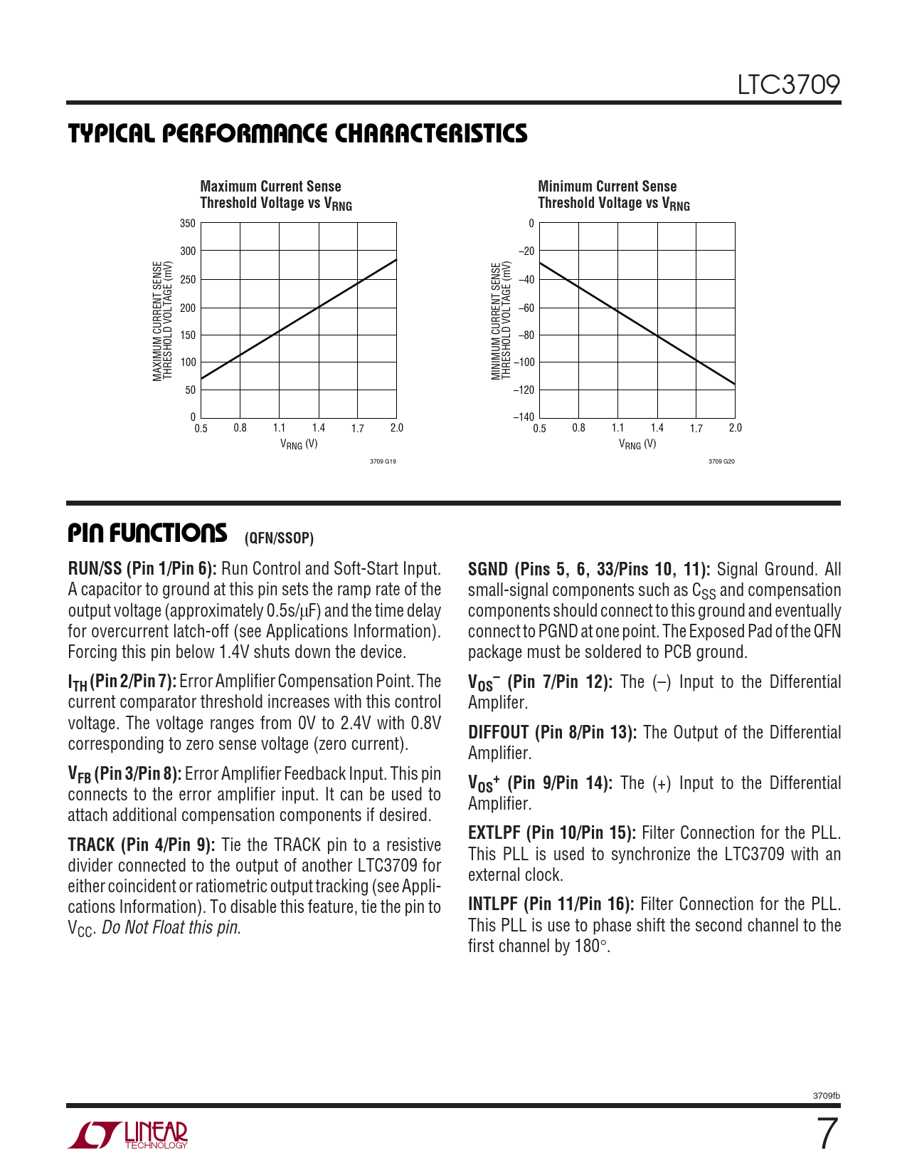 350 0 300 –20 250 –40 200 –60 150 –80 100 –100 MAXIMUM CURRENT SENSE THRESHOLD VOLTAGE (mV) MINIMUM CURRENT SENSE THRESHOLD VOLTAGE (mV) 50 –120 0 –140 0.5 0.8 1.1 1.4 1.7 2.0 0.5 0.8 1.1 1.4 1.7 2.0 VRNG (V) VRNG (V) 3709 G19 3709 G20