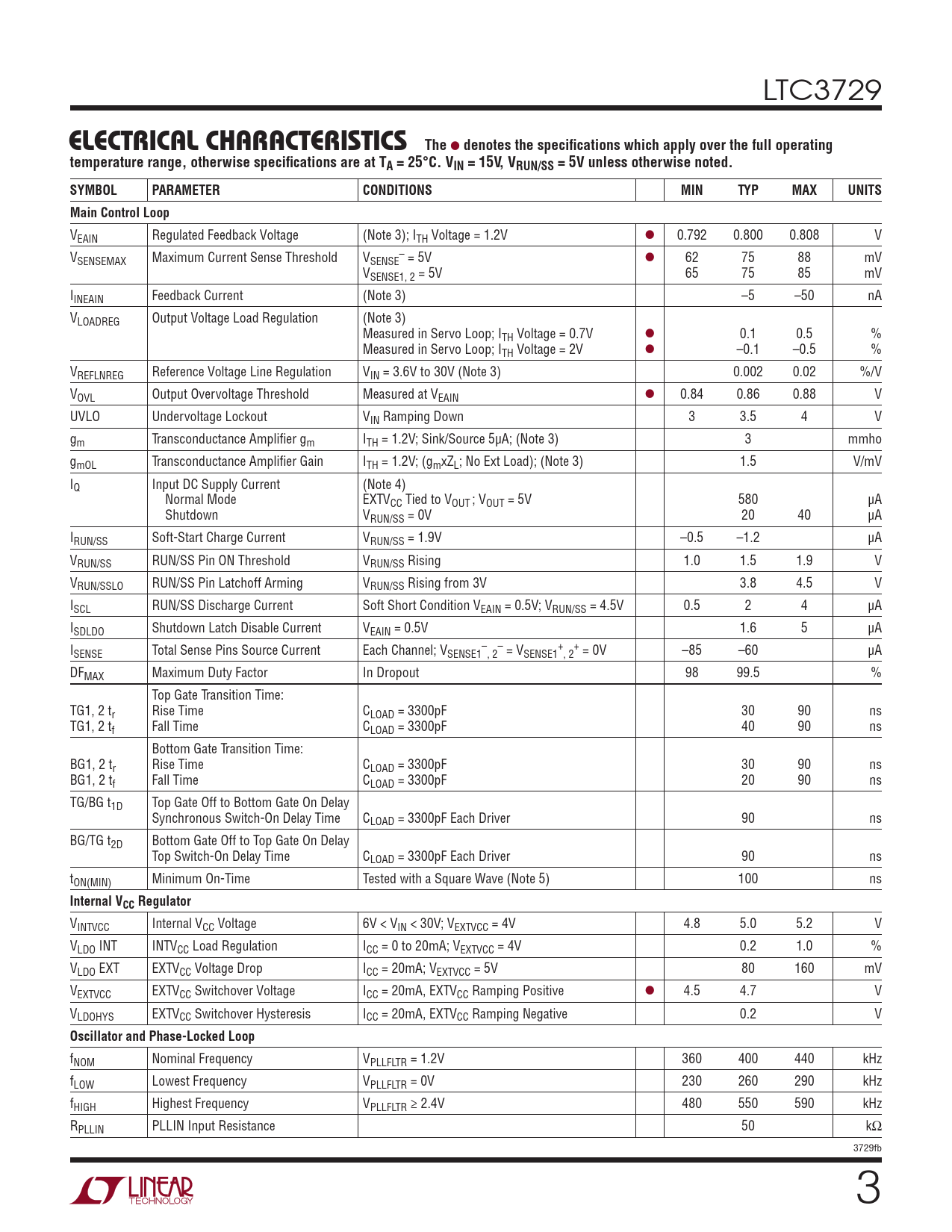 VEAIN Regulated Feedback Voltage (Note 3); ITH Voltage = 1.2V l 0.792 0.800 0.808 V V – SENSEMAX Maximum Current Sense Threshold VSENSE = 5V l 62 75 88 mV VSENSE1, 2 = 5V 65 75 85 mV IINEAIN Feedback Current (Note 3) –5 –50 nA VLOADREG Output Voltage Load Regulation (Note 3) Measured in Servo Loop; ITH Voltage = 0.7V l 0.1 0.5 % Measured in Servo Loop; ITH Voltage = 2V l –0.1 –0.5 % VREFLNREG Reference Voltage Line Regulation VIN = 3.6V to 30V (Note 3) 0.002 0.02 %/V VOVL Output Overvoltage Threshold Measured at VEAIN l 0.84 0.86 0.88 V UVLO Undervoltage Lockout VIN Ramping Down 3 3.5 4 V gm Transconductance Amplifier gm ITH = 1.2V; Sink/Source 5µA; (Note 3) 3 mmho gmOL Transconductance Amplifier Gain ITH = 1.2V; (gmxZL; No Ext Load); (Note 3) 1.5 V/mV IQ Input DC Supply Current (Note 4) Normal Mode EXTVCC Tied to VOUT; VOUT = 5V 580 µA Shutdown VRUN/SS = 0V 20 40 µA IRUN/SS Soft‑Start Charge Current VRUN/SS = 1.9V –0.5 –1.2 µA VRUN/SS RUN/SS Pin ON Threshold VRUN/SS Rising 1.0 1.5 1.9 V VRUN/SSLO RUN/SS Pin Latchoff Arming VRUN/SS Rising from 3V 3.8 4.5 V ISCL RUN/SS Discharge Current Soft Short Condition VEAIN = 0.5V; VRUN/SS = 4.5V 0.5 2 4 µA ISDLDO Shutdown Latch Disable Current VEAIN = 0.5V 1.6 5 µA I – – + + SENSE Total Sense Pins Source Current Each Channel; VSENSE1 , 2 = VSENSE1 , 2 = 0V –85 –60 µA DFMAX Maximum Duty Factor In Dropout 98 99.5 % Top Gate Transition Time: TG1, 2 tr Rise Time CLOAD = 3300pF 30 90 ns TG1, 2 tf Fall Time CLOAD = 3300pF 40 90 ns Bottom Gate Transition Time: BG1, 2 tr Rise Time CLOAD = 3300pF 30 90 ns BG1, 2 tf Fall Time CLOAD = 3300pF 20 90 ns TG/BG t1D Top Gate Off to Bottom Gate On Delay Synchronous Switch‑On Delay Time CLOAD = 3300pF Each Driver 90 ns BG/TG t2D Bottom Gate Off to Top Gate On Delay Top Switch‑On Delay Time CLOAD = 3300pF Each Driver 90 ns tON(MIN) Minimum On‑Time Tested with a Square Wave (Note 5) 100 ns