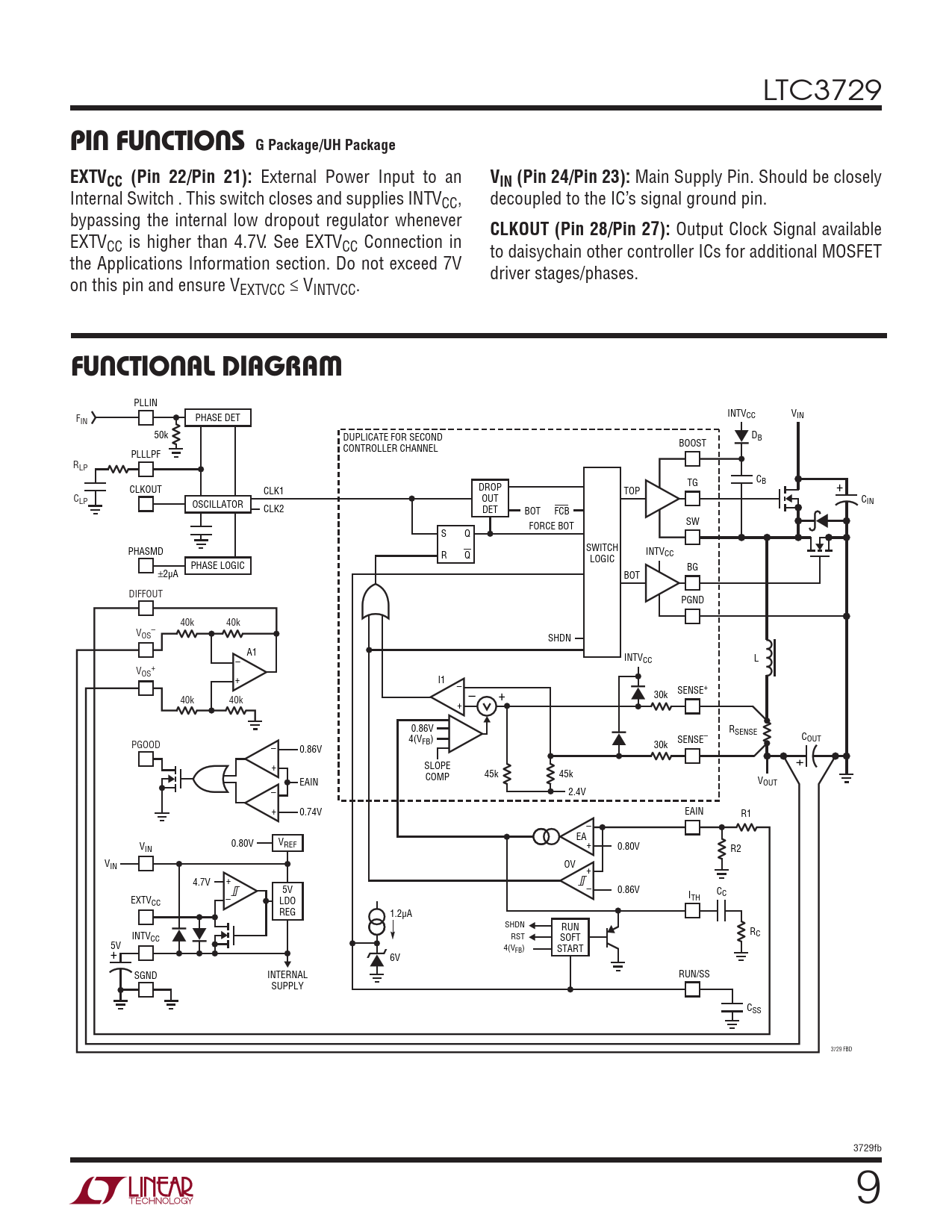 LTC3729 PIN FUNCTIONS G Package/UH Package EXTVCC (Pin 22/Pin 21): External Power Input to an VIN (Pin 24/Pin 23): Main Supply Pin. Should be closely Internal Switch . This switch closes and supplies INTVCC, decoupled to the IC’s signal ground pin. bypassing the internal low dropout regulator whenever CLKOUT (Pin 28/Pin 27): Output Clock Signal available EXTVCC is higher than 4.7V. See EXTVCC Connection in to daisychain other controller ICs for additional MOSFET the Applications Information section. Do not exceed 7V driver stages/phases. on this pin and ensure VEXTVCC ≤ VINTVCC. FUNCTIONAL DIAGRAM PLLIN INTVCC VIN F PHASE DET IN 50k DUPLICATE FOR SECOND D BOOST B CONTROLLER CHANNEL PLLLPF RLP TG CB CLKOUT CLK1 DROP TOP + CLP OUT CIN OSCILLATOR CLK2 DET BOT FCB SW FORCE BOT S Q SWITCH PHASMD INTV R Q LOGIC CC PHASE LOGIC BG ±2µA BOT DIFFOUT PGND 40k 40k V – OS SHDN A1 INTVCC L – V + OS + I1 – SENSE+ 40k 40k – + 30k + 0.86V RSENSE 4(V C FB) SENSE– PGOOD 30k OUT – 0.86V + SLOPE + COMP 45k 45k EAIN VOUT – 2.4V + 0.74V EAIN R1 – EA 0.80V V V IN REF + 0.80V R2 VIN OV + 4.7V + 5V – 0.86V CC EXTV – ITH CC LDO REG 1.2µA SHDN RUN INTV R CC RST SOFT C 5V + 4(VFB) START 6V SGND INTERNAL RUN/SS SUPPLY CSS 3729 FBD 3729fb 9 Document Outline Features Description Applications Typical Application Absolute Maximum Ratings Pin Configuration Order Information Electrical Characteristics Typical Performance Characteristics Pin Functions functional Diagram Operation Applications Information Typical Applications Package Description Revision History Typical Application Related Parts