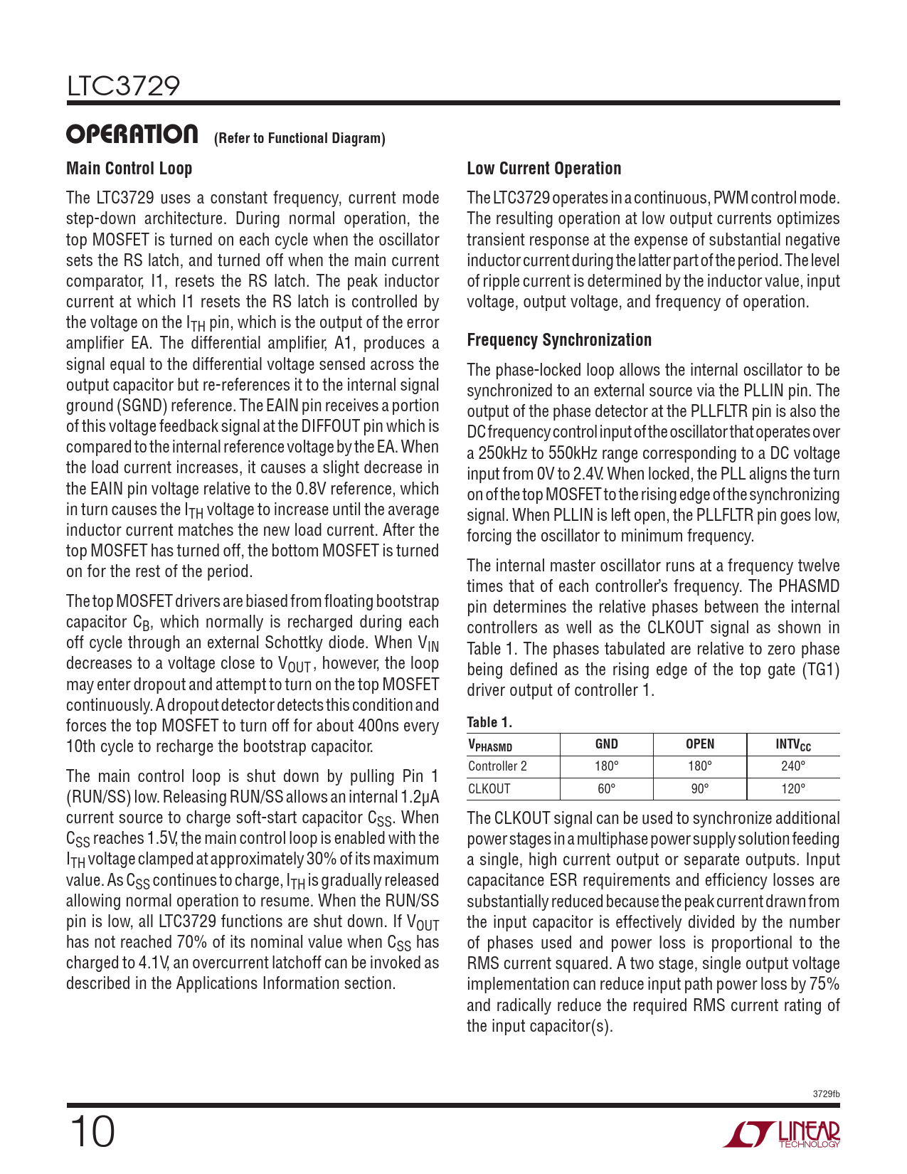 OPERATION (Refer to Functional Diagram). Main Control Loop. Low Current Operation. Frequency Synchronization. Table 1. VPHASMD. GND
