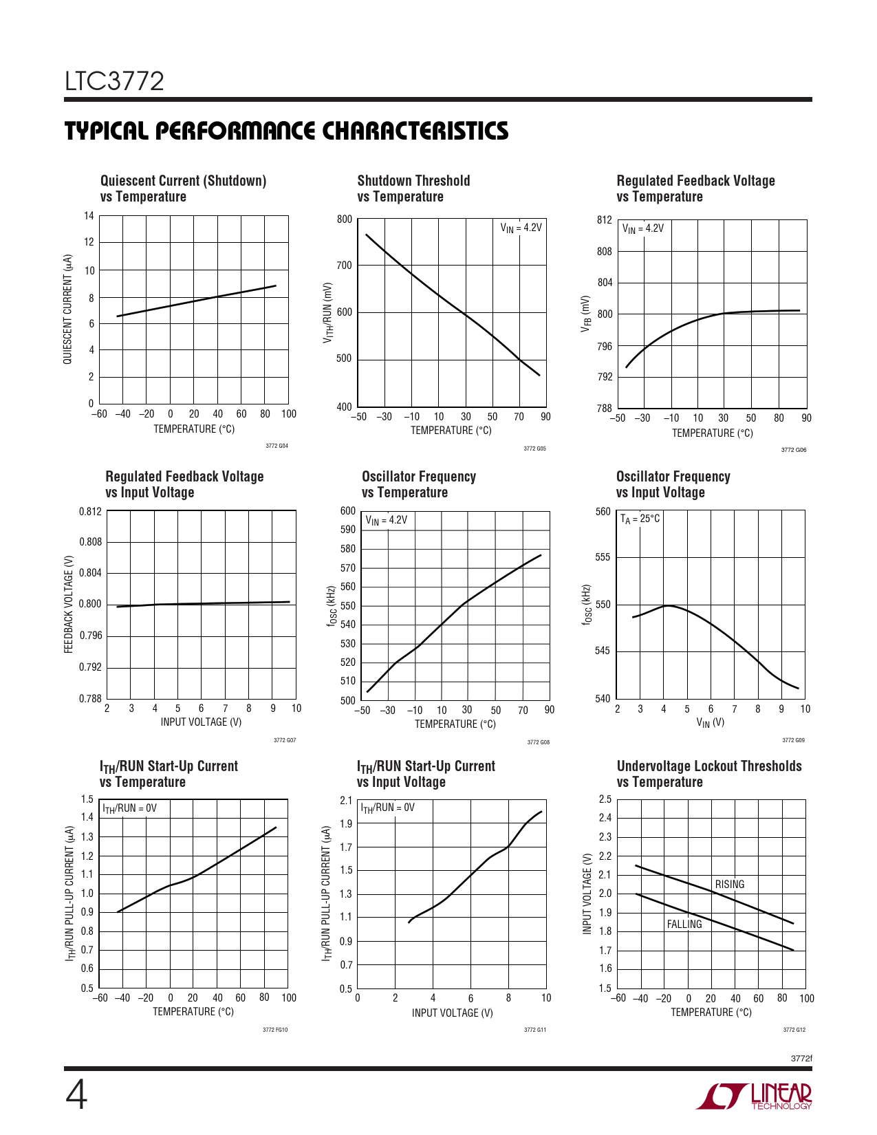 0.812 600 560 VIN = 4.2V TA = 25°C 590 0.808 580 555 570 0.804 560 0.800 (kHz) 550 (kHz) 550 f OSC 540 f OSC 0.796 530 FEEDBACK VOLTAGE (V) 545 520 0.792 510 0.788 500 540 2 3 4 5 6 7 8 9 10 –50 –30 –10 10 30 50 70 90 2 3 4 5 6 7 8 9 10 INPUT VOLTAGE (V) TEMPERATURE (°C) VIN (V) 3772 G07 3772 G08 3772 G09