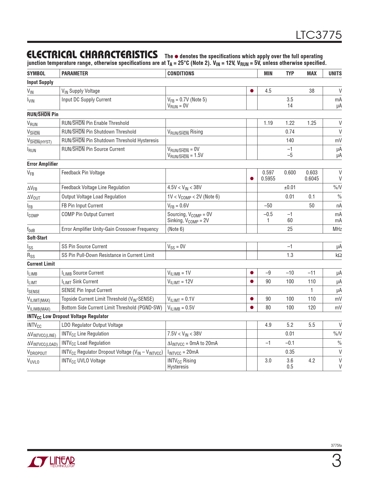 INTVCC LDO Regulator Output Voltage 4.9 5.2 5.5 V ΔVINTVCC(LINE) INTVCC Line Regulation 7.5V < VIN < 38V 0.01 %/V ΔVINTVCC(LOAD) INTVCC Load Regulation ΔIINTVCC = 0mA to 20mA –1 –0.1 % VDROPOUT INTVCC Regulator Dropout Voltage (VIN – VINTVCC) IINTVCC = 20mA 0.35 V VUVLO INTVCC UVLO Voltage INTVCC Rising 3.0 3.6 4.2 V Hysteresis 0.5 V 3775fa 3 Document Outline FEATURES DESCRIPTION APPLICATIONS TYPICAL APPLICATION ABSOLUTE MAXIMUM RATINGS PIN CONFIGURATION ORDER INFORMATION ELECTRICAL CHARACTERISTICS TYPICAL PERFORMANCE CHARACTERISTICS PIN FUNCTIONS BLOCK DIAGRAM APPLICATIONS INFORMATION TYPICAL APPLICATIONS PACKAGE DESCRIPTION REVISION HISTORY TYPICAL APPLICATION RELATED PARTS