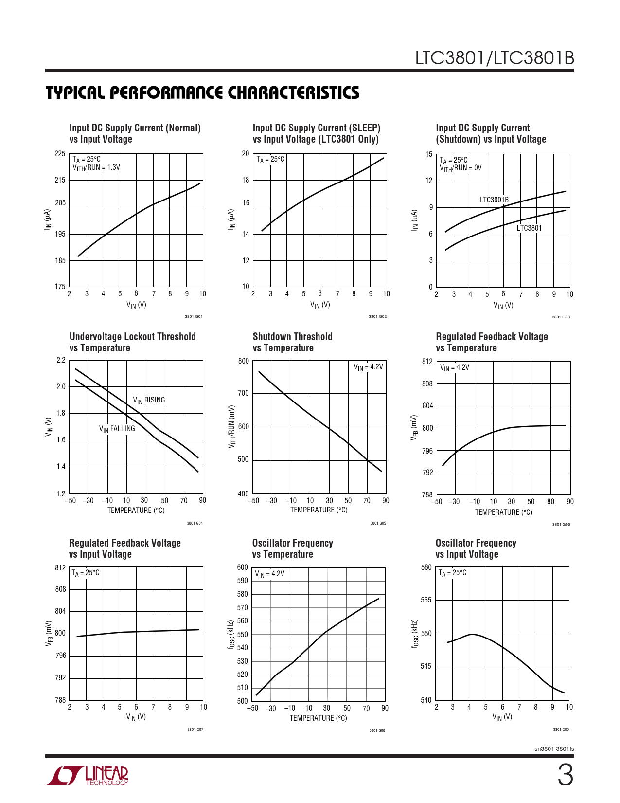 225 20 15 TA = 25°C TA = 25°C TA = 25°C VITH/RUN = 1.3V VITH/RUN = 0V 215 18 12 205 16 LTC3801B 9 µA) µA) µA) ( I IN I IN I IN LTC3801 195 14 6 185 12 3 175 10 0 2 3 4 5 6 7 8 9 10 2 3 4 5 6 7 8 9 10 2 3 4 5 6 7 8 9 10 VIN (V) VIN (V) VIN (V) 3801 G01 3801 G02 3801 G03