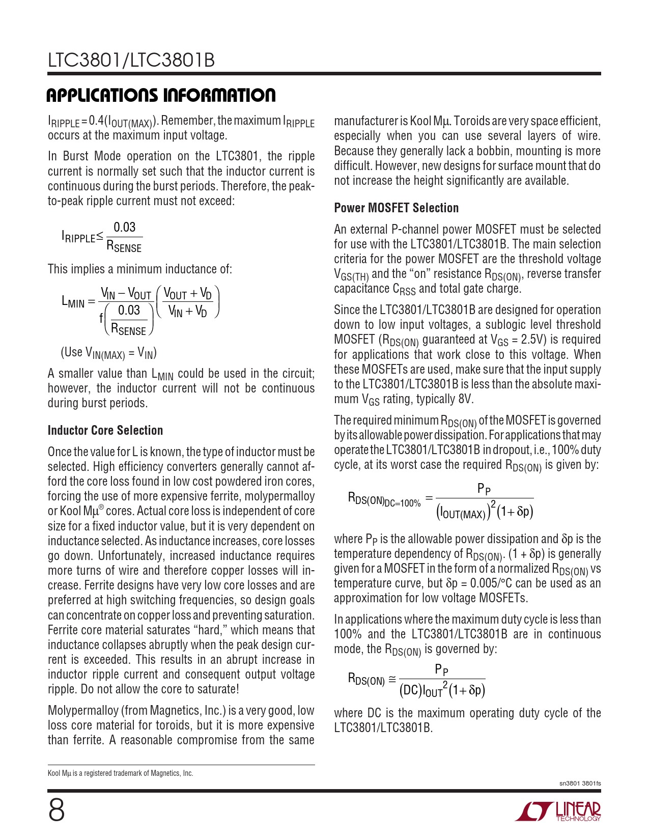 LTC3801/LTC3801B UUWUAPPLICATIO S I FOR ATIO IRIPPLE = 0.4(IOUT(MAX)). Remember, the maximum IRIPPLE manufacturer is Kool Mµ. Toroids are very space efficient, occurs at the maximum input voltage. especially when you can use several layers of wire. In Burst Mode operation on the LTC3801, the ripple Because they generally lack a bobbin, mounting is more current is normally set such that the inductor current is difficult. However, new designs for surface mount that do continuous during the burst periods. Therefore, the peak- not increase the height significantly are available. to-peak ripple current must not exceed: Power MOSFET Selection . An external P-channel power MOSFET must be selected IRIPPLE≤ 0 03 RSENSE for use with the LTC3801/LTC3801B. The main selection criteria for the power MOSFET are the threshold voltage This implies a minimum inductance of: VGS(TH) and the “on” resistance RDS(ON), reverse transfer V V V + V capacitance CRSS and total gate charge. L IN OUT OUT D MIN = − . V + V 0 03 Since the LTC3801/LTC3801B are designed for operation f IN D R down to low input voltages, a sublogic level threshold SENSE MOSFET (RDS(ON) guaranteed at VGS = 2.5V) is required (Use VIN(MAX) = VIN) for applications that work close to this voltage. When A smaller value than L these MOSFETs are used, make sure that the input supply MIN could be used in the circuit; however, the inductor current will not be continuous to the LTC3801/LTC3801B is less than the absolute maxi- during burst periods. mum VGS rating, typically 8V. The required minimum RDS(ON) of the MOSFET is governed Inductor Core Selection by its allowable power dissipation. For applications that may Once the value for L is known, the type of inductor must be operate the LTC3801/LTC3801B in dropout, i.e., 100% duty selected. High efficiency converters generally cannot af- cycle, at its worst case the required RDS(ON) is given by: ford the core loss found in low cost powdered iron cores, P forcing the use of more expensive ferrite, molypermalloy R P DS ON ( = DC ) = % 100 2 or Kool Mµ® cores. Actual core loss is independent of core I ( ) (1+ pδ) OUT MAX ( ) size for a fixed inductor value, but it is very dependent on inductance selected. As inductance increases, core losses where PP is the allowable power dissipation and δp is the go down. Unfortunately, increased inductance requires temperature dependency of RDS(ON). (1 + δp) is generally more turns of wire and therefore copper losses will in- given for a MOSFET in the form of a normalized RDS(ON) vs crease. Ferrite designs have very low core losses and are temperature curve, but δp = 0.005/°C can be used as an preferred at high switching frequencies, so design goals approximation for low voltage MOSFETs. can concentrate on copper loss and preventing saturation. In applications where the maximum duty cycle is less than Ferrite core material saturates “hard,” which means that 100% and the LTC3801/LTC3801B are in continuous inductance collapses abruptly when the peak design cur- mode, the RDS(ON) is governed by: rent is exceeded. This results in an abrupt increase in inductor ripple current and consequent output voltage P R P DS ON ( ) ≅ ripple. Do not allow the core to saturate! DC ( )I 2(1+ p δ ) OUT Molypermalloy (from Magnetics, Inc.) is a very good, low where DC is the maximum operating duty cycle of the loss core material for toroids, but it is more expensive LTC3801/LTC3801B. than ferrite. A reasonable compromise from the same Kool Mµ is a registered trademark of Magnetics, Inc. sn3801 3801fs 8