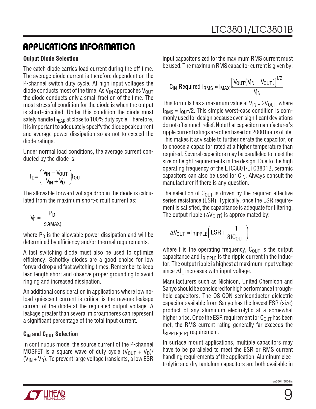 LTC3801/LTC3801B UUWUAPPLICATIO S I FOR ATIOOutput Diode Selection input capacitor sized for the maximum RMS current must be used. The maximum RMS capacitor current is given by: The catch diode carries load current during the off-time. The average diode current is therefore dependent on the / P-channel switch duty cycle. At high input voltages the V [ (V −V )]12 OUT IN OUT C I Required ≈ I diode conducts most of the time. As V IN RMS MAX IN approaches VOUT VIN the diode conducts only a small fraction of the time. The most stressful condition for the diode is when the output This formula has a maximum value at VIN = 2VOUT, where is short-circuited. Under this condition the diode must IRMS = IOUT/2. This simple worst-case condition is com- safely handle I monly used for design because even significant deviations PEAK at close to 100% duty cycle. Therefore, it is important to adequately specify the diode peak current do not offer much relief. Note that capacitor manufacturer’s and average power dissipation so as not to exceed the ripple current ratings are often based on 2000 hours of life. diode ratings. This makes it advisable to further derate the capacitor, or to choose a capacitor rated at a higher temperature than Under normal load conditions, the average current con- required. Several capacitors may be paralleled to meet the ducted by the diode is: size or height requirements in the design. Due to the high operating frequency of the LTC3801/LTC3801B, ceramic V V I IN OUT = − I D OUT capacitors can also be used for C IN. Always consult the V + V IN D manufacturer if there is any question. The allowable forward voltage drop in the diode is calcu- The selection of COUT is driven by the required effective lated from the maximum short-circuit current as: series resistance (ESR). Typically, once the ESR require- ment is satisfied, the capacitance is adequate for filtering. P V D The output ripple (∆VOUT) is approximated by: F ≈ ISC MAX ( ) ∆ ≈ + 1 where P V I ESR OUT RIPPLE D is the allowable power dissipation and will be 8fCOUT determined by efficiency and/or thermal requirements. where f is the operating frequency, C A fast switching diode must also be used to optimize OUT is the output capacitance and I efficiency. Schottky diodes are a good choice for low RIPPLE is the ripple current in the induc- tor. The output ripple is highest at maximum input voltage forward drop and fast switching times. Remember to keep since ∆I lead length short and observe proper grounding to avoid L increases with input voltage. ringing and increased dissipation. Manufacturers such as Nichicon, United Chemicon and Sanyo should be considered for high performance through- An additional consideration in applications where low no- hole capacitors. The OS-CON semiconductor dielectric load quiescent current is critical is the reverse leakage capacitor available from Sanyo has the lowest ESR (size) current of the diode at the regulated output voltage. A product of any aluminum electrolytic at a somewhat leakage greater than several microamperes can represent higher price. Once the ESR requirement for C a significant percentage of the total input current. OUT has been met, the RMS current rating generally far exceeds the C I IN and COUT Selection RIPPLE(P-P) requirement. In continuous mode, the source current of the P-channel In surface mount applications, multiple capacitors may MOSFET is a square wave of duty cycle (V have to be paralleled to meet the ESR or RMS current OUT + VD)/ (V handling requirements of the application. Aluminum elec- IN + VD). To prevent large voltage transients, a low ESR trolytic and dry tantalum capacitors are both available in sn3801 3801fs 9