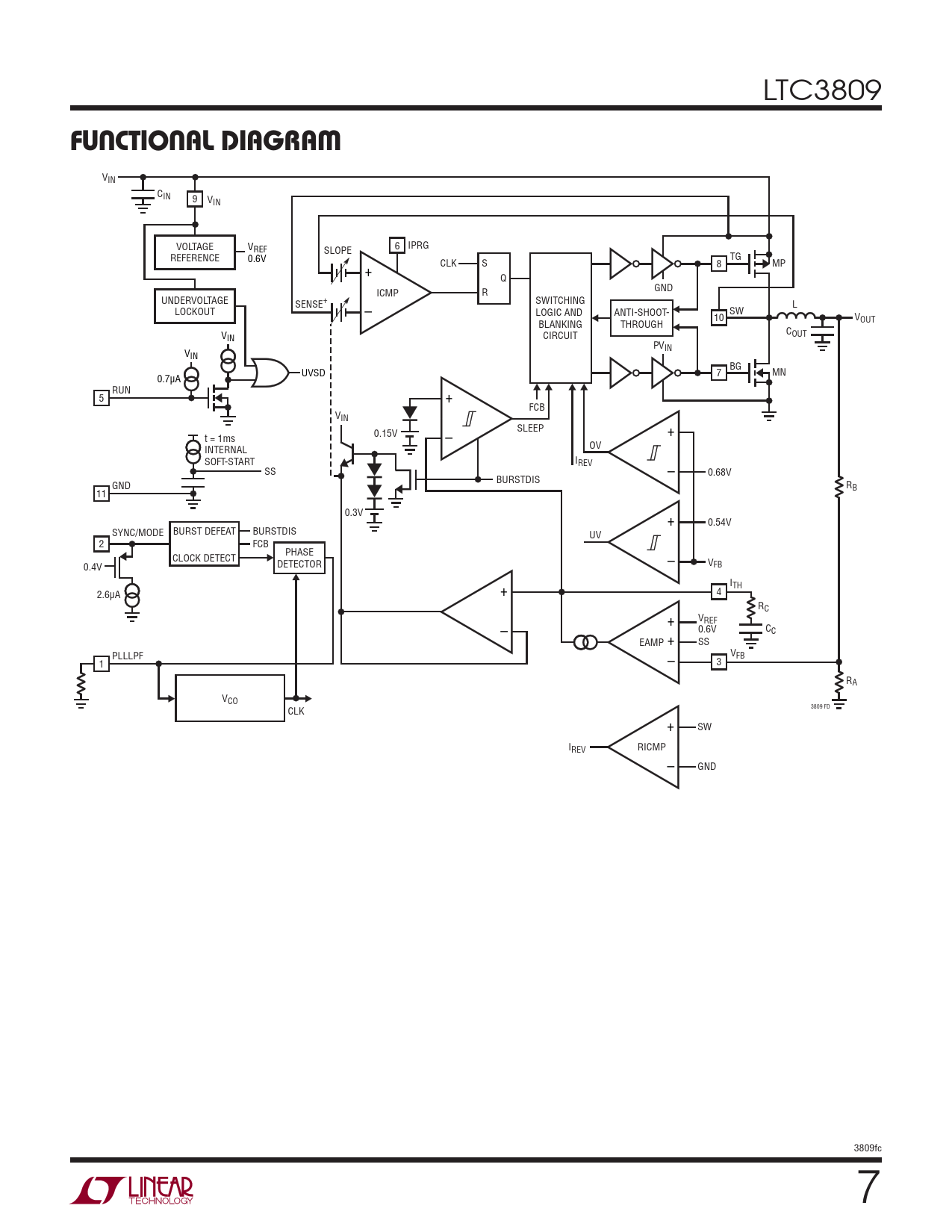 VIN CIN 9 VIN VOLTAGE V 6 IPRG REF SLOPE REFERENCE TG 0.6V CLK S 8 MP + Q GND ICMP R UNDERVOLTAGE SENSE+ SWITCHING L LOCKOUT – LOGIC AND ANTI-SHOOT- SW 10 V BLANKING THROUGH OUT COUT VIN CIRCUIT PVIN VIN BG UVSD 7 MN 0.7μA RUN 5 + FCB VIN SLEEP 0.15V + t = 1ms – OV INTERNAL SOFT-START IREV SS – 0.68V BURSTDIS GND RB 11 0.3V + 0.54V SYNC/MODE BURST DEFEAT BURSTDIS UV 2 FCB PHASE CLOCK DETECT DETECTOR – VFB 0.4V I 2.6μA + TH 4 RC VREF + – 0.6V CC EAMP + SS V PLLLPF FB 1 – 3 RA VCO 3809 FD CLK + SW I RICMP REV – GND 3809fc 7