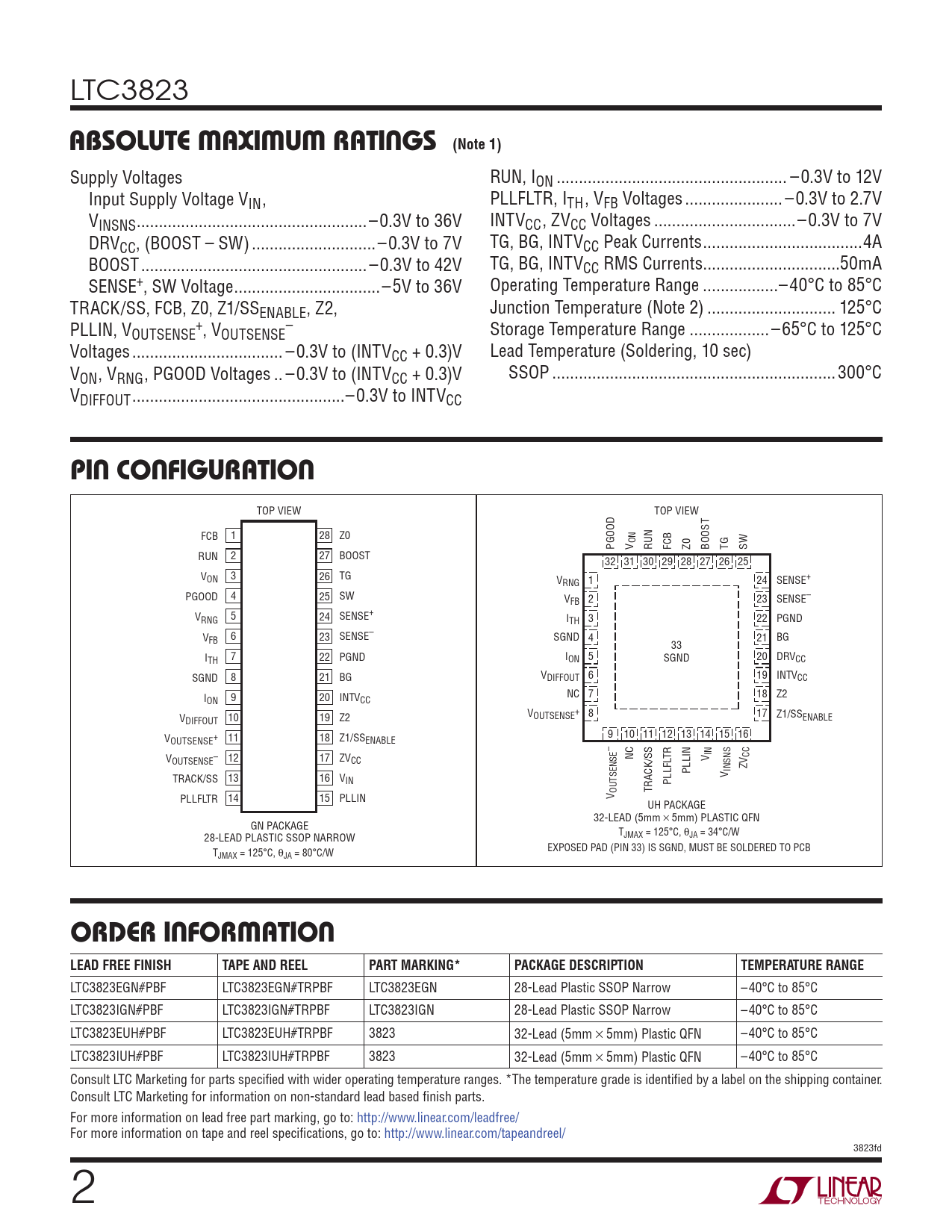 LTC3823 ABSOLUTE MAXIMUM RATINGS (Note 1) Supply Voltages RUN, ION .. –0.3V to 12V Input Supply Voltage VIN, PLLFLTR, ITH, VFB Voltages .. –0.3V to 2.7V VINSNS ..–0.3V to 36V INTVCC, ZVCC Voltages ..–0.3V to 7V DRVCC, (BOOST – SW) ..–0.3V to 7V TG, BG, INTVCC Peak Currents ..4A BOOST ... –0.3V to 42V TG, BG, INTVCC RMS Currents ...50mA SENSE+, SW Voltage ...–5V to 36V Operating Temperature Range ...–40°C to 85°C TRACK/SS, FCB, Z0, Z1/SSENABLE, Z2, Junction Temperature (Note 2) ... 125°C PLLIN, V + – OUTSENSE , VOUTSENSE Storage Temperature Range .. –65°C to 125°C Voltages .. –0.3V to (INTVCC + 0.3)V Lead Temperature (Soldering, 10 sec) VON, VRNG, PGOOD Voltages .. –0.3V to (INTVCC + 0.3)V SSOP .. 300°C VDIFFOUT ..–0.3V to INTVCC PIN CONFIGURATION TOP VIEW TOP VIEW FCB 1 28 Z0 ON PGOOD V RUN FCB Z0 BOOST TG SW RUN 2 27 BOOST 32 31 30 29 28 27 26 25 V 3 26 ON TG V 1 24 RNG SENSE+ PGOOD 4 25 SW V 2 23 FB SENSE– V 5 24 RNG SENSE+ ITH 3 22 PGND V 6 23 FB SENSE– SGND 4 21 BG 33 I 7 22 TH PGND I 5 ON SGND 20 DRVCC SGND 8 21 BG VDIFFOUT 6 19 INTVCC I 9 20 NC 7 18 Z2 ON INTVCC V + V 10 19 8 17 OUTSENSE Z1/SS DIFFOUT Z2 ENABLE V + 11 18 9 10 11 12 13 14 15 16 OUTSENSE Z1/SSENABLE – IN V – 12 17 NC TR CC OUTSENSE ZVCC V PLLIN INSNS ZV V TRACK/SS 13 16 VIN PLLFL OUTSENSE TRACK/SS PLLFLTR 14 15 PLLIN V UH PACKAGE 32-LEAD (5mm s 5mm) PLASTIC QFN GN PACKAGE TJMAX = 125°C, θJA = 34°C/W 28-LEAD PLASTIC SSOP NARROW EXPOSED PAD (PIN 33) IS SGND, MUST BE SOLDERED TO PCB TJMAX = 125°C, θJA = 80°C/W ORDER INFORMATION LEAD FREE FINISHTAPE AND REELPART MARKING*PACKAGE DESCRIPTIONTEMPERATURE RANGE LTC3823EGN#PBF LTC3823EGN#TRPBF LTC3823EGN 28-Lead Plastic SSOP Narrow –40°C to 85°C LTC3823IGN#PBF LTC3823IGN#TRPBF LTC3823IGN 28-Lead Plastic SSOP Narrow –40°C to 85°C LTC3823EUH#PBF LTC3823EUH#TRPBF 3823 32-Lead (5mm × 5mm) Plastic QFN –40°C to 85°C LTC3823IUH#PBF LTC3823IUH#TRPBF 3823 32-Lead (5mm × 5mm) Plastic QFN –40°C to 85°C Consult LTC Marketing for parts specifi ed with wider operating temperature ranges. *The temperature grade is identifi ed by a label on the shipping container. Consult LTC Marketing for information on non-standard lead based fi nish parts. For more information on lead free part marking, go to: http://www.linear.com/leadfree/ For more information on tape and reel specifi cations, go to: http://www.linear.com/tapeandreel/ 3823fd 2
