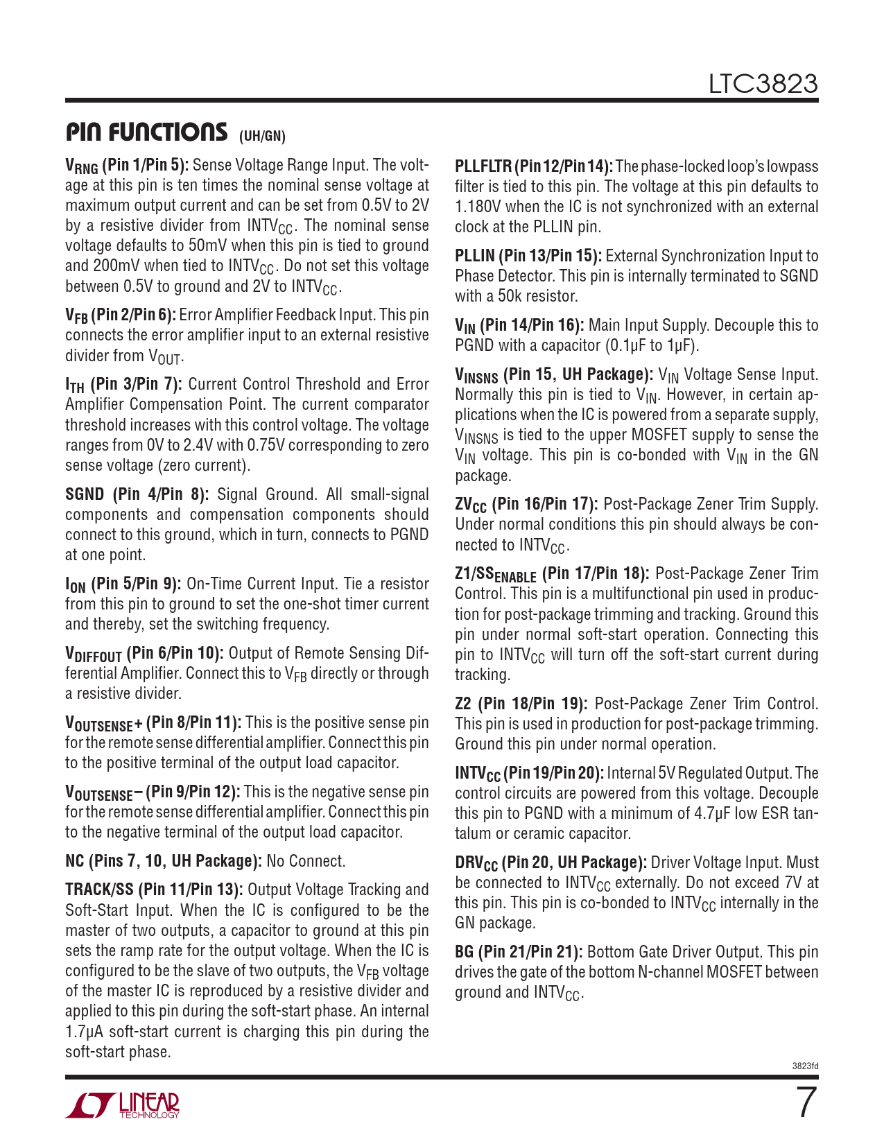 PIN FUNCTIONS (UH/GN) VRNG (Pin 1/Pin 5): PLLFLTR (Pin 12/Pin 14): PLLIN (Pin 13/Pin 15): VFB (Pin 2/Pin 6):