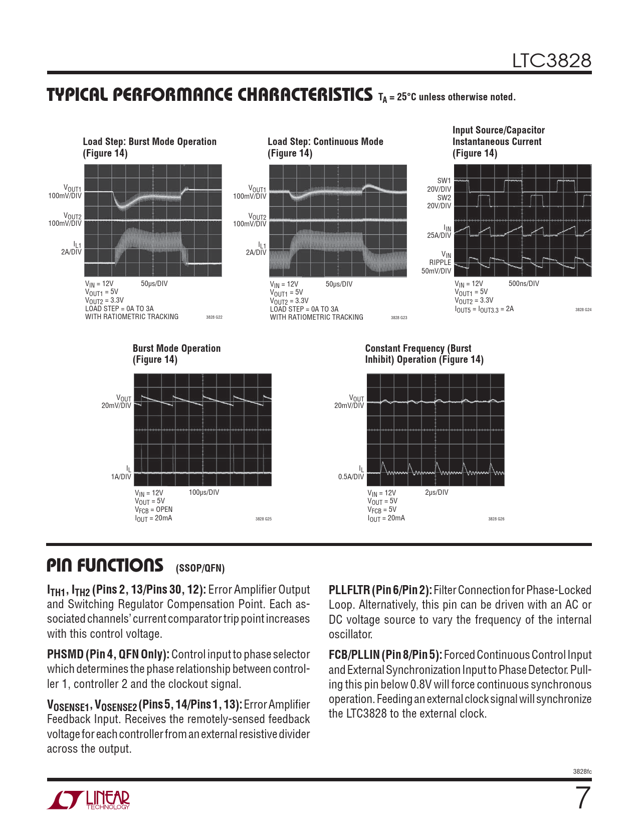 LTC3828 TYPICAL PERFORMANCE CHARACTERISTICS TA = 25°C unless otherwise noted.Input Source/CapacitorLoad Step: Burst Mode OperationLoad Step: Continuous ModeInstantaneous Current(Figure 14)(Figure 14)(Figure 14) SW1 VOUT1 VOUT1 20V/DIV 100mV/DIV 100mV/DIV SW2 20V/DIV VOUT2 VOUT2 100mV/DIV 100mV/DIV IIN 25A/DIV IL1 IL1 2A/DIV 2A/DIV VIN RIPPLE 50mV/DIV V 50μs/DIV IN = 12V V 50μs/DIV IN = 12V V 500ns/DIV IN = 12V VOUT1 = 5V VOUT1 = 5V VOUT1 = 5V VOUT2 = 3.3V VOUT2 = 3.3V VOUT2 = 3.3V LOAD STEP = 0A TO 3A LOAD STEP = 0A TO 3A I 3828 G24 OUT5 = IOUT3.3 = 2A WITH RATIOMETRIC TRACKING 3828 G22 WITH RATIOMETRIC TRACKING 3828 G23 Burst Mode OperationConstant Frequency (Burst(Figure 14)Inhibit) Operation (Figure 14) VOUT VOUT 20mV/DIV 20mV/DIV IL IL 1A/DIV 0.5A/DIV V 100μs/DIV IN = 12V V 2μs/DIV IN = 12V VOUT = 5V VOUT = 5V VFCB = OPEN VFCB = 5V I 3828 G25 OUT = 20mA I 3828 G26 OUT = 20mA PIN FUNCTIONS (SSOP/QFN)ITH1, ITH2 (Pins 2, 13/Pins 30, 12): Error Amplifi er Output PLLFLTR (Pin 6/Pin 2): Filter Connection for Phase-Locked and Switching Regulator Compensation Point. Each as- Loop. Alternatively, this pin can be driven with an AC or sociated channels’ current comparator trip point increases DC voltage source to vary the frequency of the internal with this control voltage. oscillator. PHSMD (Pin 4, QFN Only): Control input to phase selector FCB/PLLIN (Pin 8/Pin 5): Forced Continuous Control Input which determines the phase relationship between control- and External Synchronization Input to Phase Detector. Pull- ler 1, controller 2 and the clockout signal. ing this pin below 0.8V will force continuous synchronous V operation. Feeding an external clock signal will synchronize OSENSE1, VOSENSE2 (Pins 5, 14/Pins 1, 13): Error Amplifi er Feedback Input. Receives the remotely-sensed feedback the LTC3828 to the external clock. voltage for each controller from an external resistive divider across the output. 3828fc 7