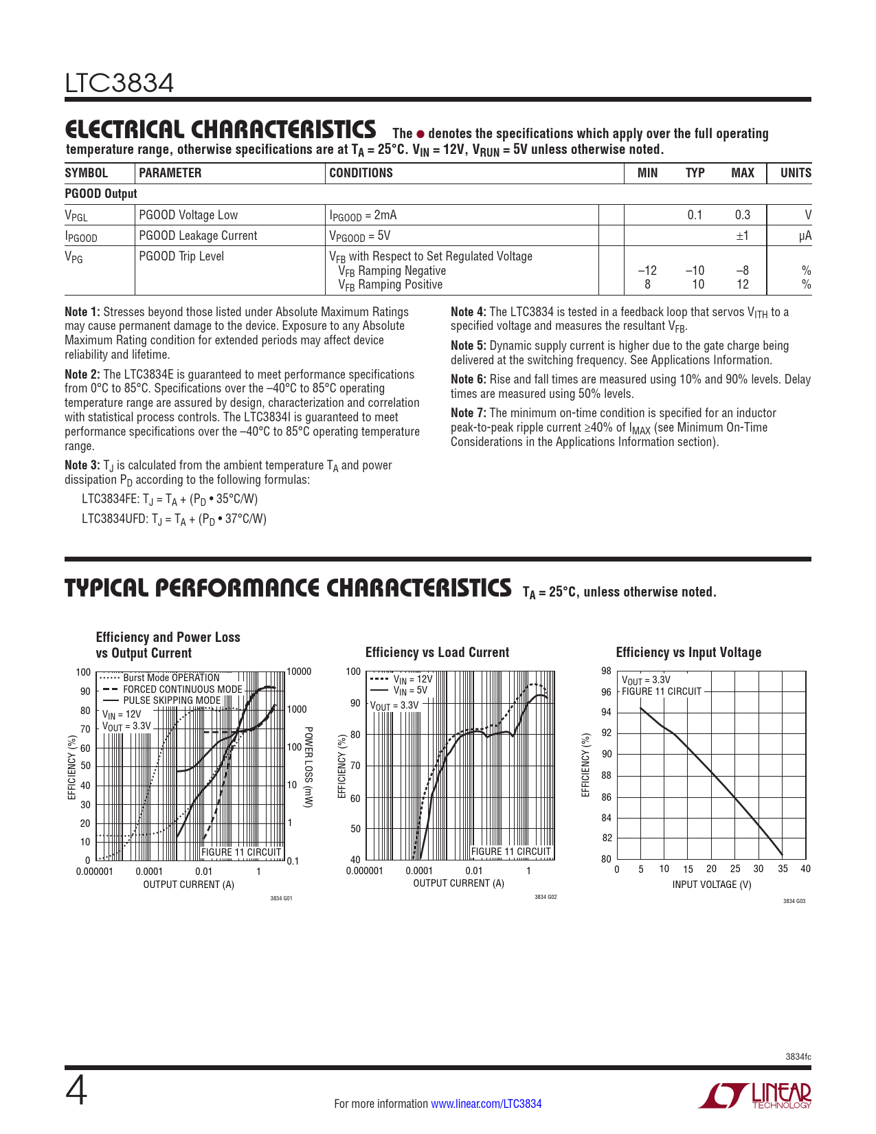 LTC3834 ELECTRICALCHARACTERISTICS The l denotes the specifications which apply over the full operatingtemperature range, otherwise specifications are at TA = 25°C. VIN = 12V, VRUN = 5V unless otherwise noted.SYMBOLPARAMETERCONDITIONSMINTYPMAXUNITSPGOOD Output VPGL PGOOD Voltage Low IPGOOD = 2mA 0.1 0.3 V IPGOOD PGOOD Leakage Current VPGOOD = 5V ±1 µA VPG PGOOD Trip Level VFB with Respect to Set Regulated Voltage VFB Ramping Negative –12 –10 –8 % VFB Ramping Positive 8 10 12 % Note 1: Stresses beyond those listed under Absolute Maximum Ratings Note 4: The LTC3834 is tested in a feedback loop that servos VITH to a may cause permanent damage to the device. Exposure to any Absolute specified voltage and measures the resultant VFB. Maximum Rating condition for extended periods may affect device Note 5: Dynamic supply current is higher due to the gate charge being reliability and lifetime. delivered at the switching frequency. See Applications Information. Note 2: The LTC3834E is guaranteed to meet performance specifications Note 6: Rise and fall times are measured using 10% and 90% levels. Delay from 0°C to 85°C. Specifications over the –40°C to 85°C operating times are measured using 50% levels. temperature range are assured by design, characterization and correlation with statistical process controls. The LTC3834I is guaranteed to meet Note 7: The minimum on-time condition is specified for an inductor performance specifications over the –40°C to 85°C operating temperature peak-to-peak ripple current ≥40% of IMAX (see Minimum On-Time range. Considerations in the Applications Information section). Note 3: TJ is calculated from the ambient temperature TA and power dissipation PD according to the following formulas: LTC3834FE: TJ = TA + (PD • 35°C/W) LTC3834UFD: TJ = TA + (PD • 37°C/W) TYPICAL PERFORMANCE CHARACTERISTICS TA = 25°C, unless otherwise noted.Efficiency and Power Lossvs Output CurrentEfficiency vs Load CurrentEfficiency vs Input Voltage 100 10000 98 Burst Mode OPERATION 100 VIN = 12V VOUT = 3.3V 90 FORCED CONTINUOUS MODE VIN = 5V 96 FIGURE 11 CIRCUIT PULSE SKIPPING MODE 90 80 1000 VOUT = 3.3V VIN = 12V 94 V POWER LOSS (mW) 70 OUT = 3.3V 80 92 60 100 90 50 70 88 40 10 EFFICIENCY (%) EFFICIENCY (%) EFFICIENCY (%) 86 30 60 20 1 84 50 10 82 FIGURE 11 CIRCUIT FIGURE 11 CIRCUIT 0 0.1 40 80 0.000001 0.0001 0.01 1 0.000001 0.0001 0.01 1 0 5 10 15 20 25 30 35 40 OUTPUT CURRENT (A) OUTPUT CURRENT (A) INPUT VOLTAGE (V) 3834 G01 3834 G02 3834 G03 3834fc 4 For more information www.linear.com/LTC3834 Document Outline Features Description Applications Typical Application Absolute Maximum Ratings Pin Configuration Electrical Characteristics Typical Performance Characteristics Pin Functions Operation Package Description Typical Application Related Parts