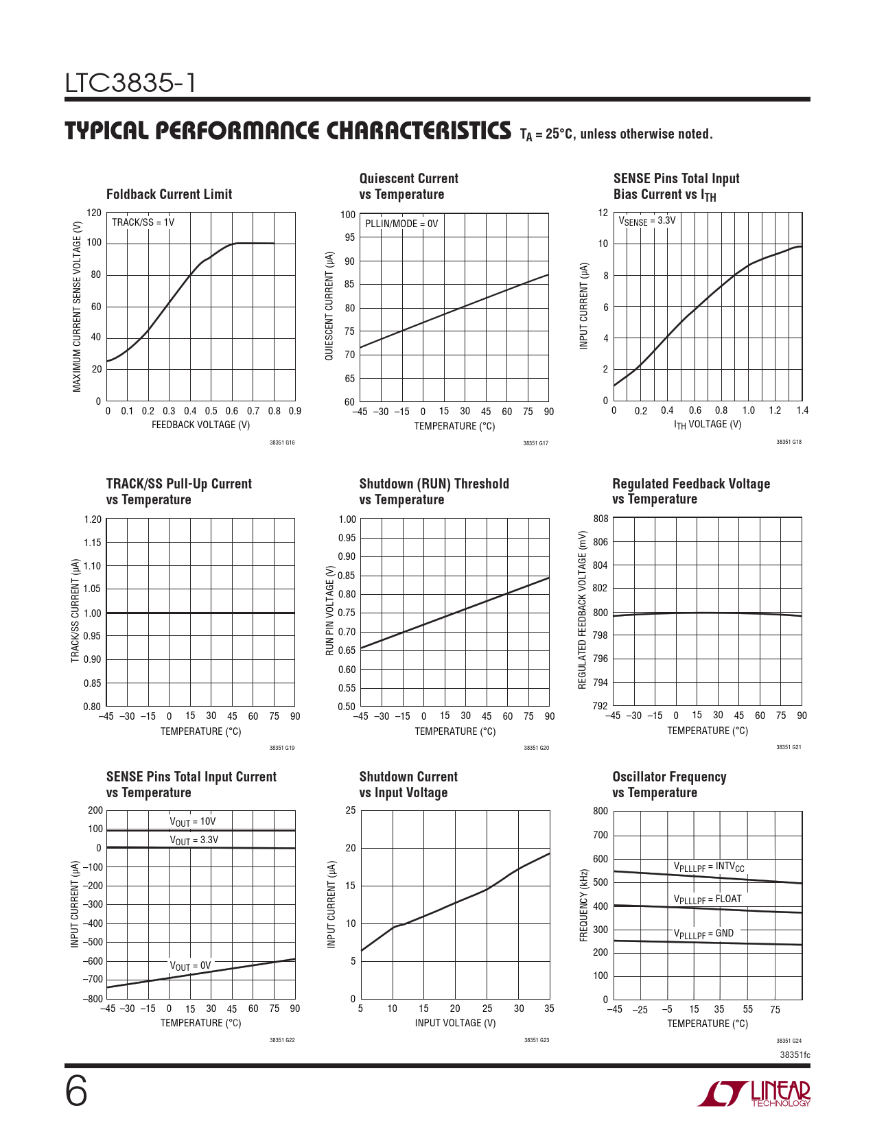 200 25 800 VOUT = 10V 100 V 700 OUT = 3.3V 0 20 600 –100 VPLLLPF = INTVCC –200 15 500 V –300 PLLLPF = FLOAT 400 –400 10 300 V FREQUENCY (kHz) PLLLPF = GND INPUT CURRENT (μA) –500 INPUT CURRENT (μA) 200 –600 V 5 OUT = 0V –700 100 –800 0 0 –45 –30 –15 0 15 30 45 60 75 90 5 10 15 20 25 30 35 –45 –25 –5 15 35 55 75 TEMPERATURE (°C) INPUT VOLTAGE (V) TEMPERATURE (°C) 38351 G22 38351 G23 38351 G24 38351fc 6