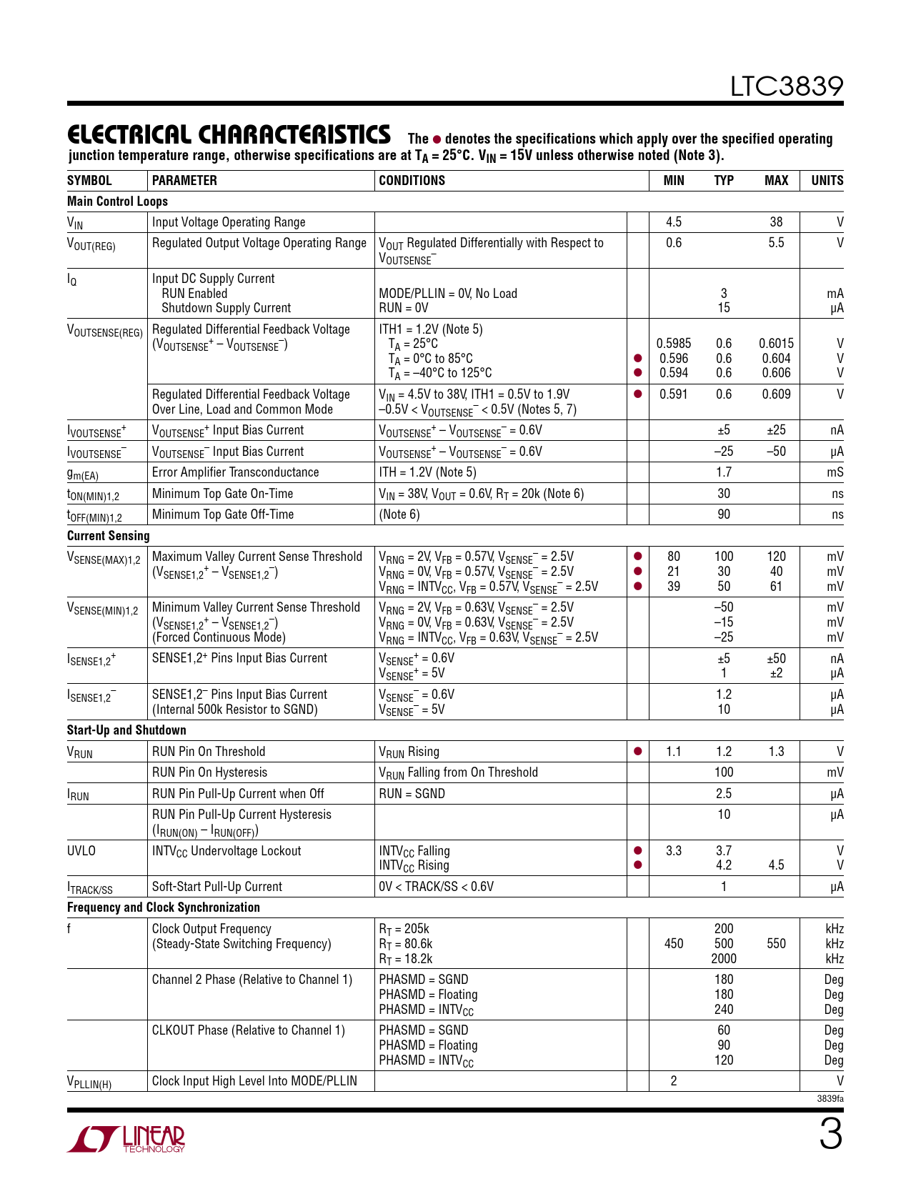 LTC3839 ELECTRICAL CHARACTERISTICSThe l denotes the specifications which apply over the specified operatingjunction temperature range, otherwise specifications are at TA = 25°C. VIN = 15V unless otherwise noted (Note 3).SYMBOLPARAMETERCONDITIONSMINTYPMAXUNITSMain Control Loops VIN Input Voltage Operating Range 4.5 38 V VOUT(REG) Regulated Output Voltage Operating Range VOUT Regulated Differentially with Respect to 0.6 5.5 V V – OUTSENSE IQ Input DC Supply Current RUN Enabled MODE/PLLIN = 0V, No Load 3 mA Shutdown Supply Current RUN = 0V 15 µA VOUTSENSE(REG) Regulated Differential Feedback Voltage ITH1 = 1.2V (Note 5) (V + – OUTSENSE – VOUTSENSE ) TA = 25°C 0.5985 0.6 0.6015 V TA = 0°C to 85°C l 0.596 0.6 0.604 V TA = –40°C to 125°C l 0.594 0.6 0.606 V Regulated Differential Feedback Voltage VIN = 4.5V to 38V, ITH1 = 0.5V to 1.9V l 0.591 0.6 0.609 V Over Line, Load and Common Mode –0.5V < V – OUTSENSE < 0.5V (Notes 5, 7) I + + + – VOUTSENSE VOUTSENSE Input Bias Current VOUTSENSE – VOUTSENSE = 0.6V ±5 ±25 nA I – – + – VOUTSENSE VOUTSENSE Input Bias Current VOUTSENSE – VOUTSENSE = 0.6V –25 –50 µA gm(EA) Error Amplifier Transconductance ITH = 1.2V (Note 5) 1.7 mS tON(MIN)1,2 Minimum Top Gate On-Time VIN = 38V, VOUT = 0.6V, RT = 20k (Note 6) 30 ns tOFF(MIN)1,2 Minimum Top Gate Off-Time (Note 6) 90 ns Current Sensing V – SENSE(MAX)1,2 Maximum Valley Current Sense Threshold VRNG = 2V, VFB = 0.57V, VSENSE = 2.5V l 80 100 120 mV (V + – – SENSE1,2 – VSENSE1,2 ) VRNG = 0V, VFB = 0.57V, VSENSE = 2.5V l 21 30 40 mV V – RNG = INTVCC, VFB = 0.57V, VSENSE = 2.5V l 39 50 61 mV V – SENSE(MIN)1,2 Minimum Valley Current Sense Threshold VRNG = 2V, VFB = 0.63V, VSENSE = 2.5V –50 mV (V + – – SENSE1,2 – VSENSE1,2 ) VRNG = 0V, VFB = 0.63V, VSENSE = 2.5V –15 mV (Forced Continuous Mode) V – RNG = INTVCC, VFB = 0.63V, VSENSE = 2.5V –25 mV I + + SENSE1,2 SENSE1,2+ Pins Input Bias Current VSENSE = 0.6V ±5 ±50 nA V + SENSE = 5V 1 ±2 µA I – – SENSE1,2 SENSE1,2– Pins Input Bias Current VSENSE = 0.6V 1.2 µA (Internal 500k Resistor to SGND) V – SENSE = 5V 10 µA Start-Up and Shutdown VRUN RUN Pin On Threshold VRUN Rising l 1.1 1.2 1.3 V RUN Pin On Hysteresis VRUN Falling from On Threshold 100 mV IRUN RUN Pin Pull-Up Current when Off RUN = SGND 2.5 µA RUN Pin Pull-Up Current Hysteresis 10 µA (IRUN(ON) – IRUN(OFF)) UVLO INTVCC Undervoltage Lockout INTVCC Falling l 3.3 3.7 V INTVCC Rising l 4.2 4.5 V ITRACK/SS Soft-Start Pull-Up Current 0V < TRACK/SS < 0.6V 1 µA Frequency and Clock Synchronization f Clock Output Frequency RT = 205k 200 kHz (Steady-State Switching Frequency) RT = 80.6k 450 500 550 kHz RT = 18.2k 2000 kHz Channel 2 Phase (Relative to Channel 1) PHASMD = SGND 180 Deg PHASMD = Floating 180 Deg PHASMD = INTVCC 240 Deg CLKOUT Phase (Relative to Channel 1) PHASMD = SGND 60 Deg PHASMD = Floating 90 Deg PHASMD = INTVCC 120 Deg VPLLIN(H) Clock Input High Level Into MODE/PLLIN 2 V 3839fa 3 Document Outline Features Applications Description Typical Application Absolute Maximum Ratings Pin Configuration Order Information Typical Performance Characteristics Pin Functions Functional Diagram Operation Typical Applications Typical Application Related Parts