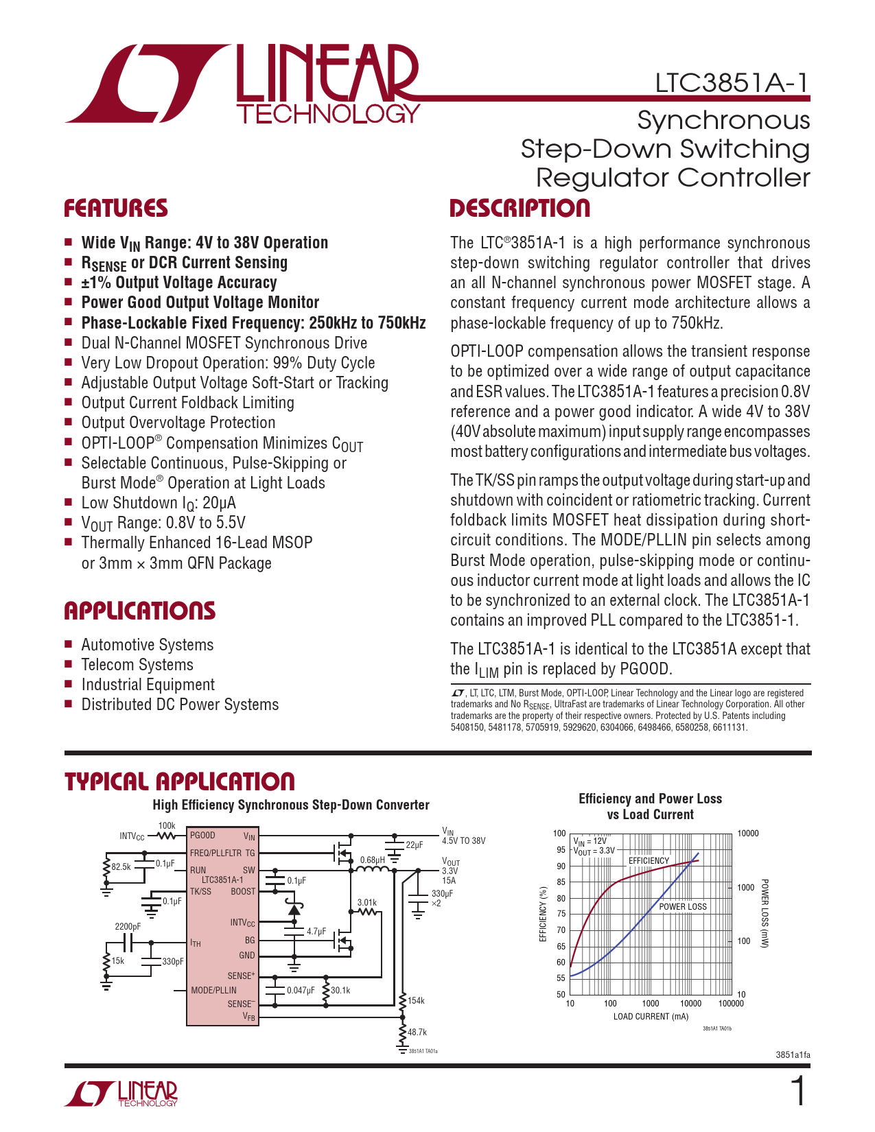 LTC3851A-1 Synchronous Step-Down Switching Regulator Controller FeaTuresDescripTion n Wide VIN Range: 4V to 38V Operation The LTC®3851A-1 is a high performance synchronous n RSENSE or DCR Current Sensing step-down switching regulator controller that drives n ±1% Output Voltage Accuracy an all N-channel synchronous power MOSFET stage. A n Power Good Output Voltage Monitor con stant frequency current mode architecture allows a n Phase-Lockable Fixed Frequency: 250kHz to 750kHz phase-lockable frequency of up to 750kHz. n Dual N-Channel MOSFET Synchronous Drive OPTI-LOOP compensation al ows the transient response n Very Low Dropout Operation: 99% Duty Cycle to be optimized over a wide range of output capacitance n Adjustable Output Voltage Soft-Start or Tracking and ESR values. The LTC3851A-1 features a precision 0.8V n Output Current Foldback Limiting reference and a power good indicator. A wide 4V to 38V n Output Overvoltage Protection (40V absolute maximum) input supply range encompasses n OPTI-LOOP® Compensation Minimizes COUT most battery configurations and intermediate bus voltages. n Selectable Continuous, Pulse-Skipping or Burst Mode® Operation at Light Loads The TK/SS pin ramps the output voltage during start-up and n Low Shutdown I shutdown with coincident or ratiometric tracking. Current Q: 20µA n V foldback limits MOSFET heat dissipation during short- OUT Range: 0.8V to 5.5V n Thermally Enhanced 16-Lead MSOP circuit conditions. The MODE/PLLIN pin selects among or 3mm × 3mm QFN Package Burst Mode operation, pulse-skipping mode or continu- ous inductor current mode at light loads and allows the IC applicaTions to be synchronized to an external clock. The LTC3851A-1 contains an improved PLL compared to the LTC3851-1. n Automotive Systems The LTC3851A-1 is identical to the LTC3851A except that n Telecom Systems the ILIM pin is replaced by PGOOD. n Industrial Equipment L, LT, LTC, LTM, Burst Mode, OPTI-LOOP, Linear Technology and the Linear logo are registered n Distributed DC Power Systems trademarks and No RSENSE, UltraFast are trademarks of Linear Technology Corporation. All other trademarks are the property of their respective owners. Protected by U.S. Patents including 5408150, 5481178, 5705919, 5929620, 6304066, 6498466, 6580258, 6611131. Typical applicaTionHigh Efficiency Synchronous Step-Down ConverterEfficiency and Power Lossvs Load Current 100k INTV VIN CC PGO0D VIN 100 10000 22µF 4.5V TO 38V VIN = 12V FREQ/PLLFLTR TG 95 VOUT = 3.3V 0.68µH V 0.1µF OUT EFFICIENCY 82.5k RUN SW 3.3V 90 LTC3851A-1 0.1µF 15A POWER LOSS (mW) 85 TK/SS BOOST 1000 330µF 0.1µF 3.01k ×2 80 POWER LOSS 75 INTVCC 2200pF 4.7µF 70 I EFFICIENCY (%) TH BG 100 65 GND 15k 330pF 60 SENSE+ 55 MODE/PLLIN 0.047µF 30.1k 50 10 SENSE– 154k 10 100 1000 10000 100000 VFB LOAD CURRENT (mA) 48.7k 3851A1 TA01b 3851A1 TA01a 3851a1fa 1 Document Outline Features Applications Description Typical Application Absolute Maximum Ratings Pin Configuration Order Information Electrical Characteristics Typical Performance Characteristics Pin Functions Functional Diagram Operation Applications Information Typical Applications Package Description Revision History Typical Application Related Parts