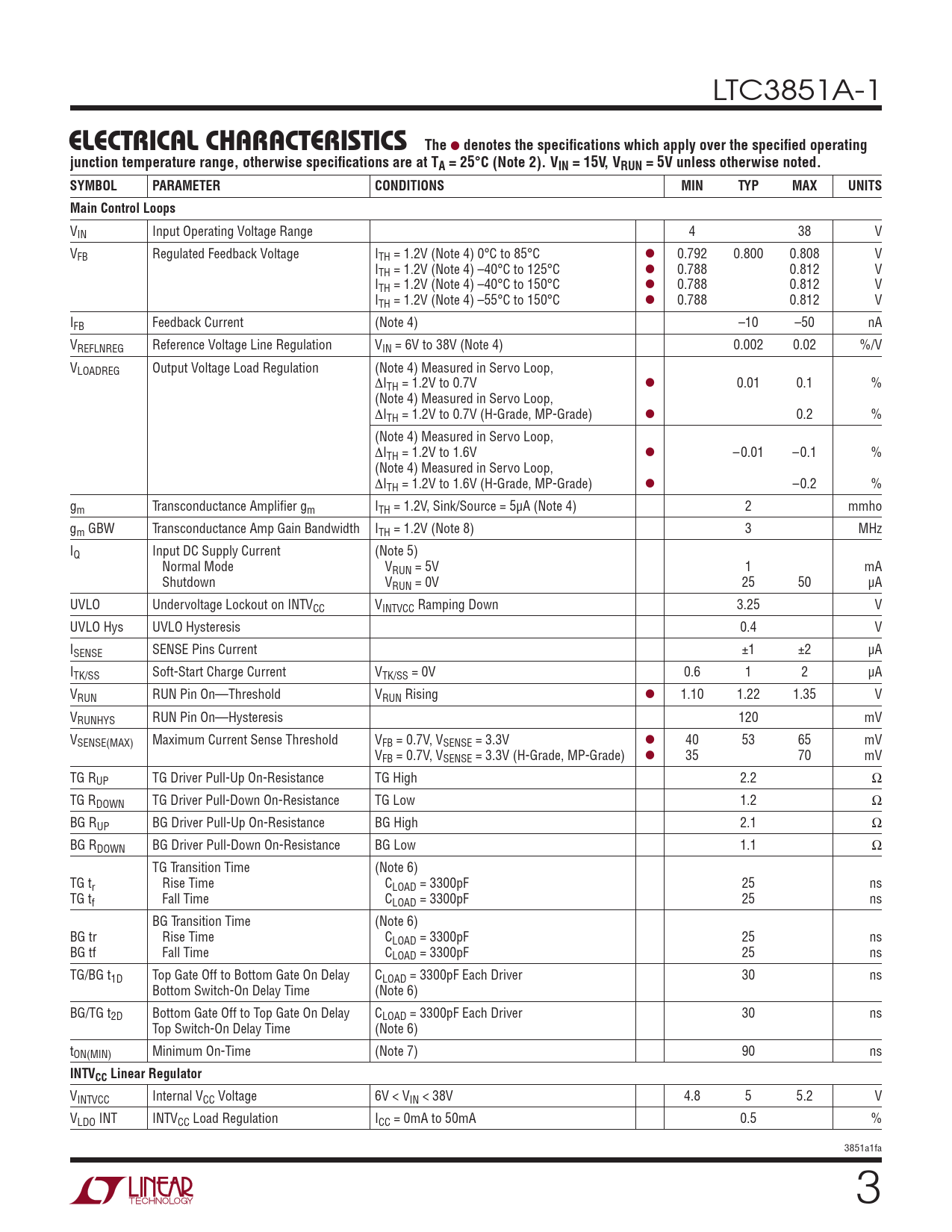 VIN Input Operating Voltage Range 4 38 V VFB Regulated Feedback Voltage ITH = 1.2V (Note 4) 0°C to 85°C l 0.792 0.800 0.808 V ITH = 1.2V (Note 4) –40°C to 125°C l 0.788 0.812 V ITH = 1.2V (Note 4) –40°C to 150°C l 0.788 0.812 V ITH = 1.2V (Note 4) –55°C to 150°C l 0.788 0.812 V IFB Feedback Current (Note 4) –10 –50 nA VREFLNREG Reference Voltage Line Regulation VIN = 6V to 38V (Note 4) 0.002 0.02 %/V VLOADREG Output Voltage Load Regulation (Note 4) Measured in Servo Loop, ∆ITH = 1.2V to 0.7V l 0.01 0.1 % (Note 4) Measured in Servo Loop, ∆ITH = 1.2V to 0.7V (H-Grade, MP-Grade) l 0.2 % (Note 4) Measured in Servo Loop, ∆ITH = 1.2V to 1.6V l –0.01 –0.1 % (Note 4) Measured in Servo Loop, ∆ITH = 1.2V to 1.6V (H-Grade, MP-Grade) l –0.2 % gm Transconductance Amplifier gm ITH = 1.2V, Sink/Source = 5µA (Note 4) 2 mmho gm GBW Transconductance Amp Gain Bandwidth ITH = 1.2V (Note 8) 3 MHz IQ Input DC Supply Current (Note 5) Normal Mode VRUN = 5V 1 mA Shutdown VRUN = 0V 25 50 µA UVLO Undervoltage Lockout on INTVCC VINTVCC Ramping Down 3.25 V UVLO Hys UVLO Hysteresis 0.4 V ISENSE SENSE Pins Current ±1 ±2 µA ITK/SS Soft-Start Charge Current VTK/SS = 0V 0.6 1 2 µA VRUN RUN Pin On—Threshold VRUN Rising l 1.10 1.22 1.35 V VRUNHYS RUN Pin On—Hysteresis 120 mV VSENSE(MAX) Maximum Current Sense Threshold VFB = 0.7V, VSENSE = 3.3V l 40 53 65 mV VFB = 0.7V, VSENSE = 3.3V (H-Grade, MP-Grade) l 35 70 mV TG RUP TG Driver Pull-Up On-Resistance TG High 2.2 Ω TG RDOWN TG Driver Pull-Down On-Resistance TG Low 1.2 Ω BG RUP BG Driver Pull-Up On-Resistance BG High 2.1 Ω BG RDOWN BG Driver Pull-Down On-Resistance BG Low 1.1 Ω TG Transition Time (Note 6) TG tr Rise Time CLOAD = 3300pF 25 ns TG tf Fall Time CLOAD = 3300pF 25 ns BG Transition Time (Note 6) BG tr Rise Time CLOAD = 3300pF 25 ns BG tf Fall Time CLOAD = 3300pF 25 ns TG/BG t1D Top Gate Off to Bottom Gate On Delay CLOAD = 3300pF Each Driver 30 ns Bottom Switch-On Delay Time (Note 6) BG/TG t2D Bottom Gate Off to Top Gate On Delay CLOAD = 3300pF Each Driver 30 ns Top Switch-On Delay Time (Note 6) tON(MIN) Minimum On-Time (Note 7) 90 ns