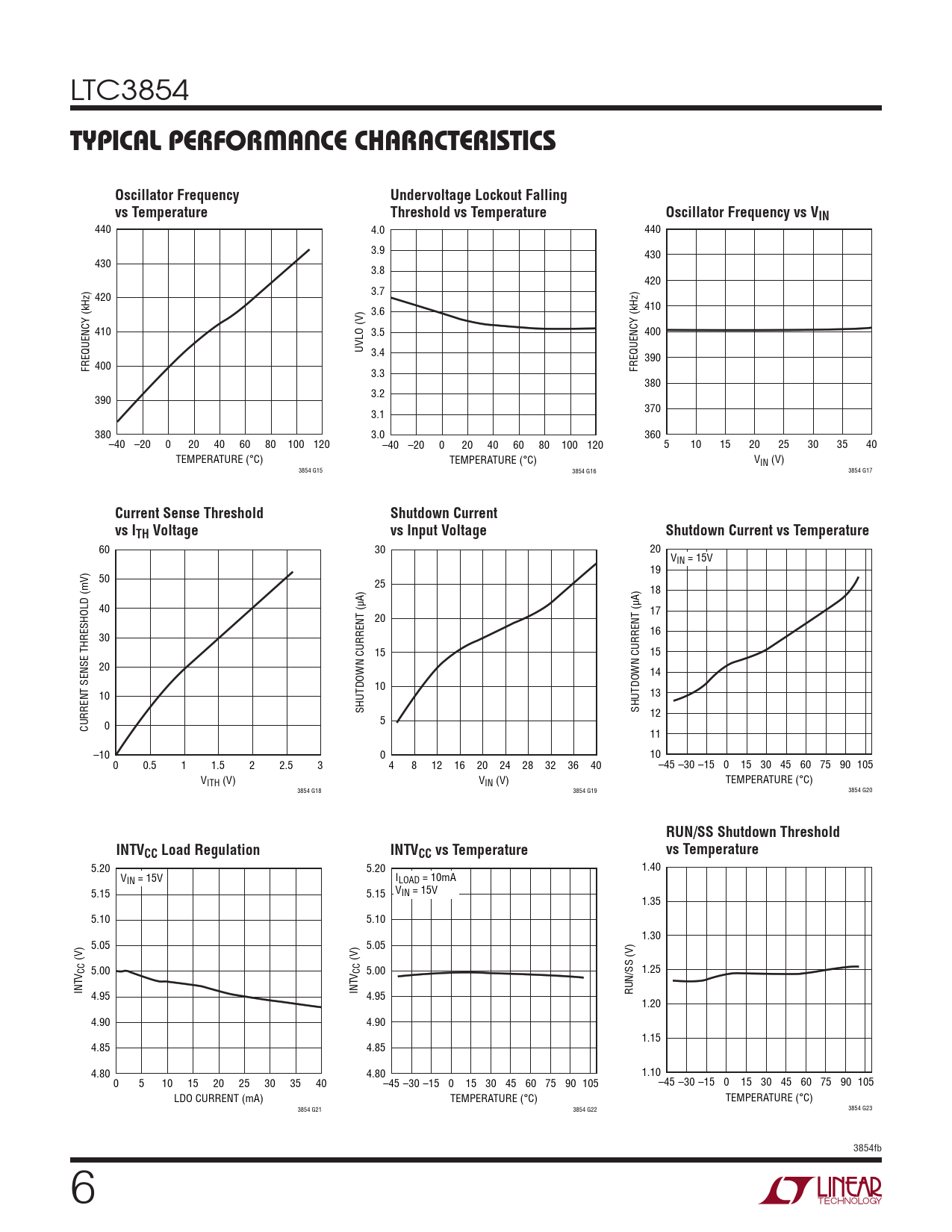 5.20 5.20 1.40 VIN = 15V ILOAD = 10mA 5.15 5.15 VIN = 15V 1.35 5.10 5.10 1.30 5.05 5.05 (V) (V) V CC 5.00 V CC 5.00 1.25 INT 4.95 INT 4.95 RUN/SS (V) 1.20 4.90 4.90 1.15 4.85 4.85 4.80 4.80 1.10 0 5 10 15 20 25 30 35 40 –45 –30 –15 0 15 30 45 60 75 90 105 –45 –30 –15 0 15 30 45 60 75 90 105 LDO CURRENT (mA) TEMPERATURE (°C) TEMPERATURE (°C) 3854 G21 3854 G22 3854 G23 3854fb 6 Document Outline Features Description Applications Typical Application Absolute Maximum Ratings Pin Configuration Order Information Electrical Characteristics Typical Performance Characteristics Pin Functions Functional Diagram Operation Applications Information Typical Applications Package Description Revision History Related Parts
