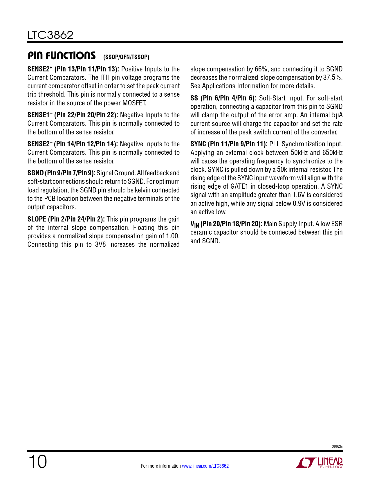 pin FuncTions (SSOP/QFN/TSSOP). SENSE2+ (Pin 13/Pin 11/Pin 13):. SS (Pin 6/Pin 4/Pin 6):. SENSE1– (Pin 22/Pin 20/Pin 22):