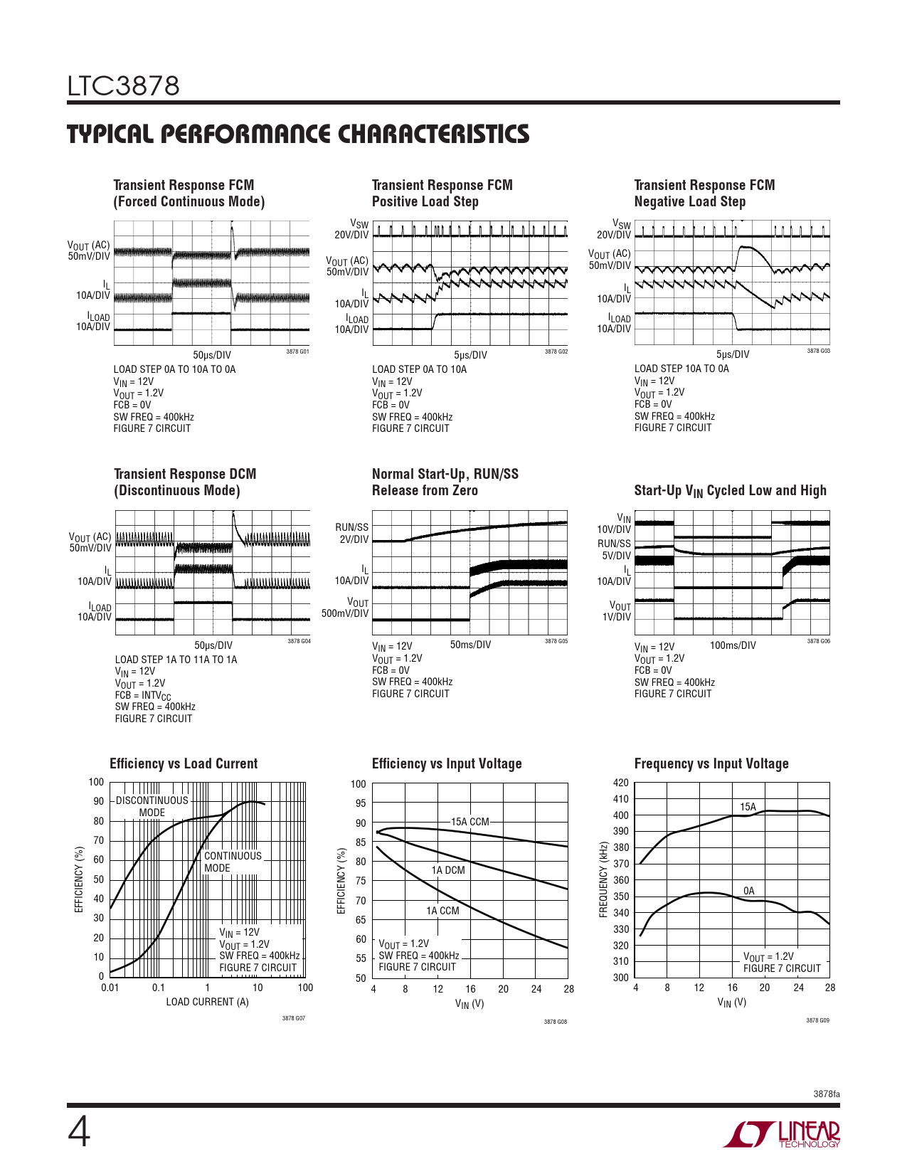 VSW VSW 20V/DIV 20V/DIV VOUT (AC) 50mV/DIV V V OUT (AC) OUT (AC) 50mV/DIV 50mV/DIV IL I 10A/DIV IL L 10A/DIV 10A/DIV ILOAD ILOAD ILOAD 10A/DIV 10A/DIV 10A/DIV 50µs/DIV 3878 G01 5µs/DIV 3878 G02 5µs/DIV 3878 G03 LOAD STEP 0A TO 10A TO 0A LOAD STEP 0A TO 10A LOAD STEP 10A TO 0A VIN = 12V VIN = 12V VIN = 12V VOUT = 1.2V VOUT = 1.2V VOUT = 1.2V FCB = 0V FCB = 0V FCB = 0V SW FREQ = 400kHz SW FREQ = 400kHz SW FREQ = 400kHz FIGURE 7 CIRCUIT FIGURE 7 CIRCUIT FIGURE 7 CIRCUIT