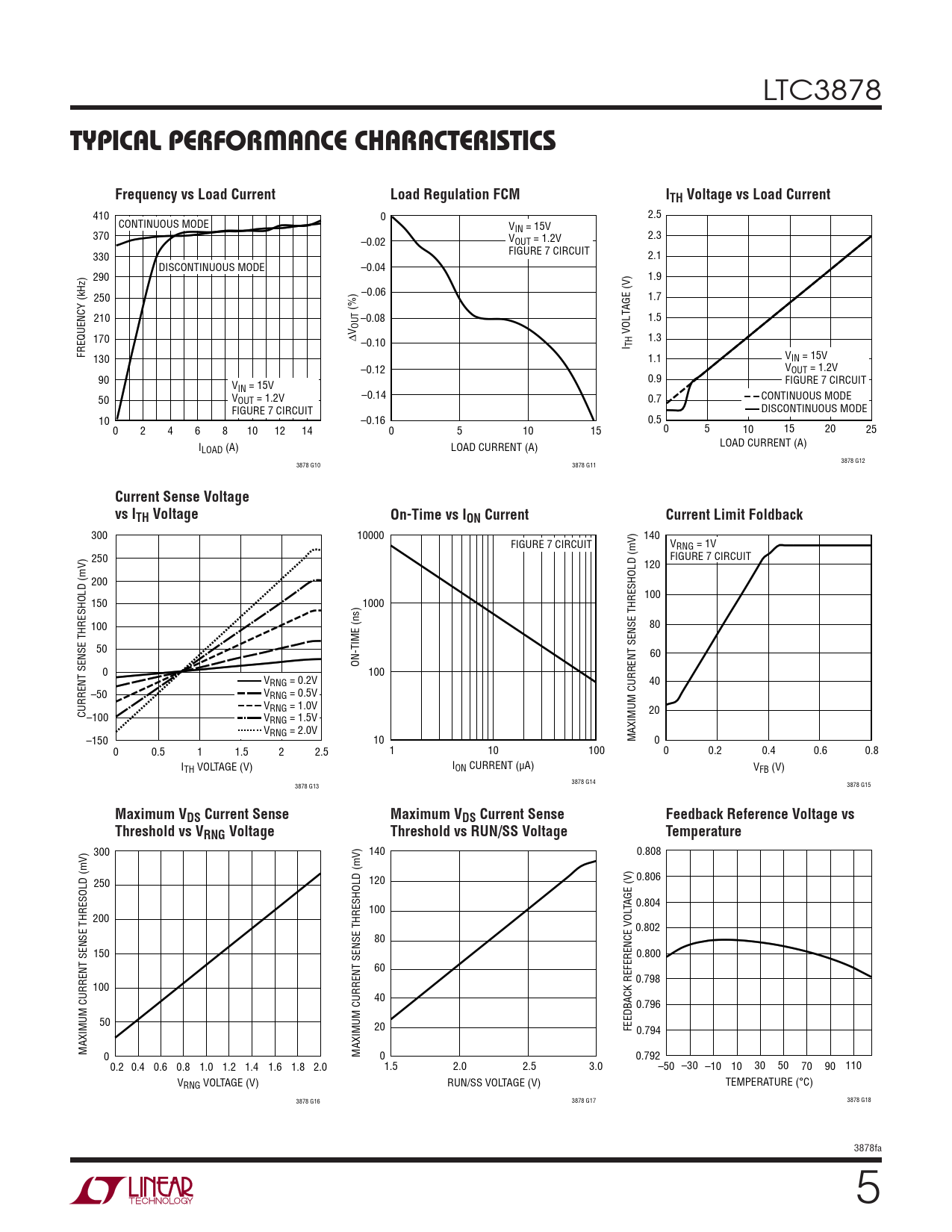 300 10000 140 FIGURE 7 CIRCUIT VRNG = 1V 250 FIGURE 7 CIRCUIT 120 200 100 150 1000 100 80 50 60 ON-TIME (ns) 0 100 VRNG = 0.2V 40 –50 VRNG = 0.5V VRNG = 1.0V 20 CURRENT SENSE THRESHOLD (mV)–100 VRNG = 1.5V VRNG = 2.0V –150 10 MAXIMUM CURRENT SENSE THRESHOLD (mV) 0 0 0.5 1 1.5 2 2.5 1 10 100 0 0.2 0.4 0.6 0.8 I I TH VOLTAGE (V) ON CURRENT (µA) VFB (V) 3878 G14 3878 G13 3878 G15