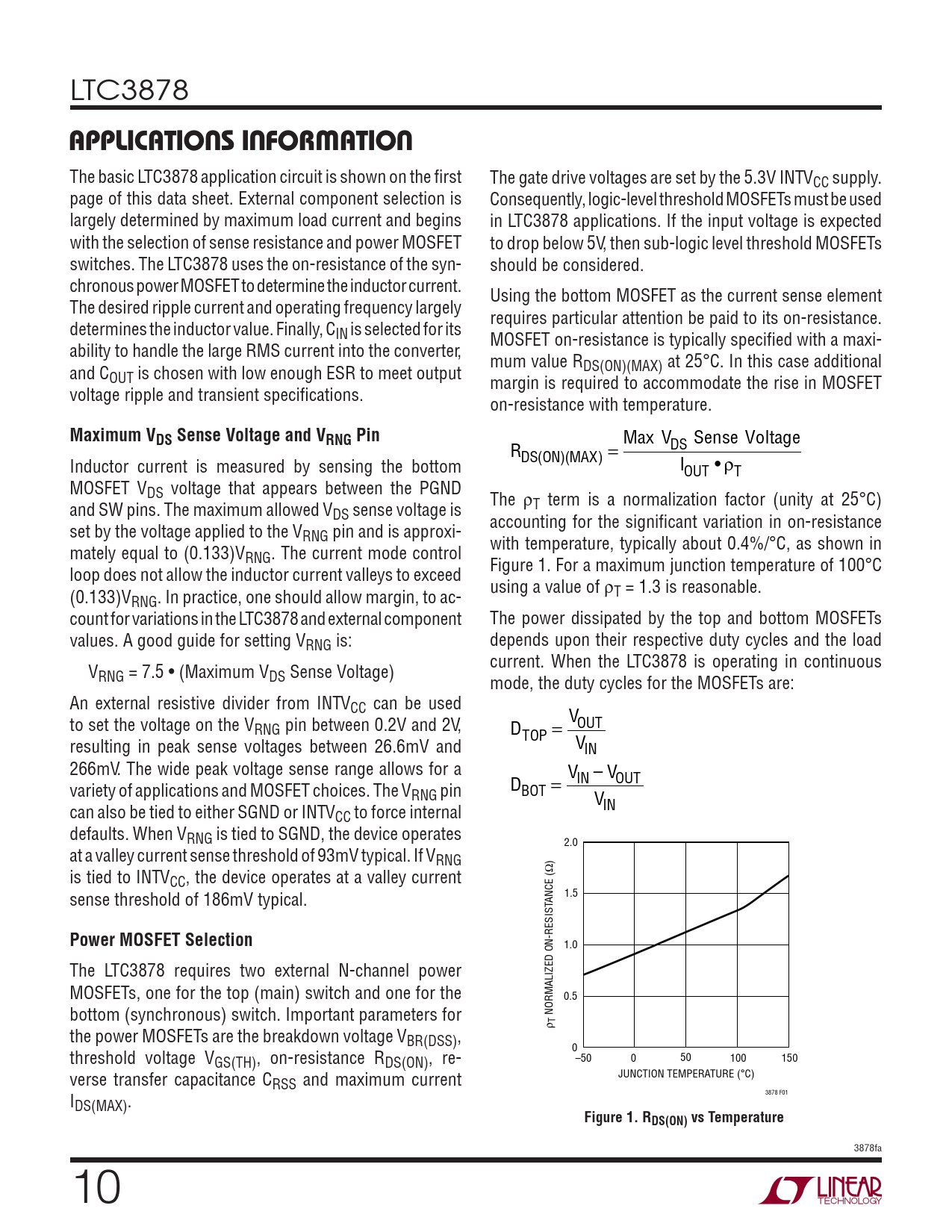 LTC3878 applicaTions inForMaTion The basic LTC3878 application circuit is shown on the first The gate drive voltages are set by the 5.3V INTVCC supply. page of this data sheet. External component selection is Consequently, logic-level threshold MOSFETs must be used largely determined by maximum load current and begins in LTC3878 applications. If the input voltage is expected with the selection of sense resistance and power MOSFET to drop below 5V, then sub-logic level threshold MOSFETs switches. The LTC3878 uses the on-resistance of the syn- should be considered. chronous power MOSFET to determine the inductor current. Using the bottom MOSFET as the current sense element The desired ripple current and operating frequency largely requires particular attention be paid to its on-resistance. determines the inductor value. Final y, CIN is selected for its MOSFET on-resistance is typically specified with a maxi- ability to handle the large RMS current into the converter, mum value R and C DS(ON)(MAX) at 25°C. In this case additional OUT is chosen with low enough ESR to meet output margin is required to accommodate the rise in MOSFET voltage ripple and transient specifications. on-resistance with temperature. Maximum VDS Sense Voltage and VRNG Pin Max V Sense Voltage R DS = Inductor current is measured by sensing the bottom DS O ( N) M ( AX) IOUT • T ρ MOSFET VDS voltage that appears between the PGND and SW pins. The maximum allowed V The ρT term is a normalization factor (unity at 25°C) DS sense voltage is set by the voltage applied to the V accounting for the significant variation in on-resistance RNG pin and is approxi- mately equal to (0.133)V with temperature, typically about 0.4%/°C, as shown in RNG. The current mode control loop does not allow the inductor current valleys to exceed Figure 1. For a maximum junction temperature of 100°C (0.133)V using a value of ρT = 1.3 is reasonable. RNG. In practice, one should allow margin, to ac- count for variations in the LTC3878 and external component The power dissipated by the top and bottom MOSFETs values. A good guide for setting VRNG is: depends upon their respective duty cycles and the load V current. When the LTC3878 is operating in continuous RNG = 7.5 • (Maximum VDS Sense Voltage) mode, the duty cycles for the MOSFETs are: An external resistive divider from INTVCC can be used to set the voltage on the V V RNG pin between 0.2V and 2V, D OUT = resulting in peak sense voltages between 26.6mV and TOP VIN 266mV. The wide peak voltage sense range allows for a V – V IN OUT variety of applications and MOSFET choices. The V D = RNG pin BOT V can also be tied to either SGND or INTV IN CC to force internal defaults. When VRNG is tied to SGND, the device operates 2.0 at a valley current sense threshold of 93mV typical. If VRNG is tied to INTVCC, the device operates at a valley current sense threshold of 186mV typical. ANCE (Ω) 1.5 Power MOSFET Selection 1.0 The LTC3878 requires two external N-channel power MOSFETs, one for the top (main) switch and one for the 0.5 bottom (synchronous) switch. Important parameters for NORMALIZED ON-RESIST the power MOSFETs are the breakdown voltage V R T BR(DSS), threshold voltage V 0 GS(TH), on-resistance RDS(ON), re- –50 0 50 100 150 verse transfer capacitance C JUNCTION TEMPERATURE (°C) RSS and maximum current I 3878 F01 DS(MAX). Figure 1. RDS(ON) vs Temperature 3878fa 0 Document Outline Features Description Applications Typical Application Absolute Maximum Ratings Pin Configuration order information Electrical Characteristics Typical Performance Characteristics Pin Functions Functional Diagram Operation Applications Information Typical Applications Package Description Revision History Typical Application Related Parts
